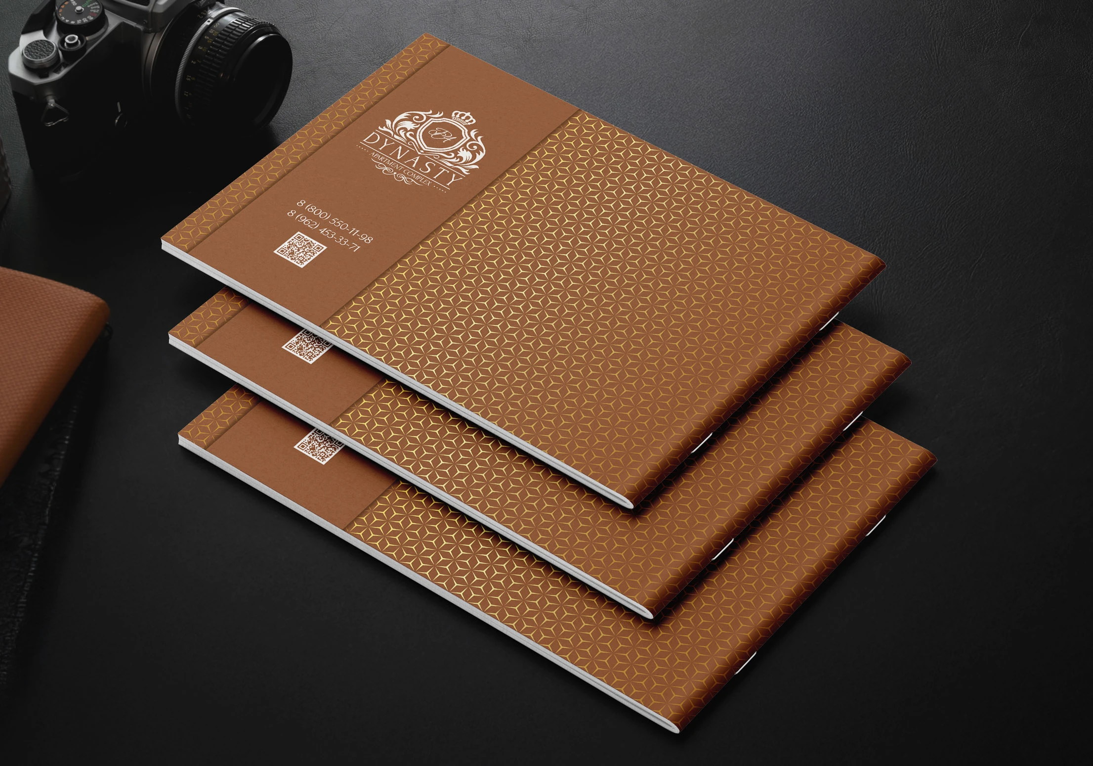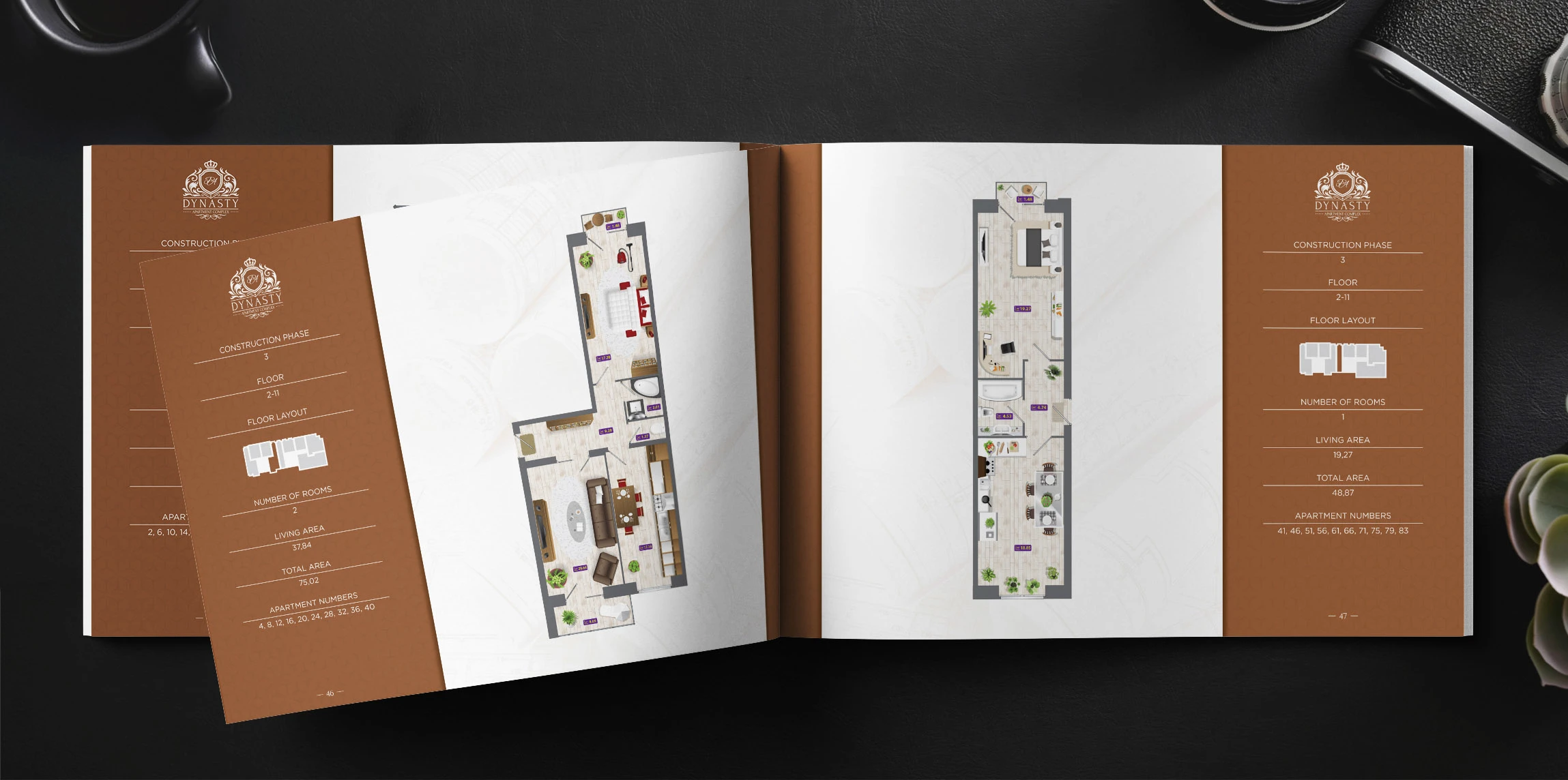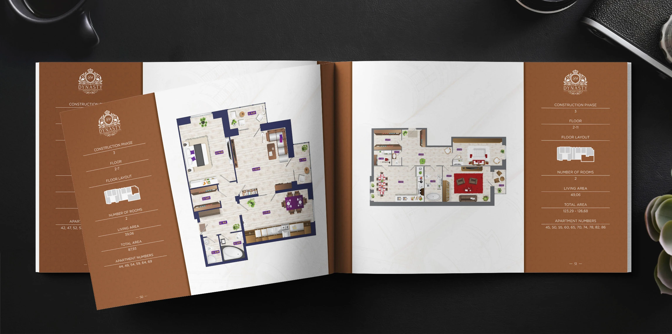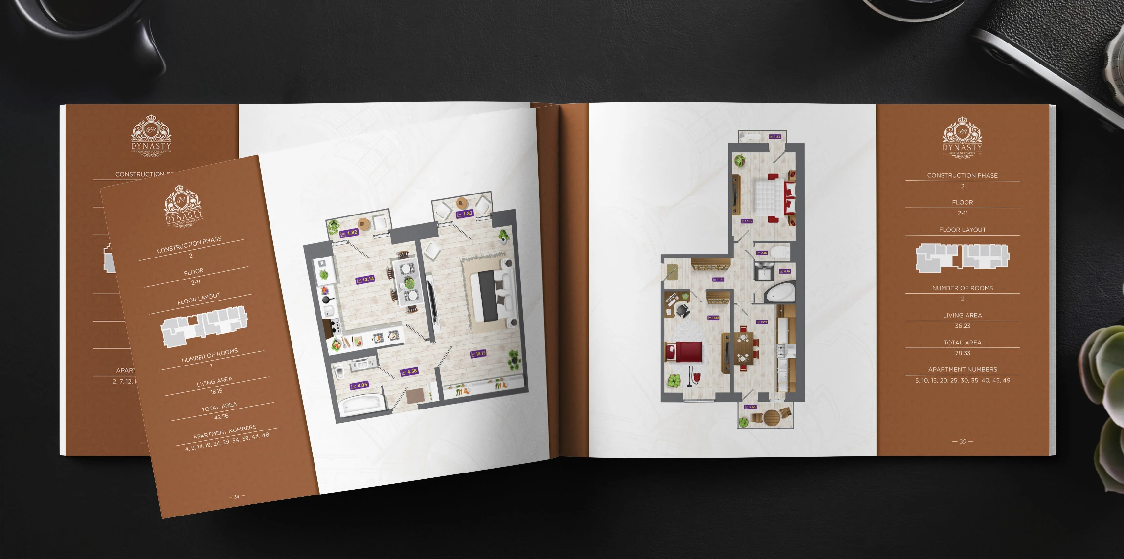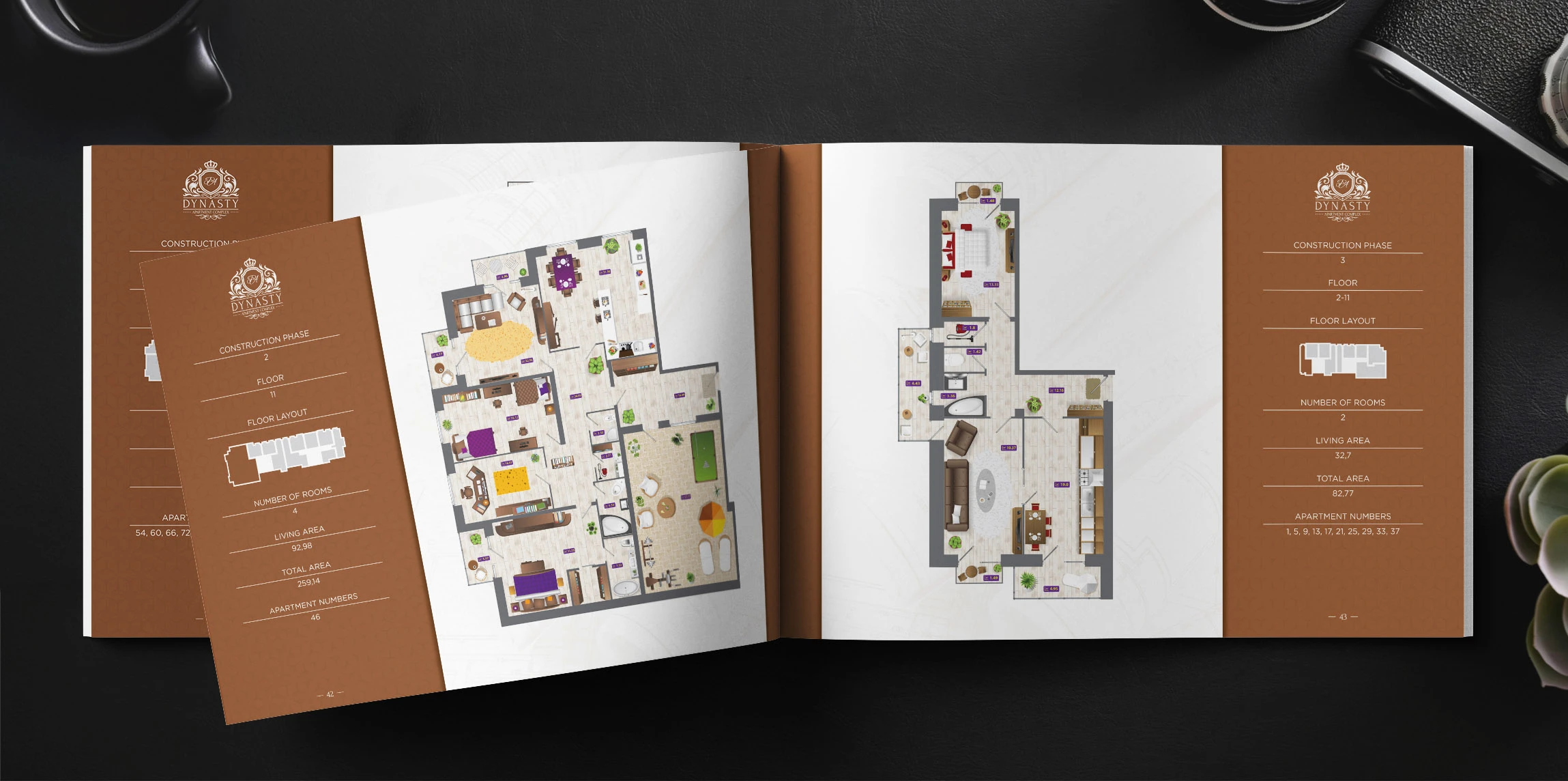 The "Dynasty" apartment complex project began with the creation of a logotype. Next, 3D renders were developed in collaboration with a designer and refined to seamlessly integrate the buildings into the existing landscape. A presentation brochure was then designed, with attention to clean layout and elegant typography.