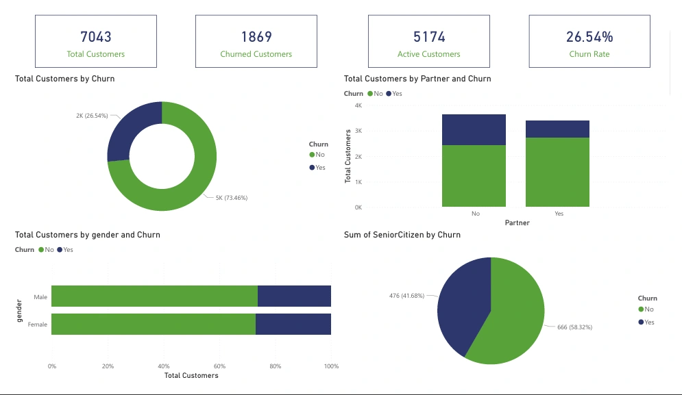 Through interactive visualizations and KPIs, businesses can quickly identify high-risk customers, retention opportunities, and revenue impact of churn.