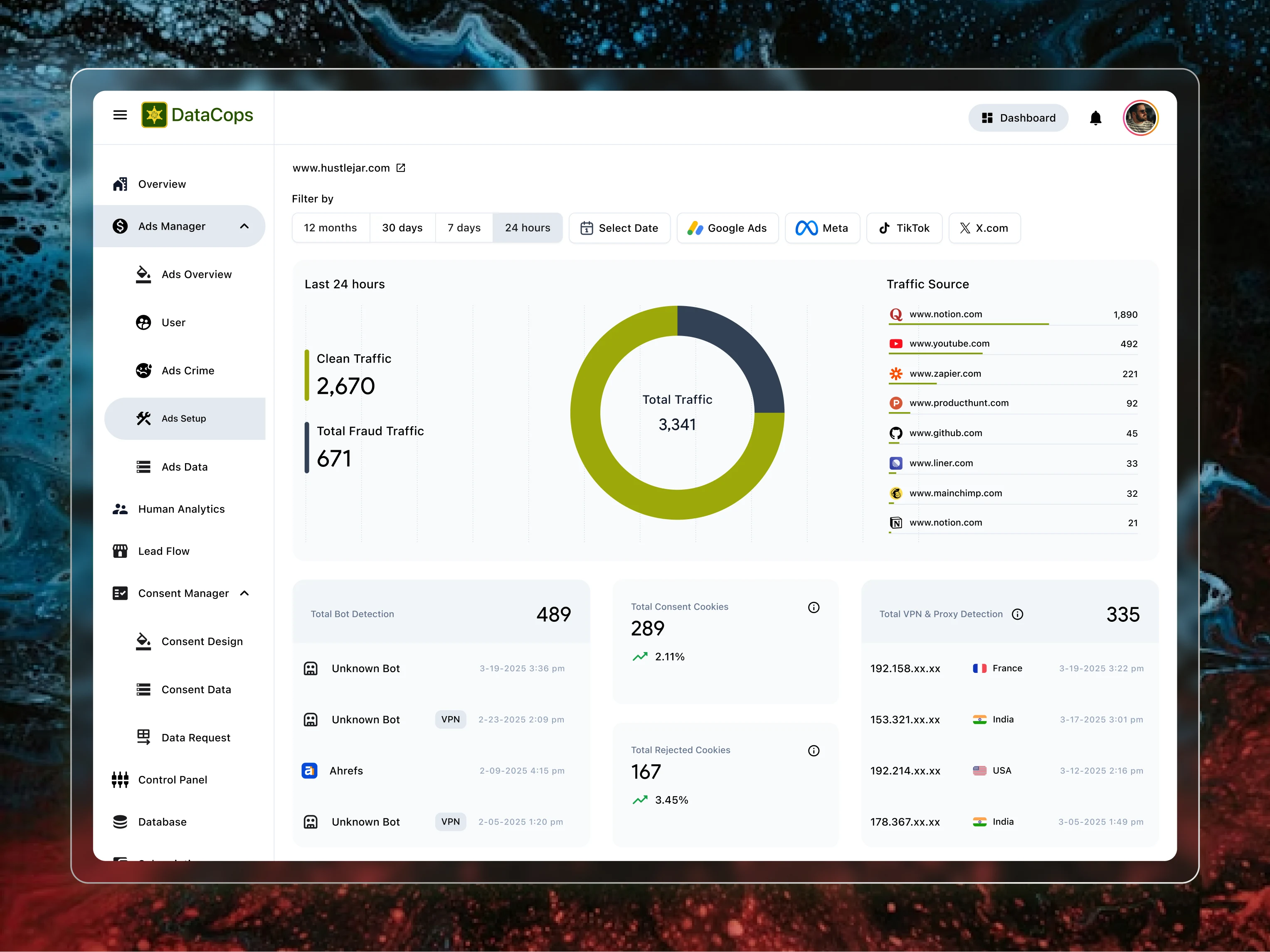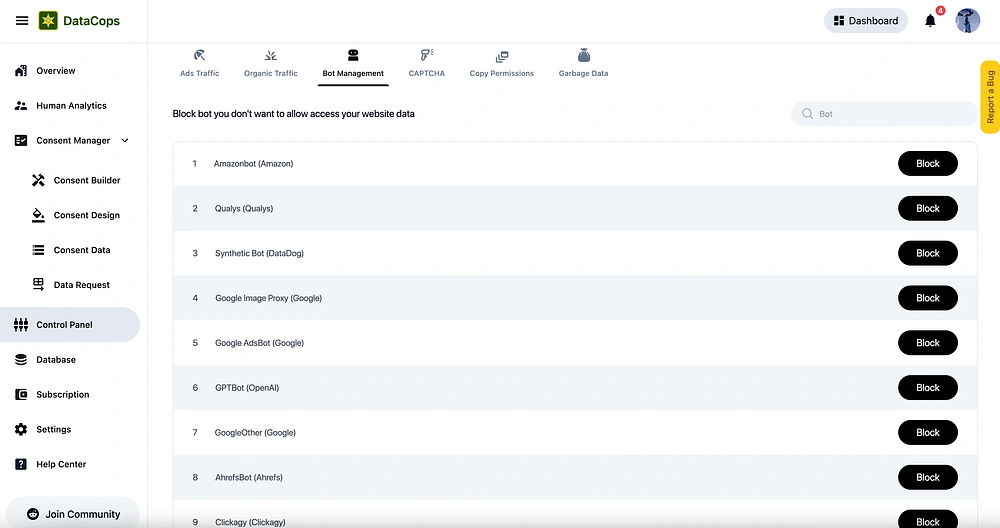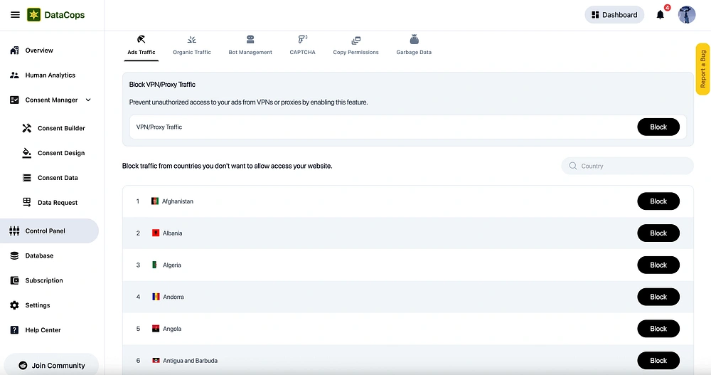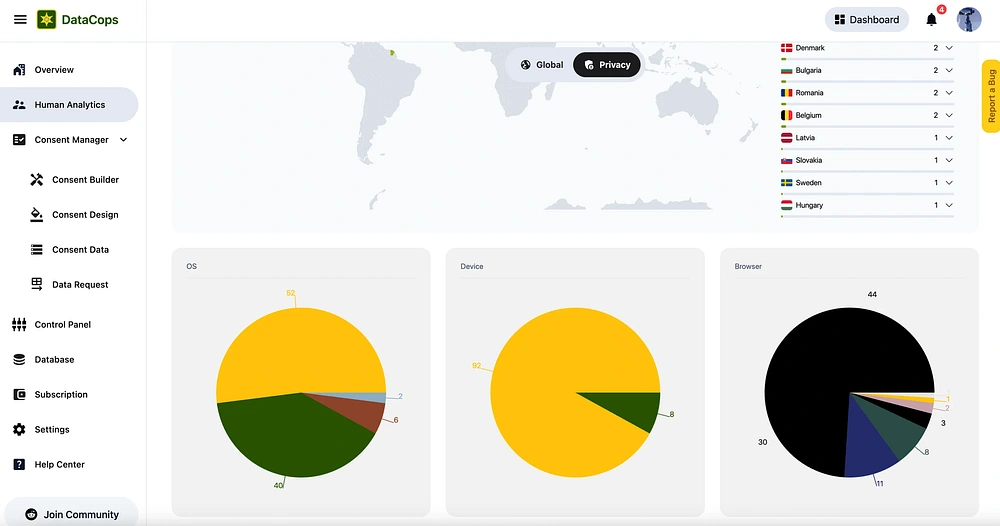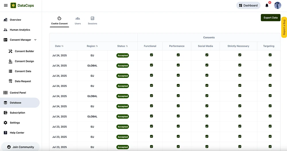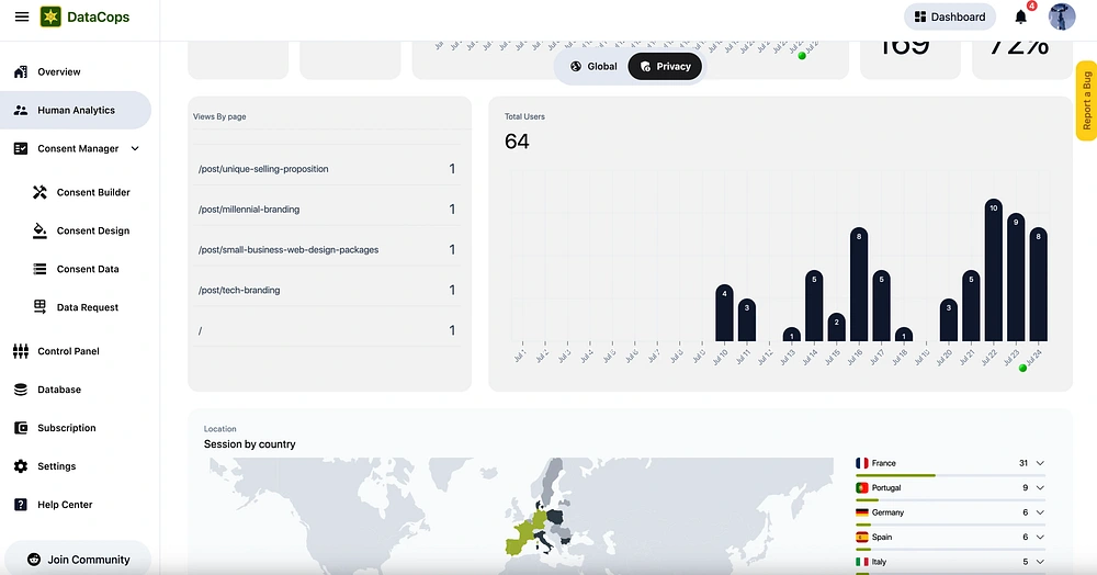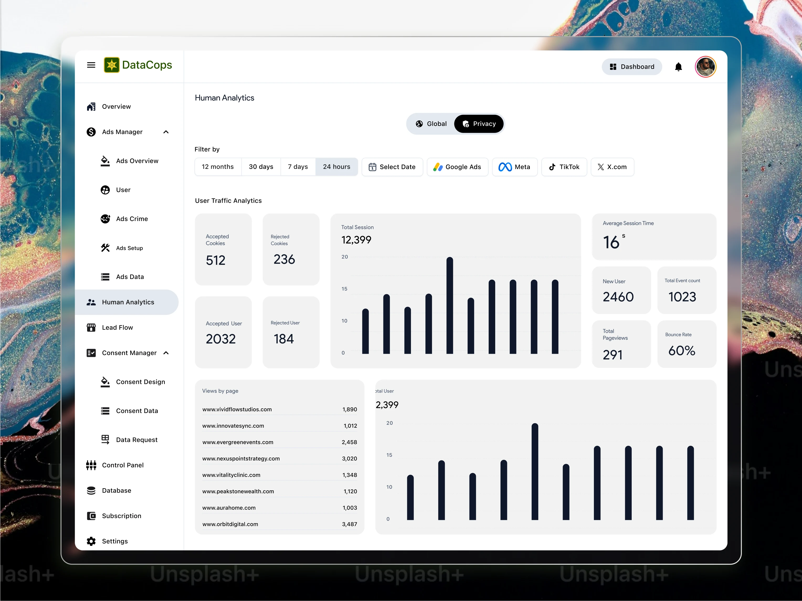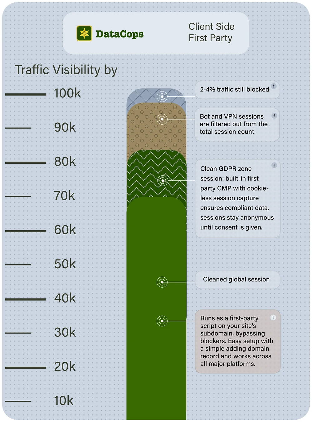 By default, DataCops tracks all website visitors in a cookieless, anonymous mode. This is the crucial first layer. It means we capture 100% of sessions, providing a baseline of essential, privacy-compliant data (like page views, session duration, and traffic sources) without requiring initial consent. This alone solves a major piece of the data-loss puzzle.