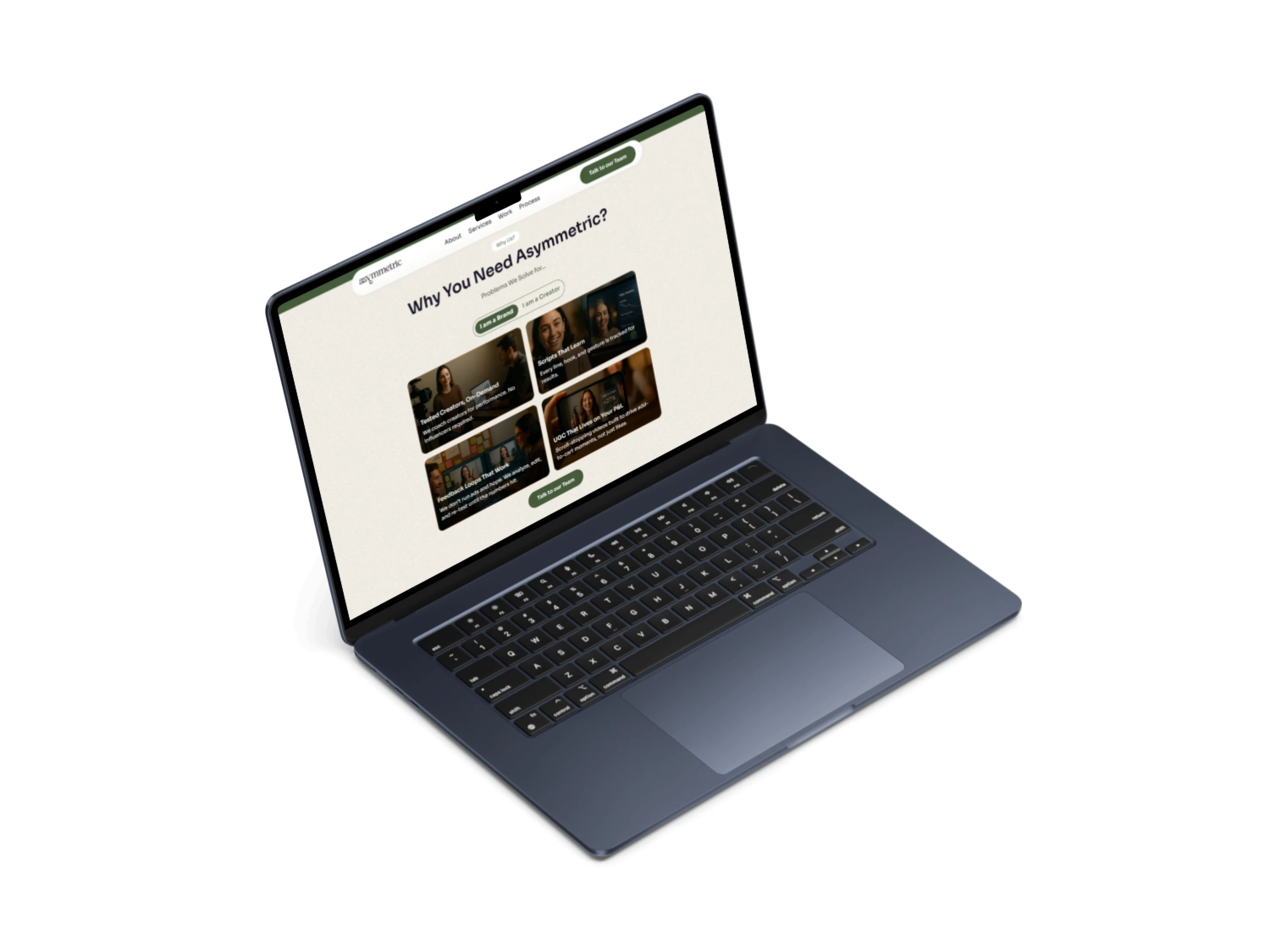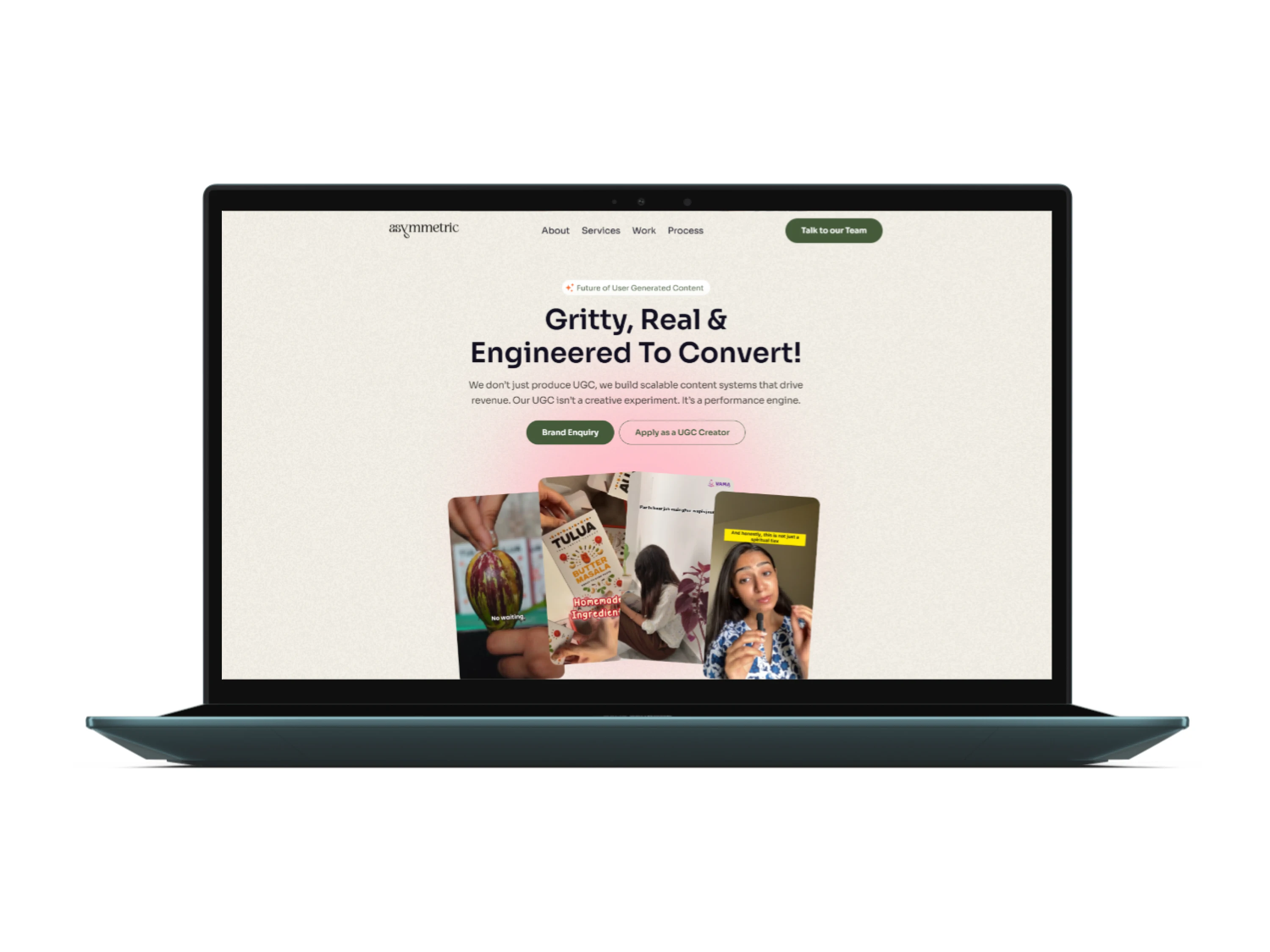 The redesigned website now delivers a stronger, sharper, and more conversion focused brand experience. It highlights Asymmetric’s strengths, simplifies decision making for brands, and gives creators a clear path to apply. The final result is a professional, trustworthy digital presence aligned with their vision of producing high performing UGC at scale.
