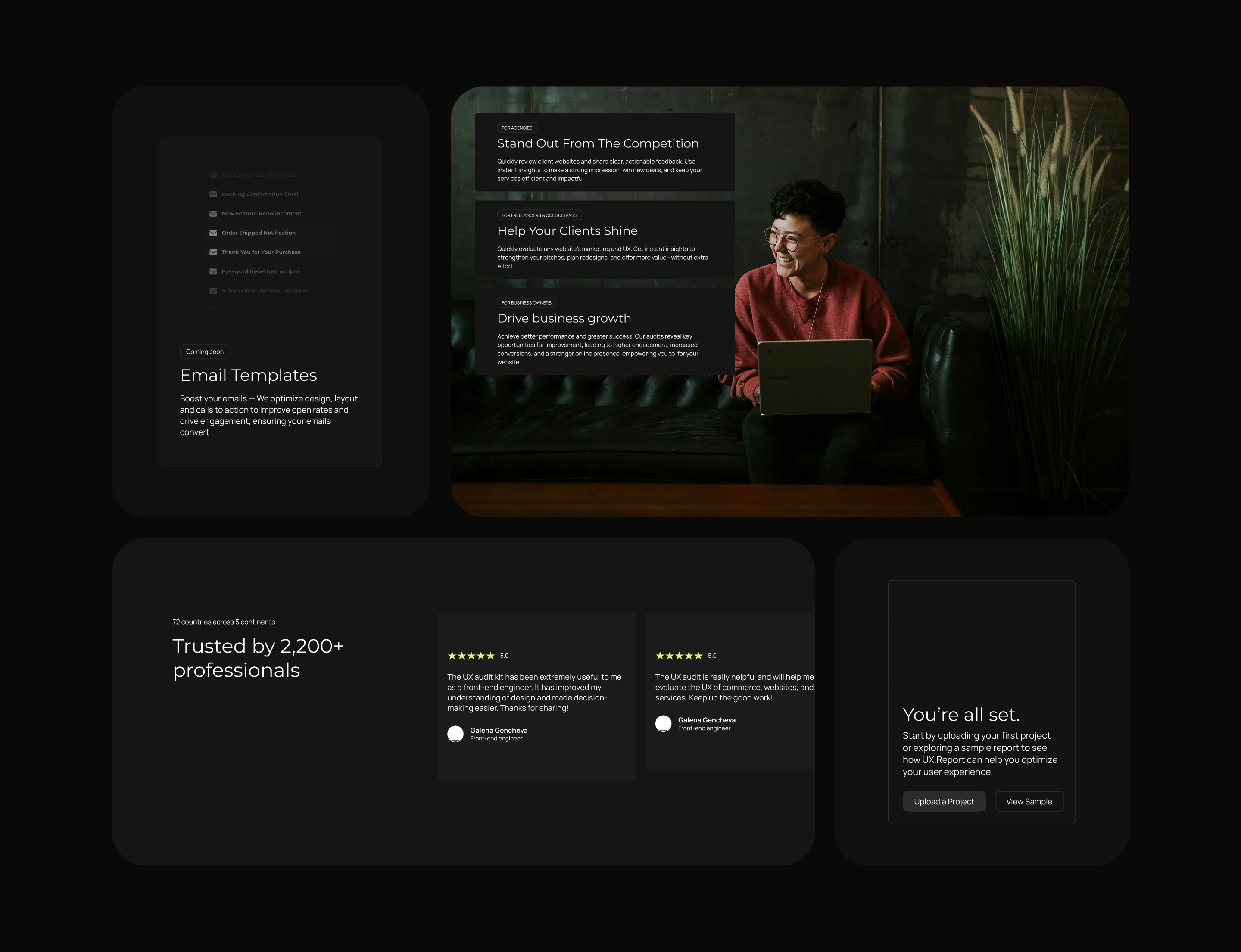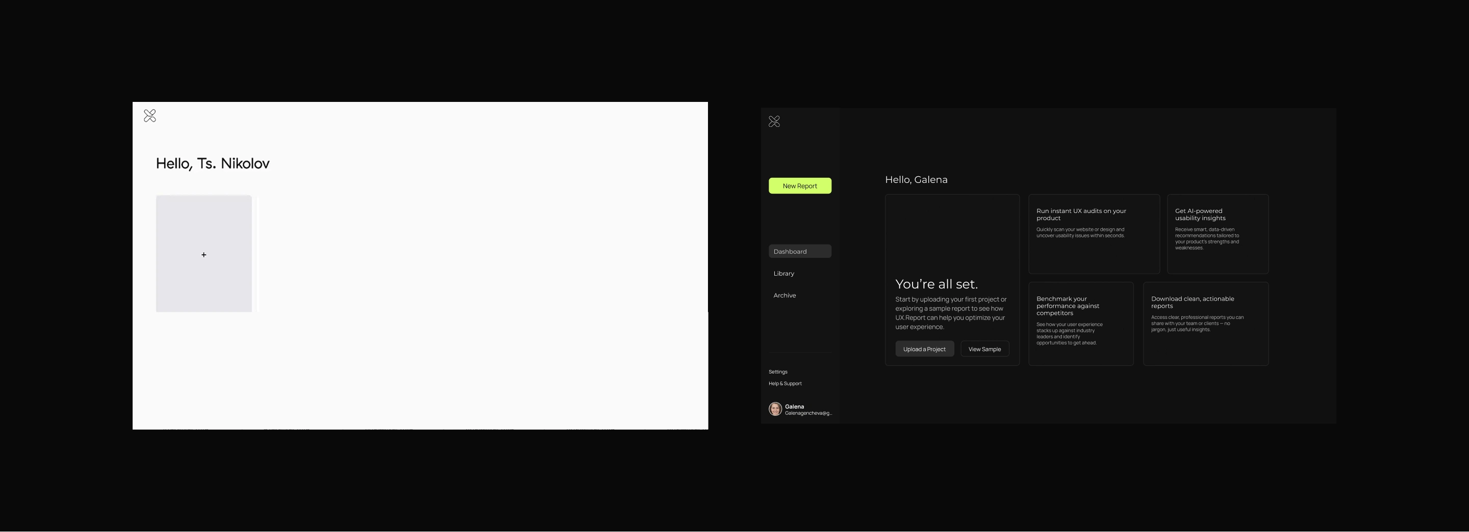I redesigned the unfocused original dashboard into a bento grid layout that clearly communicates UX.Report’s value and guides users to upload a project or explore a sample, boosting early engagement and reducing drop-offs.
