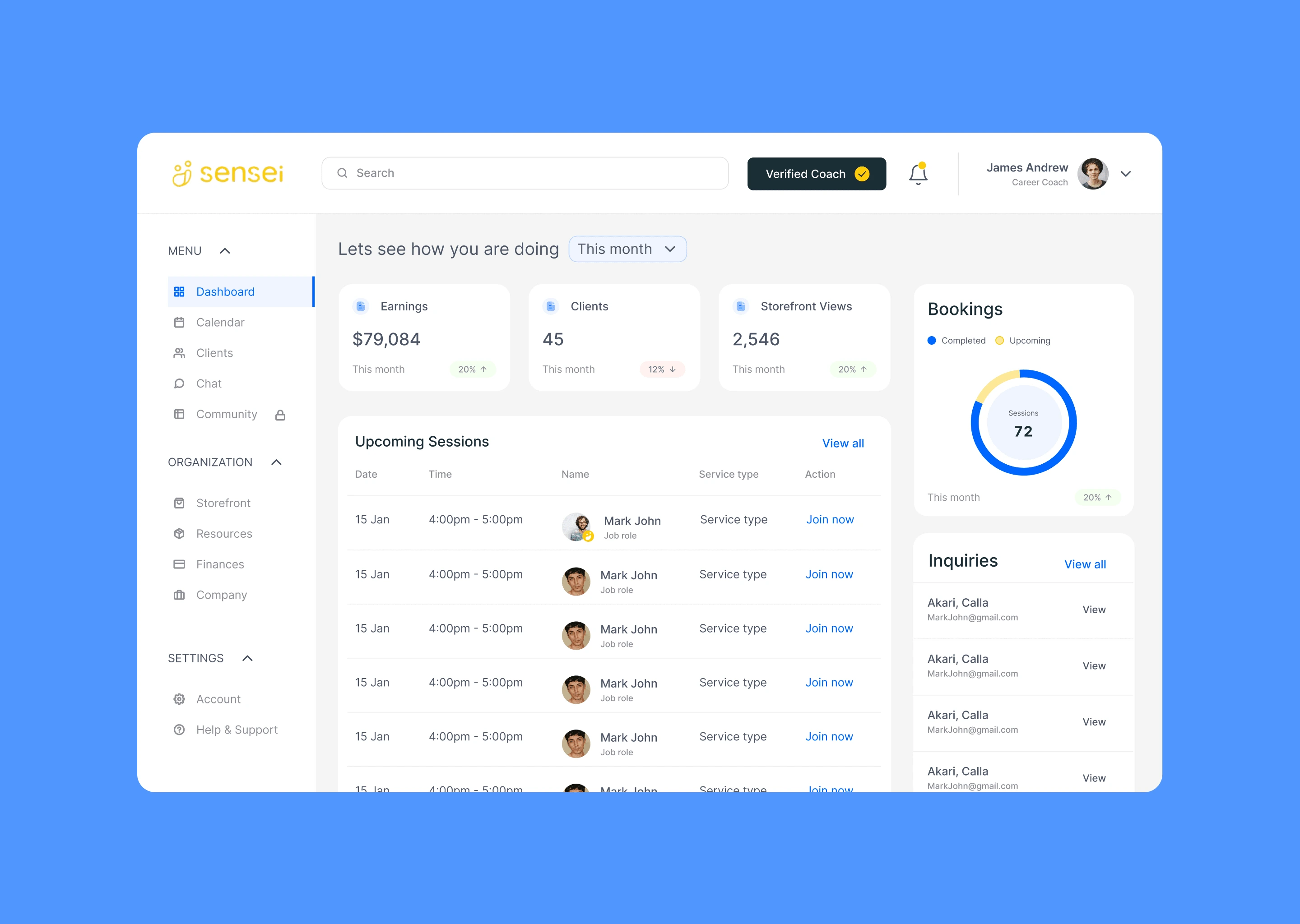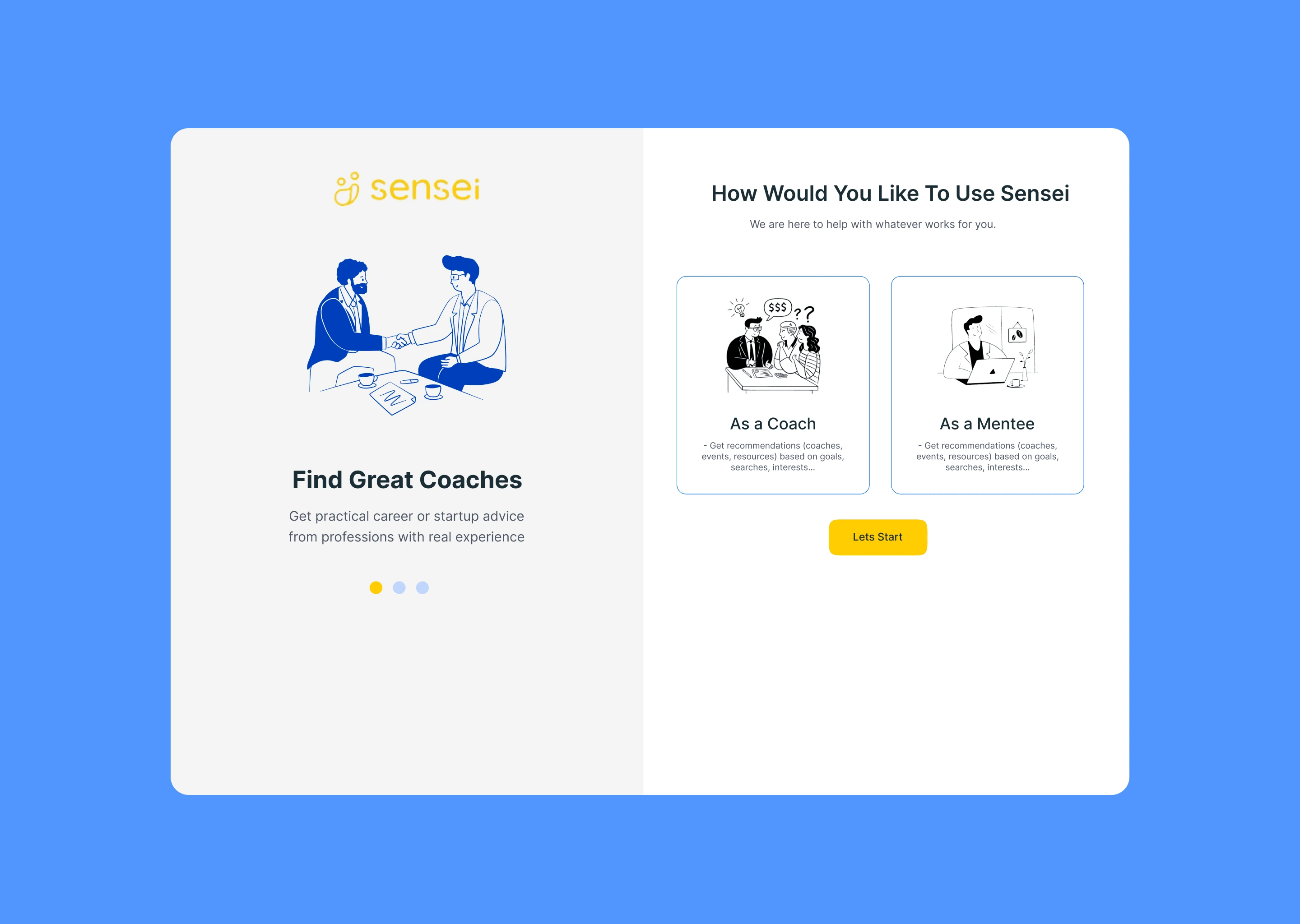 Sensei AI is a coaching platform that connects coaches with individuals seeking personal or professional growth. The platform also allows coaches to organize events, receive payments, and expand their reach to a broader audience. I was responsible for designing the web app with a focus on creating a smooth, intuitive experience for both coaches and clients.