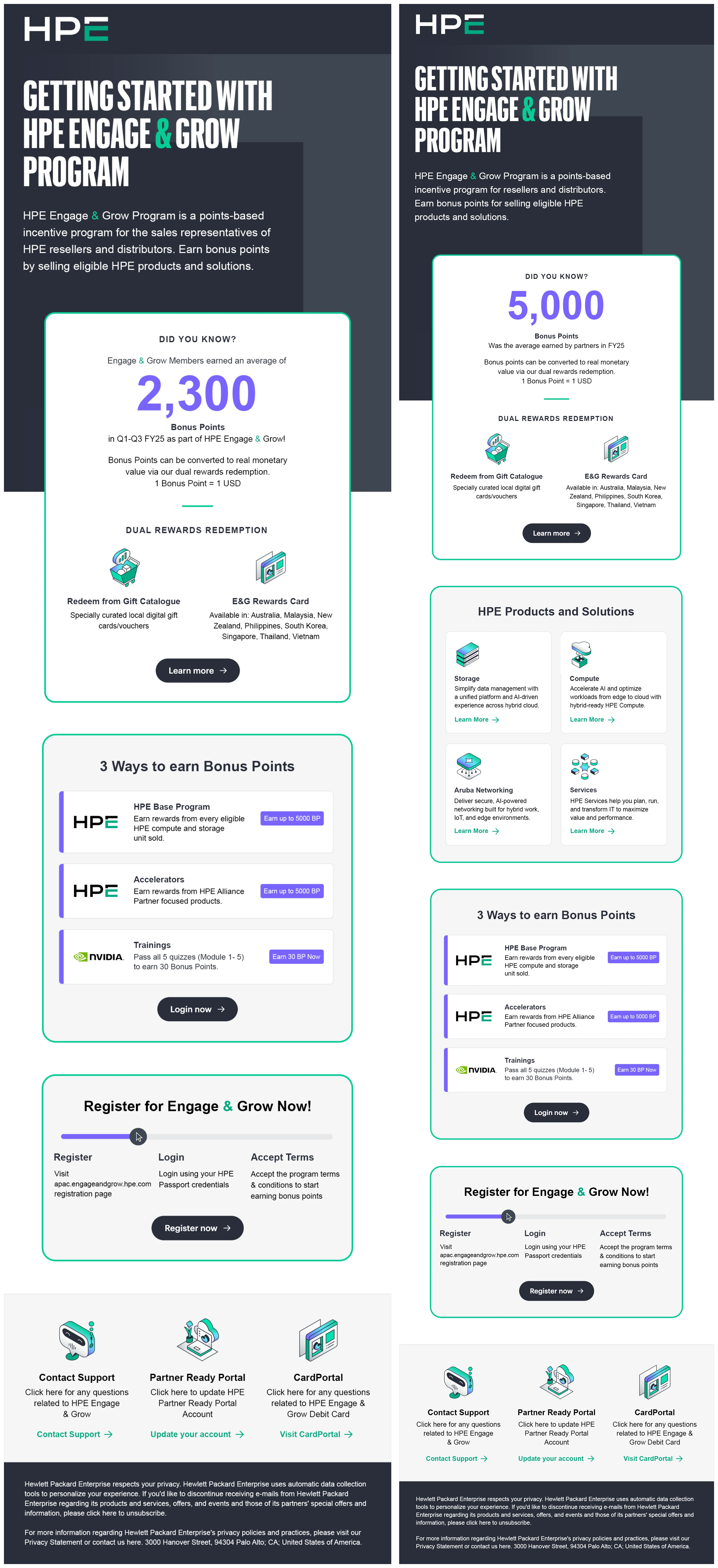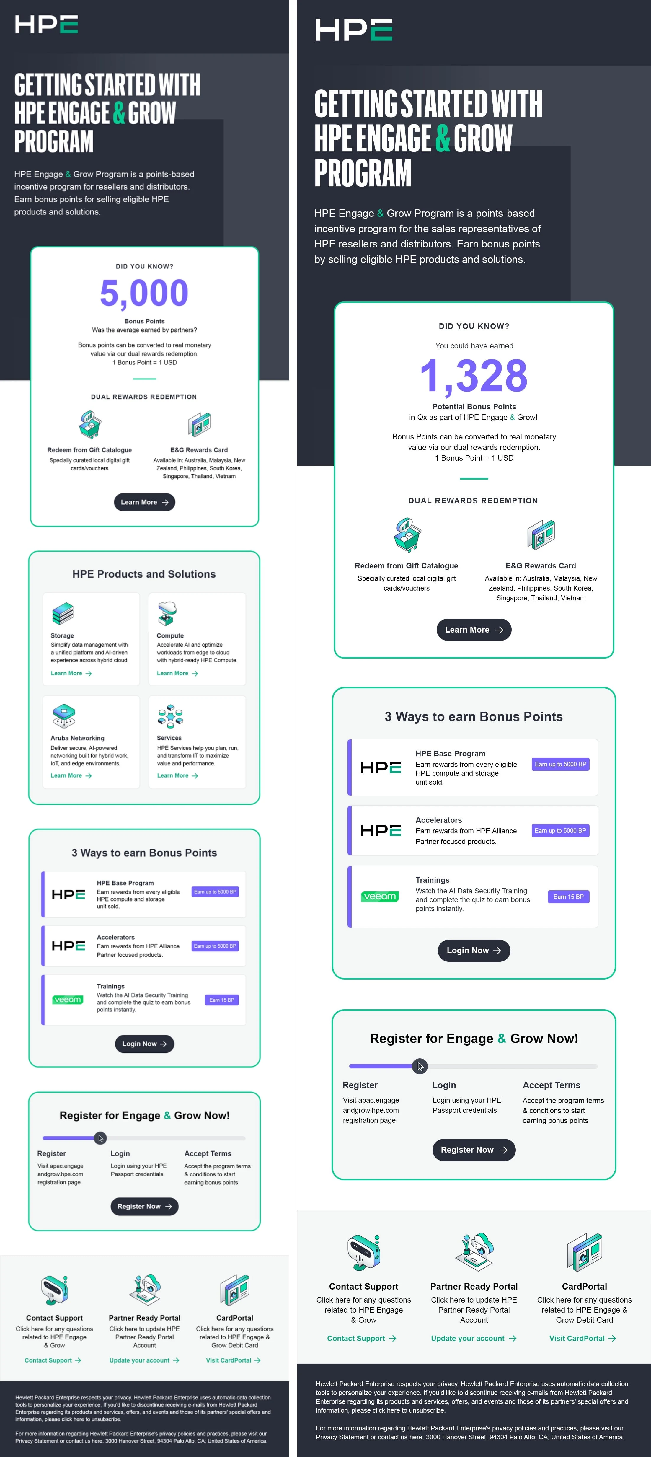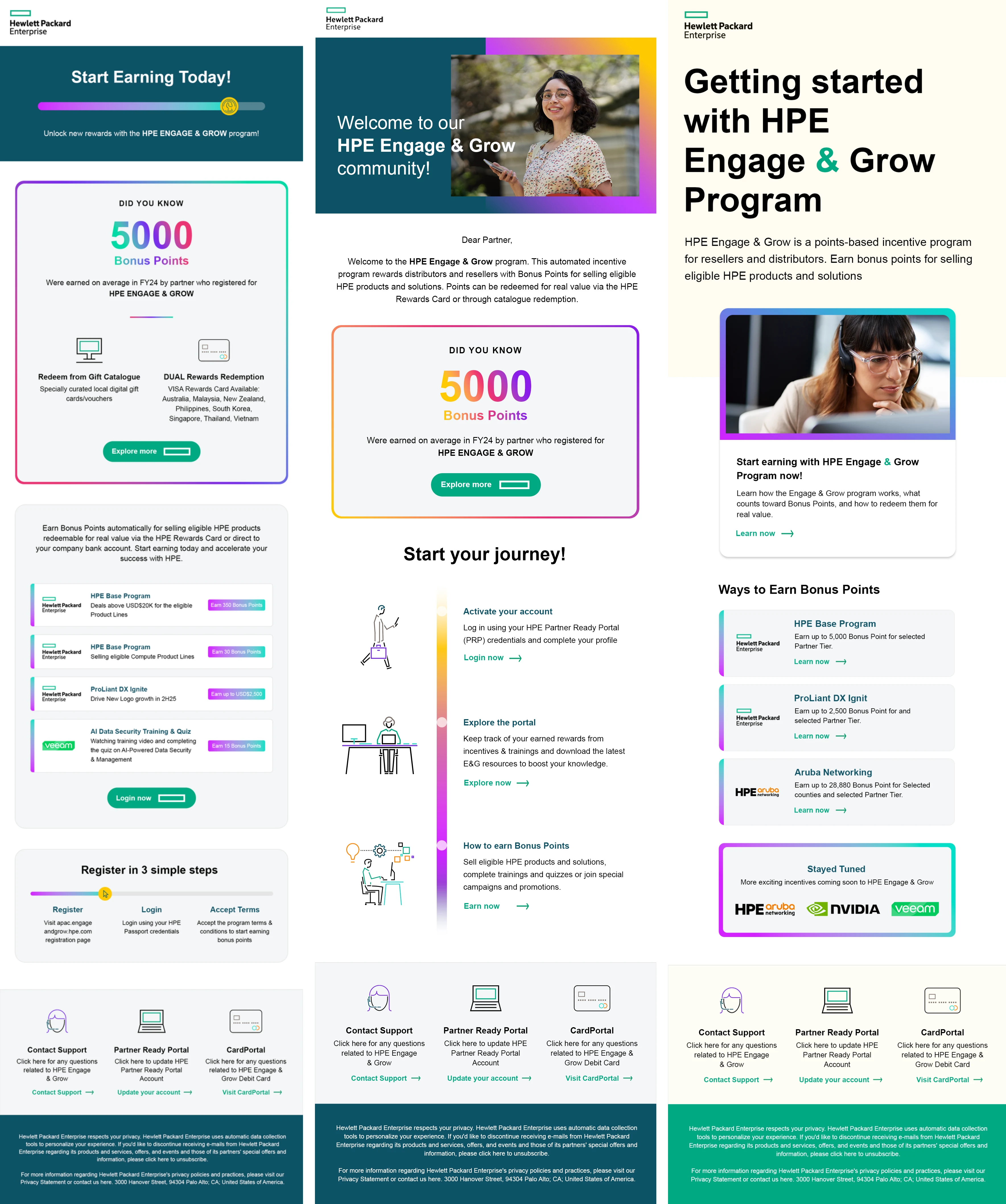 Overview: Designed and developed a structured email journey for HPE partners, guiding new users from onboarding to platform adoption. The project evolved across two phases, an initial rollout using legacy branding and a redesigned version following a corporate rebrand.