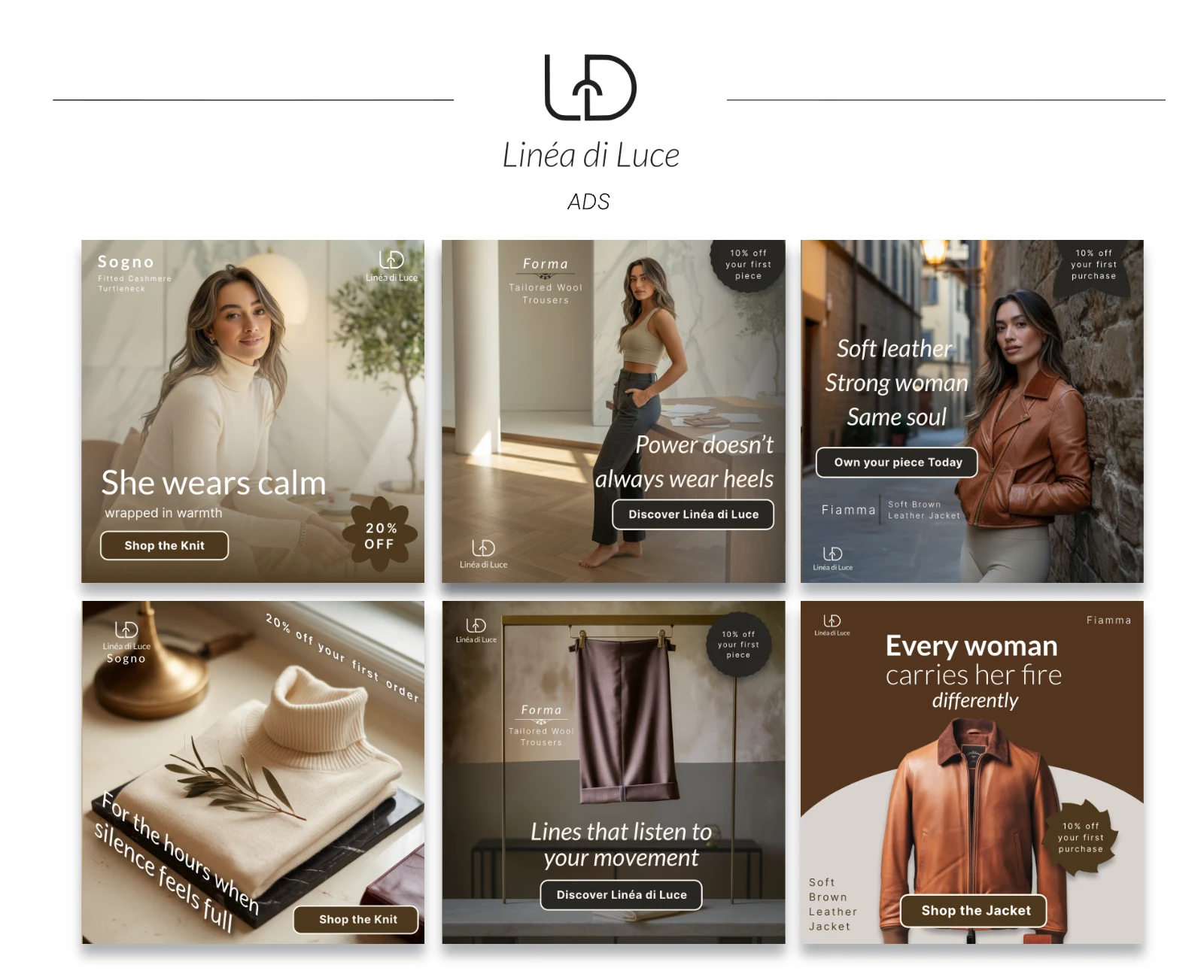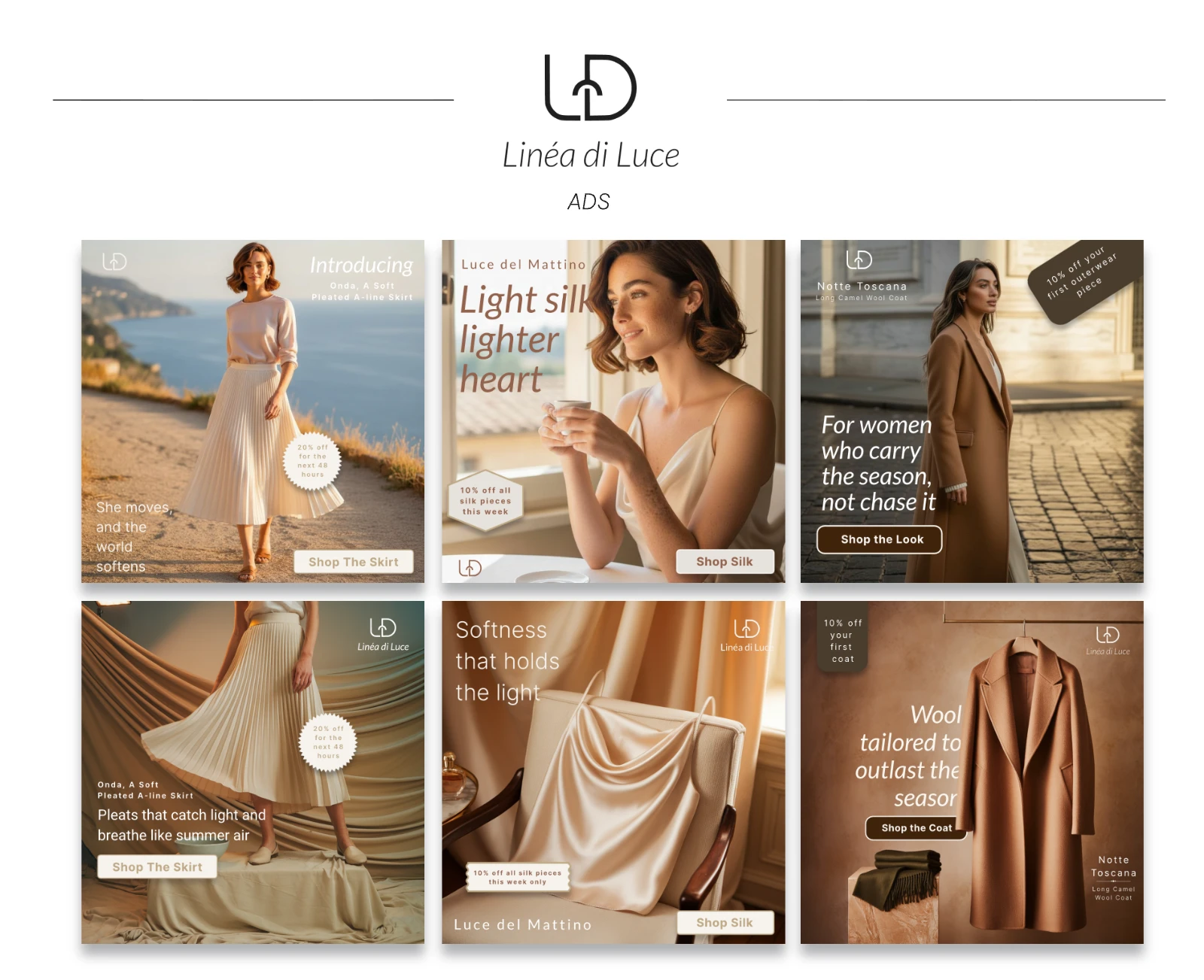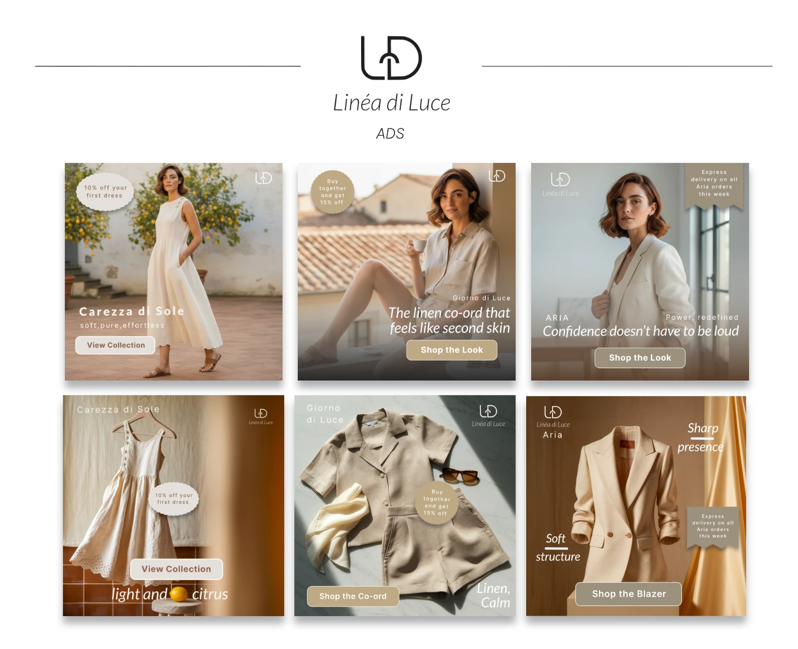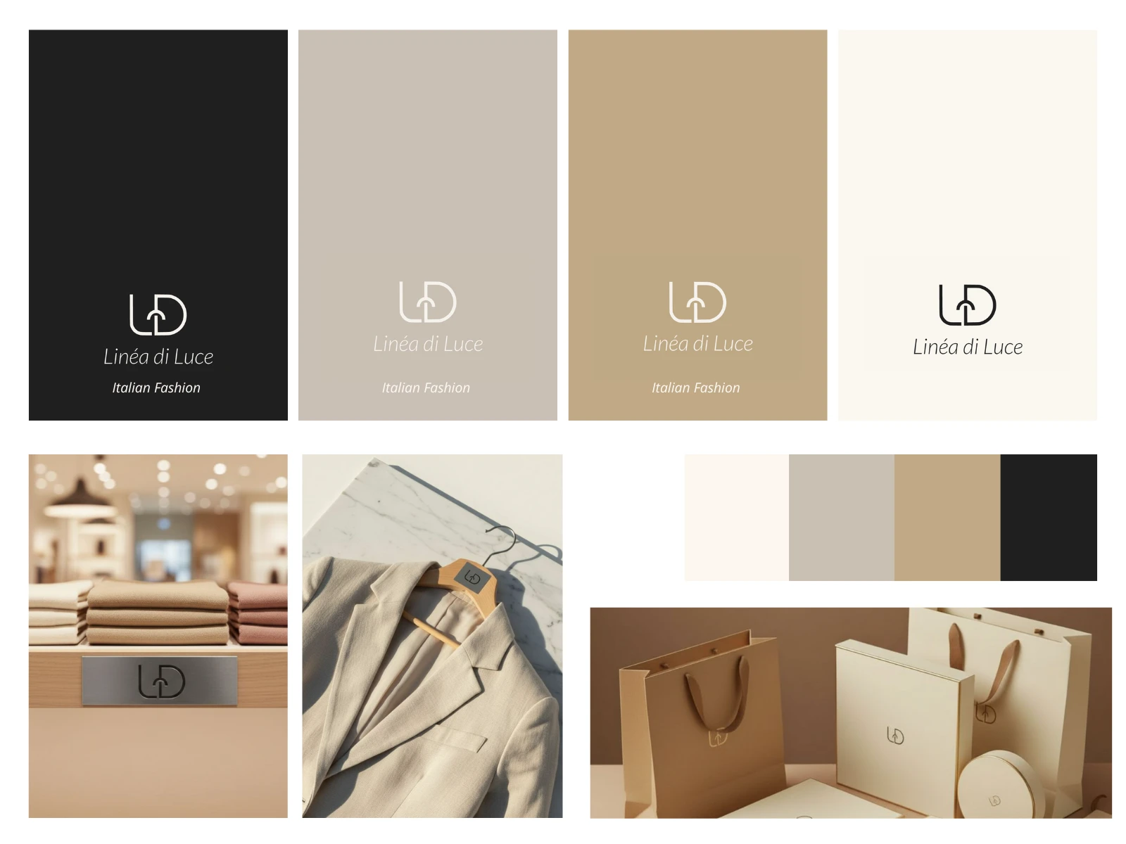 I began with the brand itself. The name means “Line of Light” in Italian and that became our guide for everything we created next. The logo, the colors, the typeface, all were designed to feel calm, timeless, and feminine.