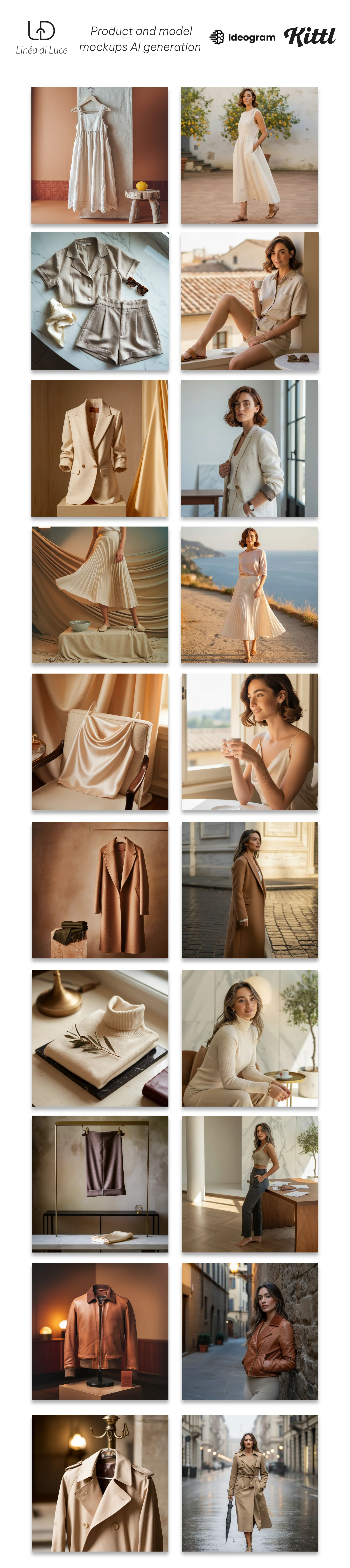 Once the foundation was set, I moved to the products. Using Ideogram, I generated product images that looked like they belonged in a real Italian studio. Coats, jackets, and accessories, all created with care and a consistent mood.