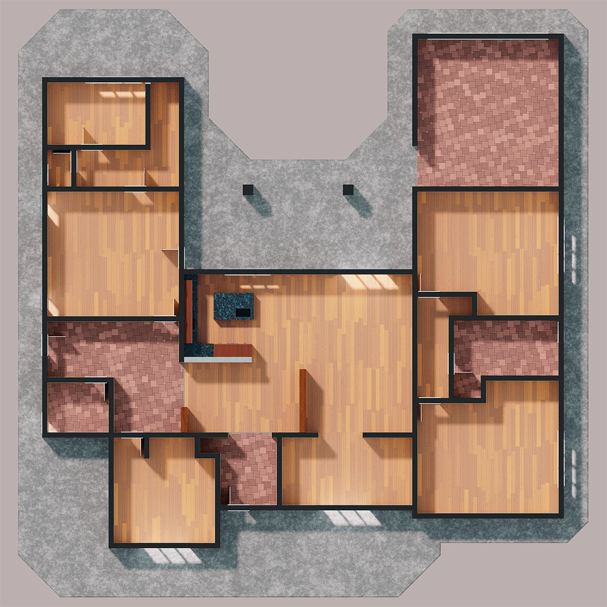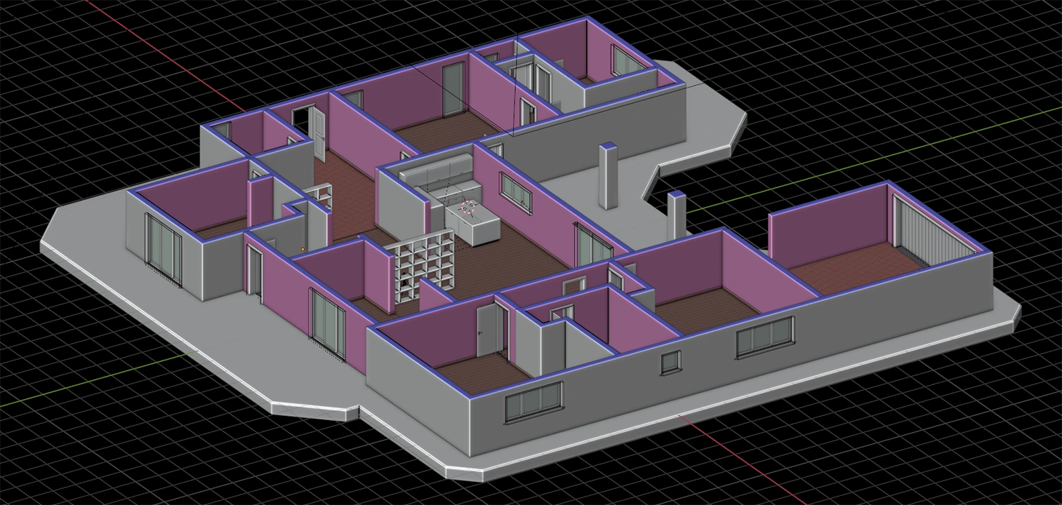 3D model of the layout of a ground floor house for better understanding and layout of the use of its space.