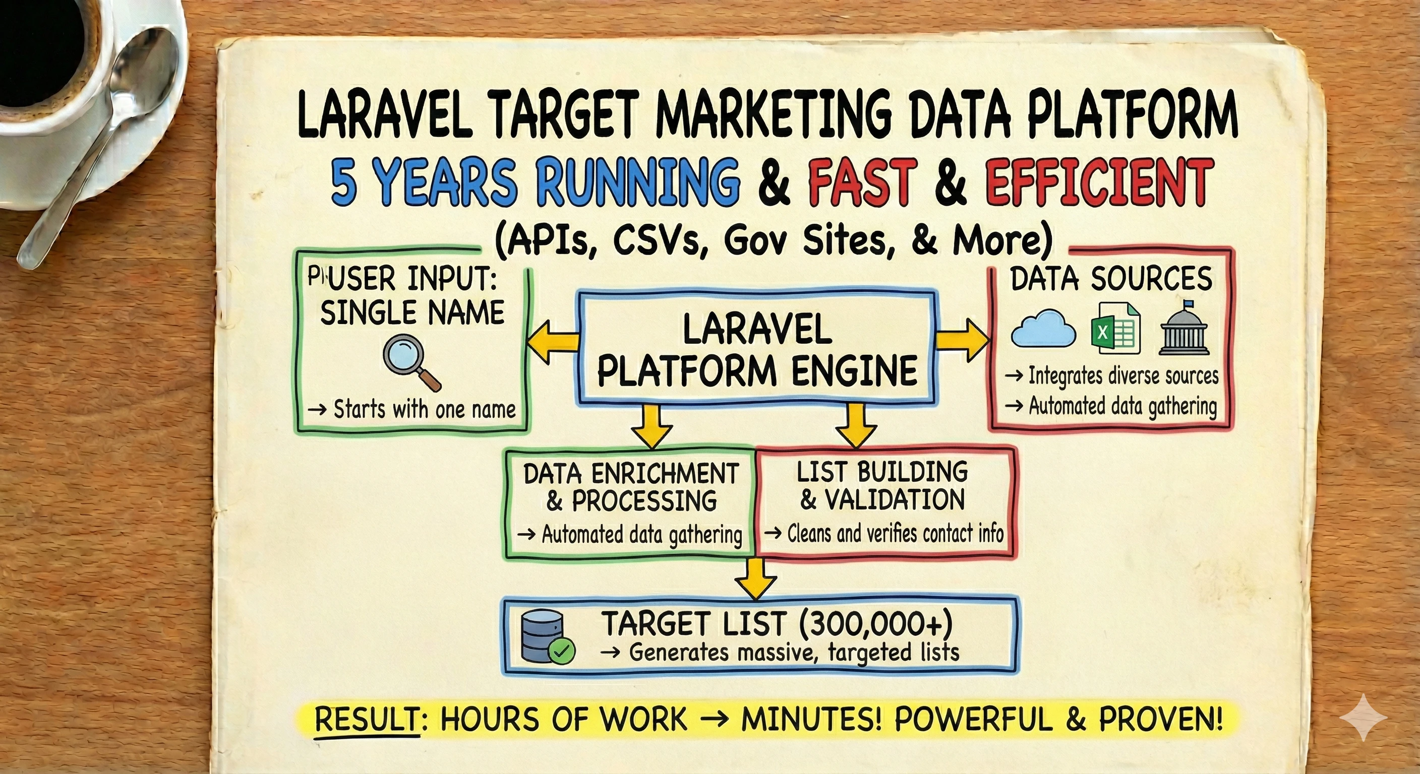 Laravel platform that builds 300K+ target lists from a single name — aggregates APIs, CSVs, gov sites automatically. Hours of work → minutes. Running 5 years