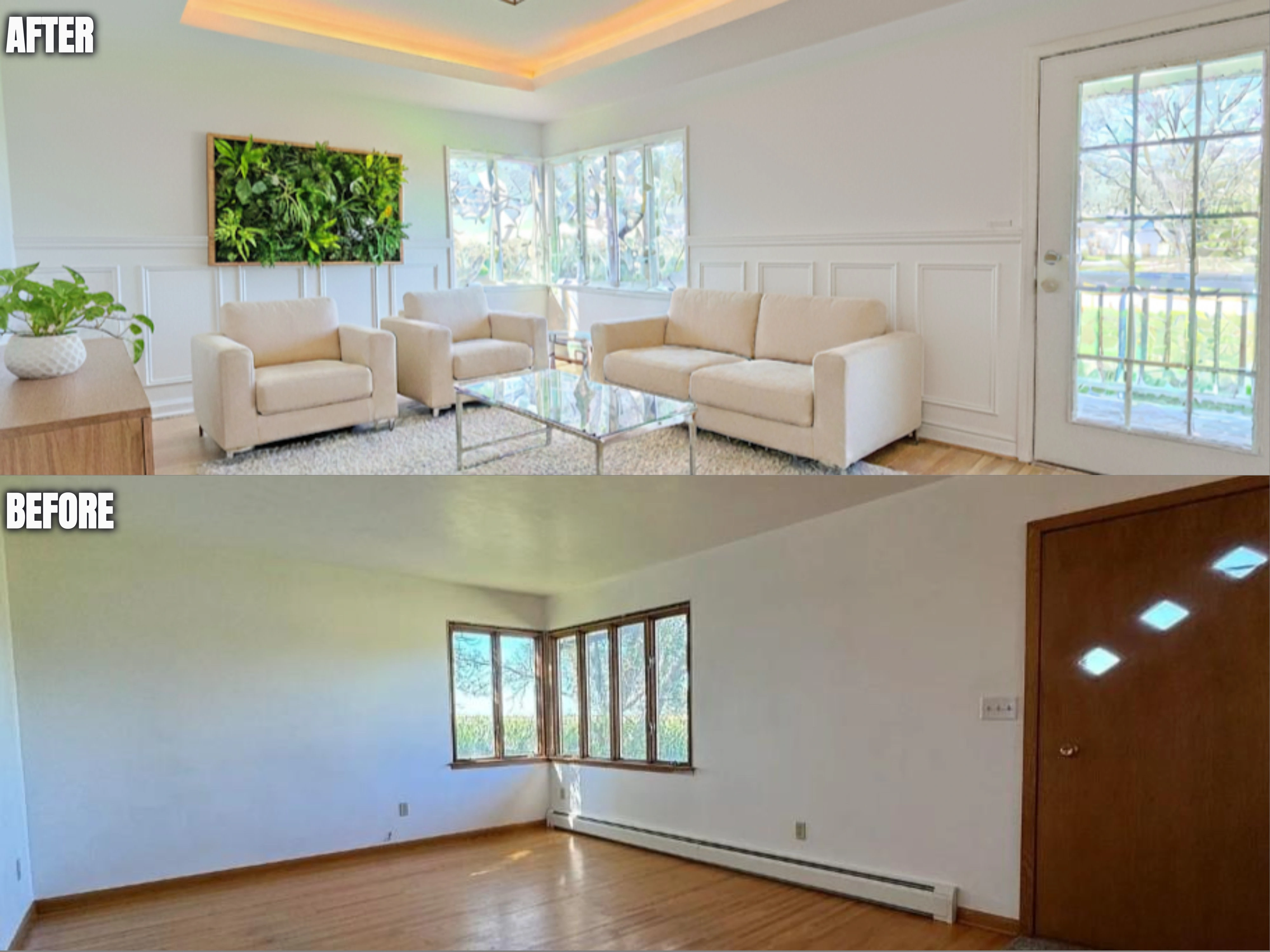 The Vision: This project goes beyond simple virtual staging; it's a Virtual Renovation. The vision was to infuse the space with high-end architectural details to create a sense of bespoke luxury. We digitally added elegant wainscoting, a sophisticated tray ceiling with warm cove lighting, and replaced the dated front door to flood the room with natural light.