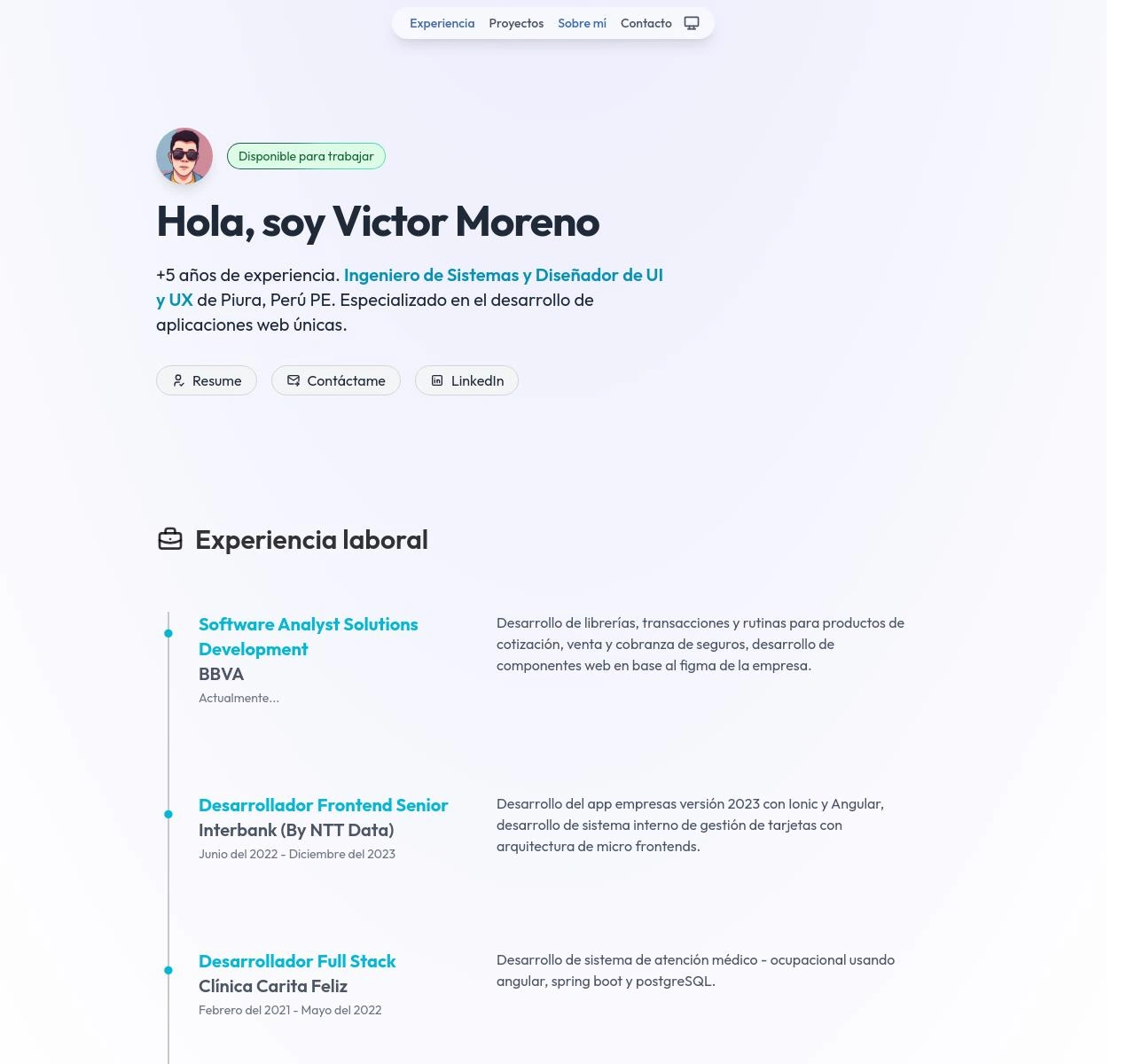 Portafolio personal con diseño limpio y responsivo para mostrar mi experiencia como Frontend Engineer, especializado en Angular y desarrollo de interfaces.