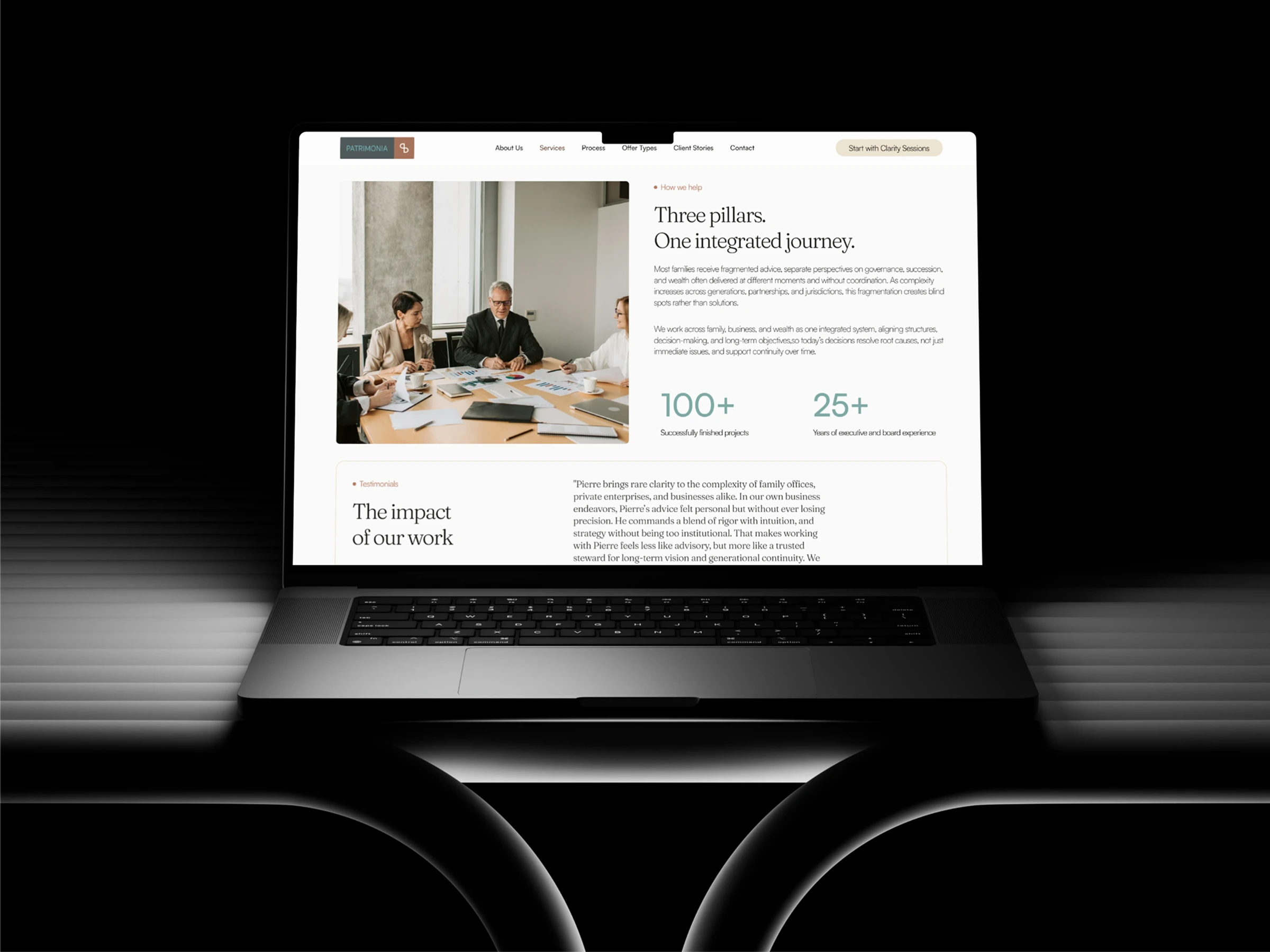 Patrimonia supports family-owned businesses in succession planning, governance structuring, and wealth organization. The challenge was to translate complex advisory services into a clear, structured, and trustworthy digital presence.