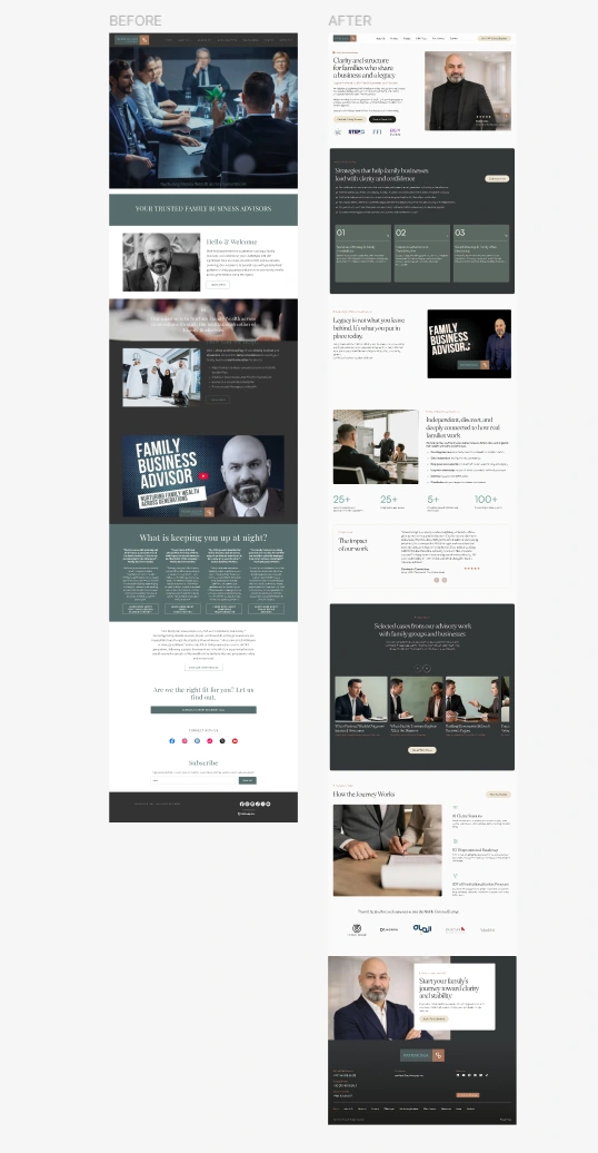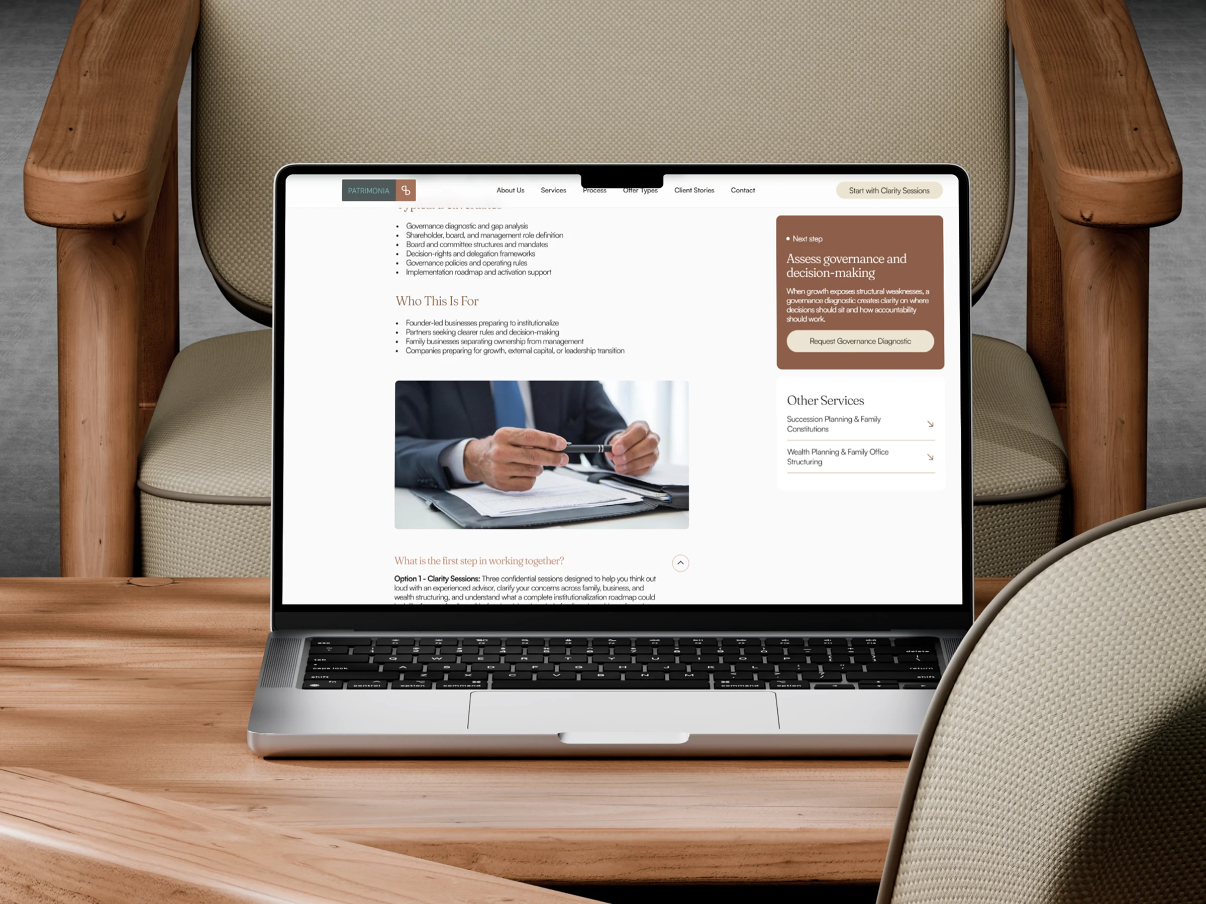 We began with client interviews, analysis of target audience expectations, and competitive research within the family advisory and governance sector.