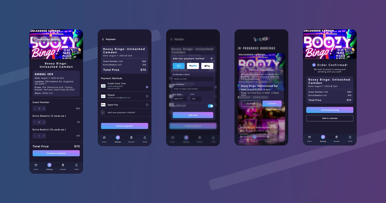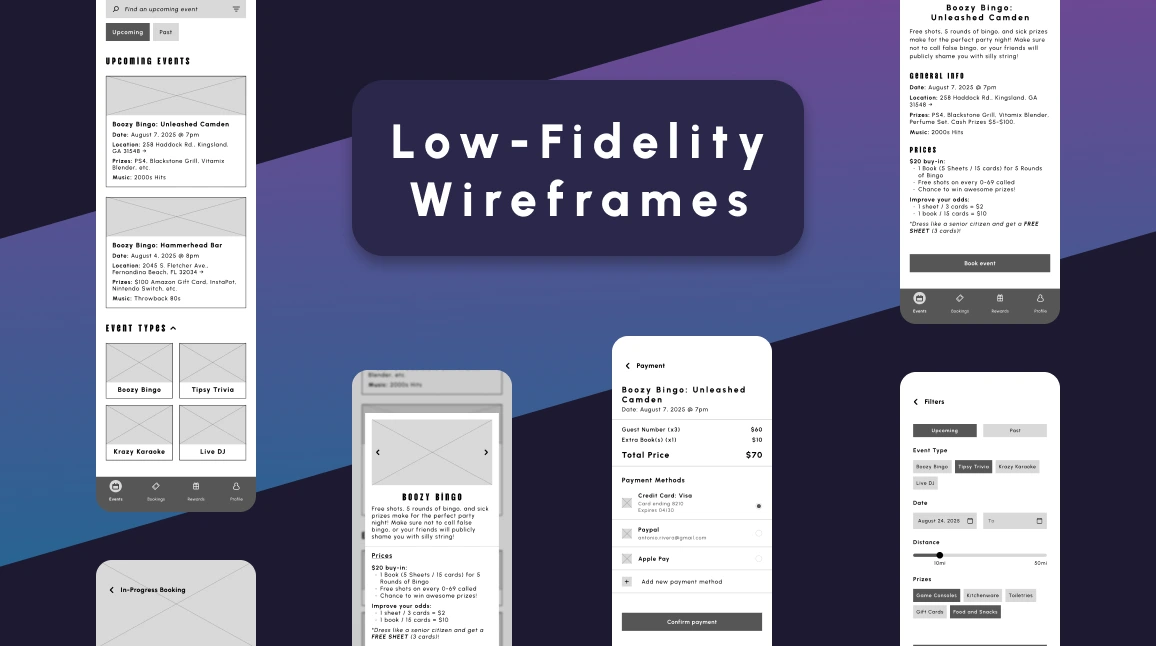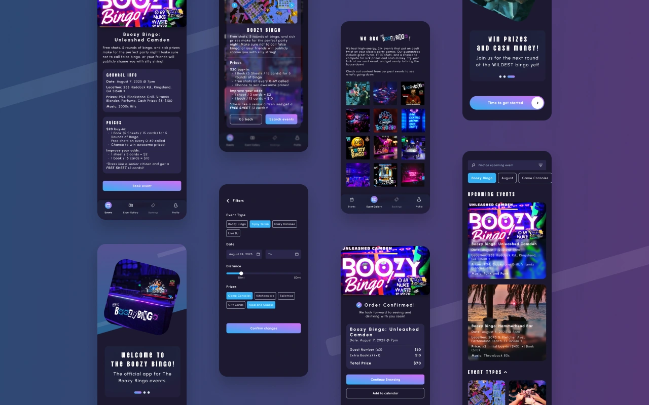 In August 2025, I collaborated with Devin Cooper to create a mobile app on behalf of his brother's business, The Boozy Bingo. The product would allow users to filter, browse, and book reservations for upcoming Boozy Bingo events. Past events will also be displayed for advertising and social proof purposes. The client was very satisfied when I presented the original and simplified wireframes, remarking how the aesthetics captured his brother's vision. He gave a 5-star review and requested to work on more Fiverr projects in the future.