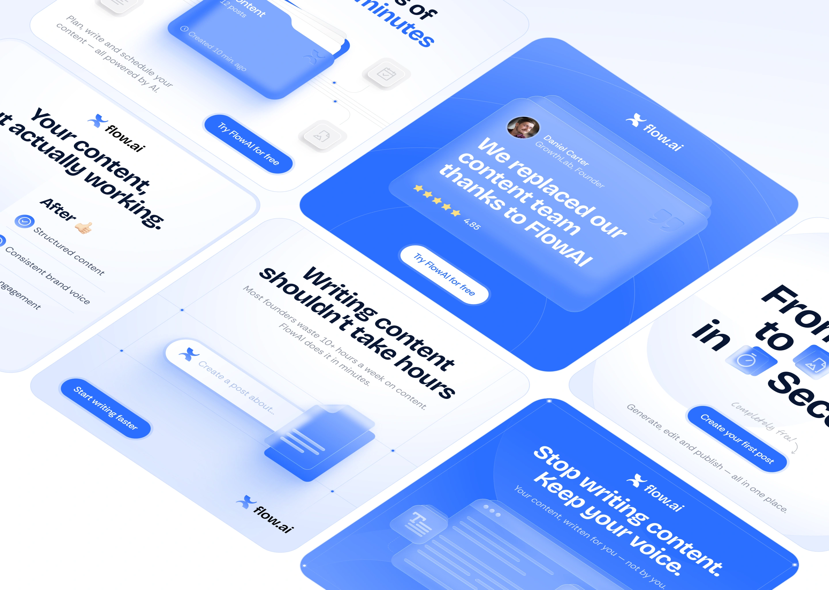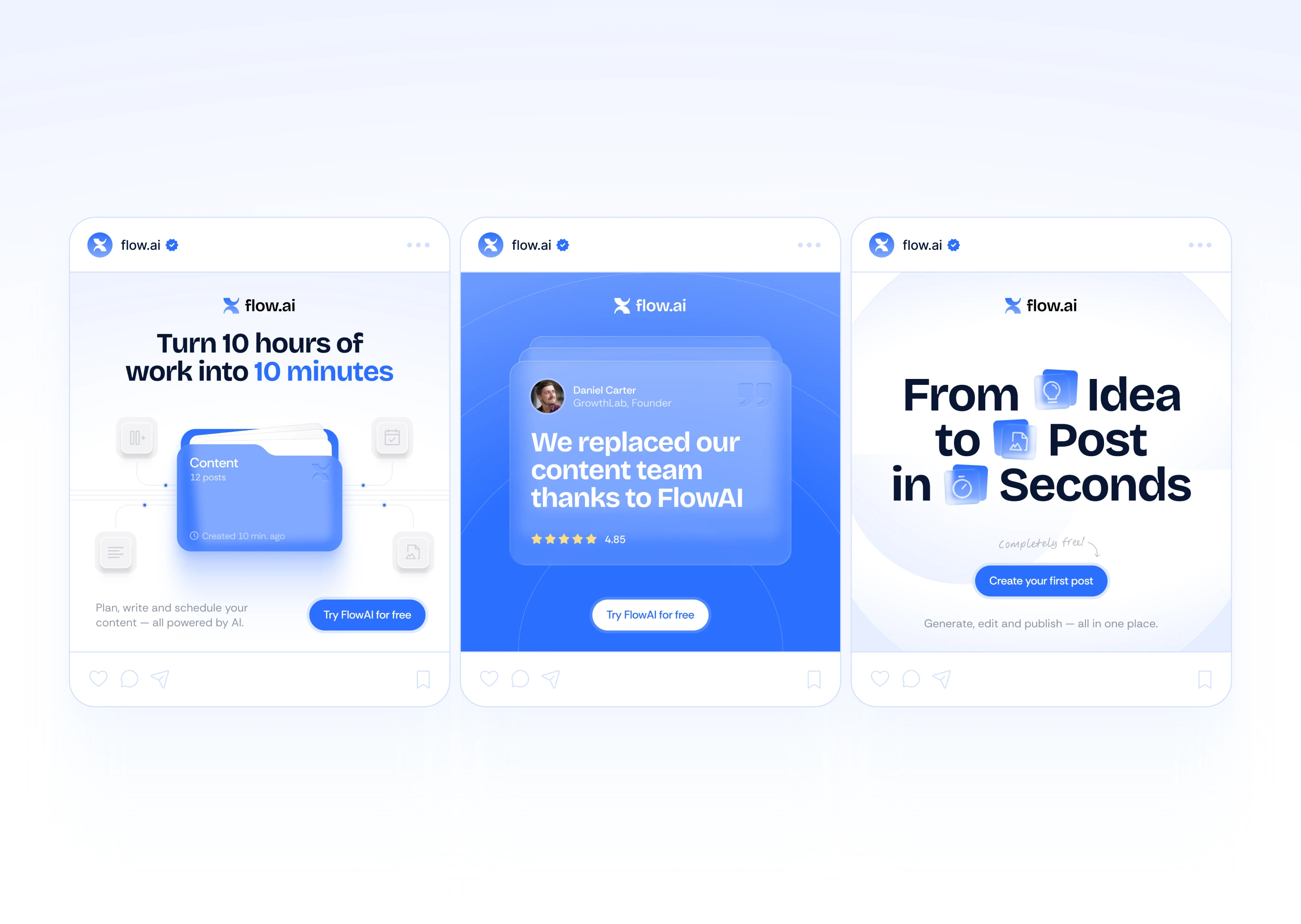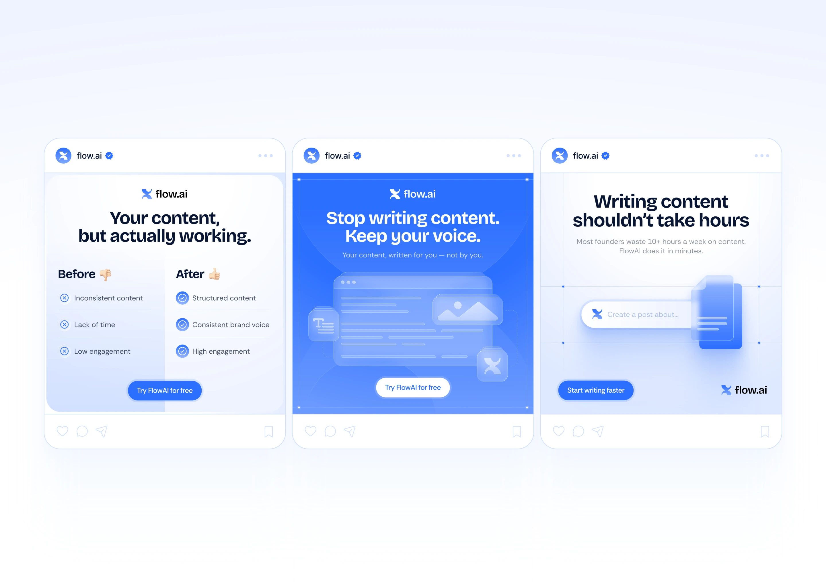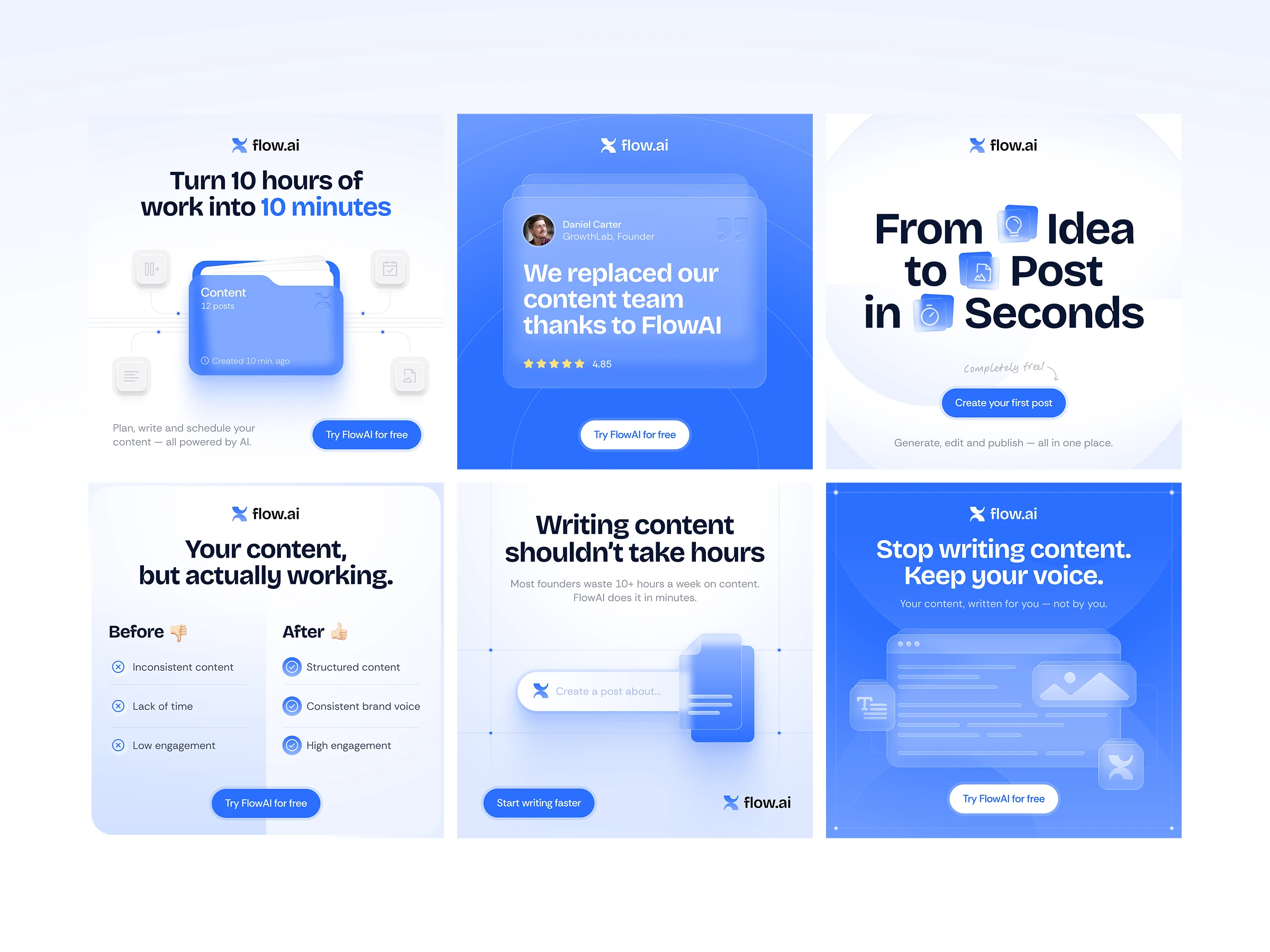 Conceptual ad campaign created for FlowAI, an AI-powered content creation tool. The goal was to design high-converting, scroll-stopping visuals tailored for social media platforms.