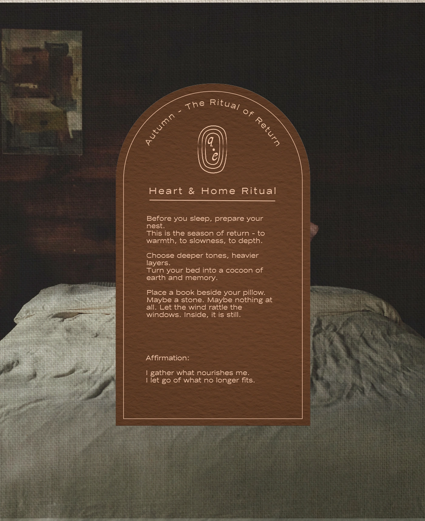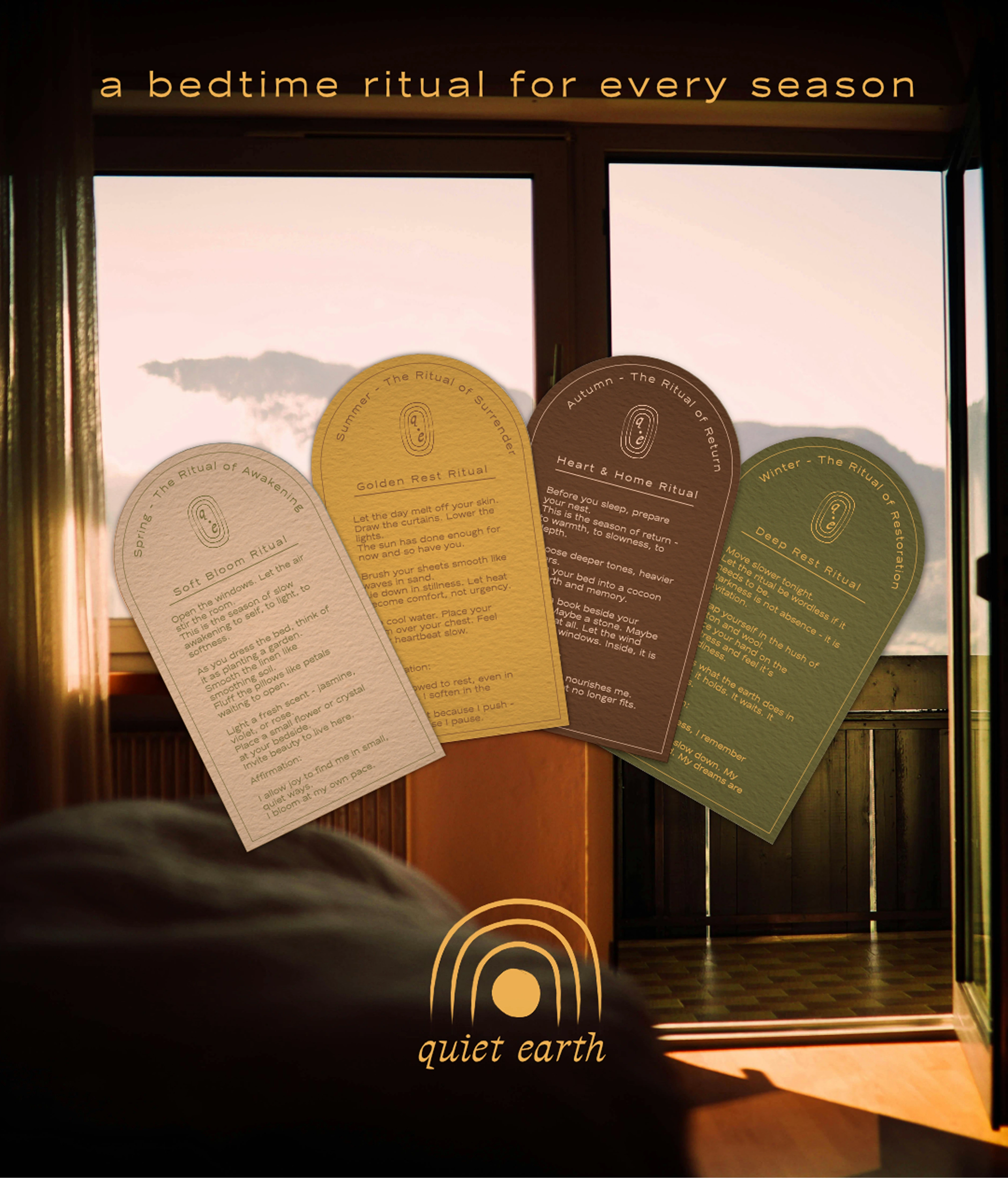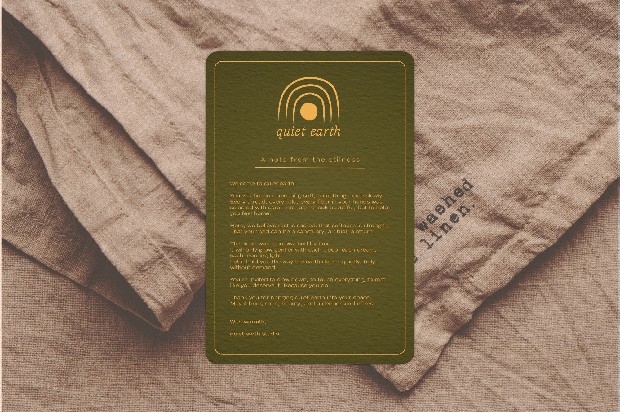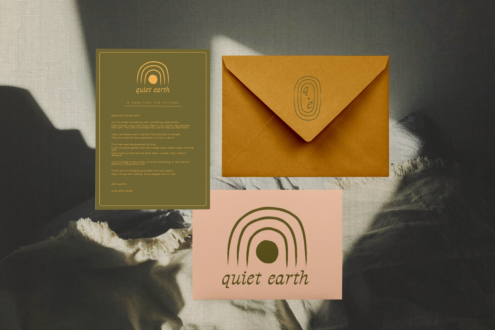 The design is built around earth-toned textures, tactile materials, bedtime rituals and the power of peace and quiet in a noisy, modern world. The logo is Inspired by Japanese zen gardens and 70’s interiors and the font is all lowercase because quiet earth doesn’t need to shout.