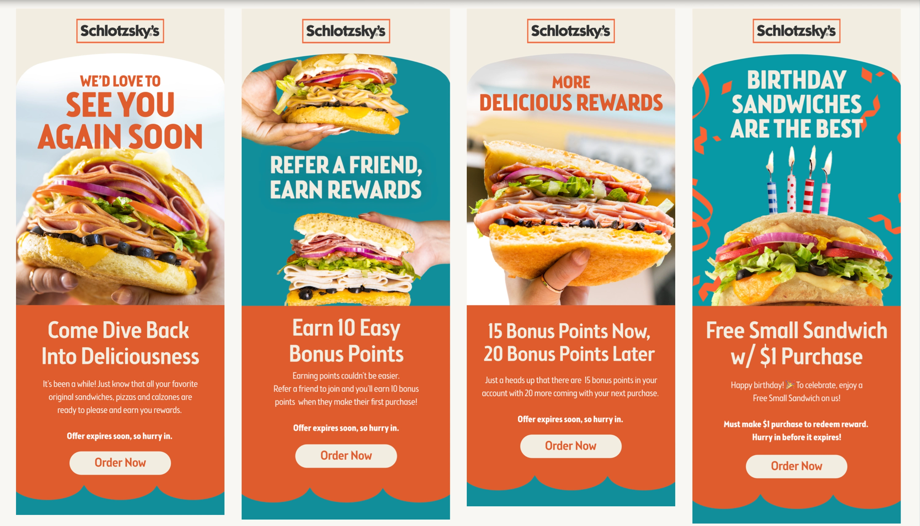 Schlotzsky's is a fast-casual dining chain specializing in deli-style eats. The new visual identity for their email marketing campaigns includes a new color palette, layout, and unique design elements.