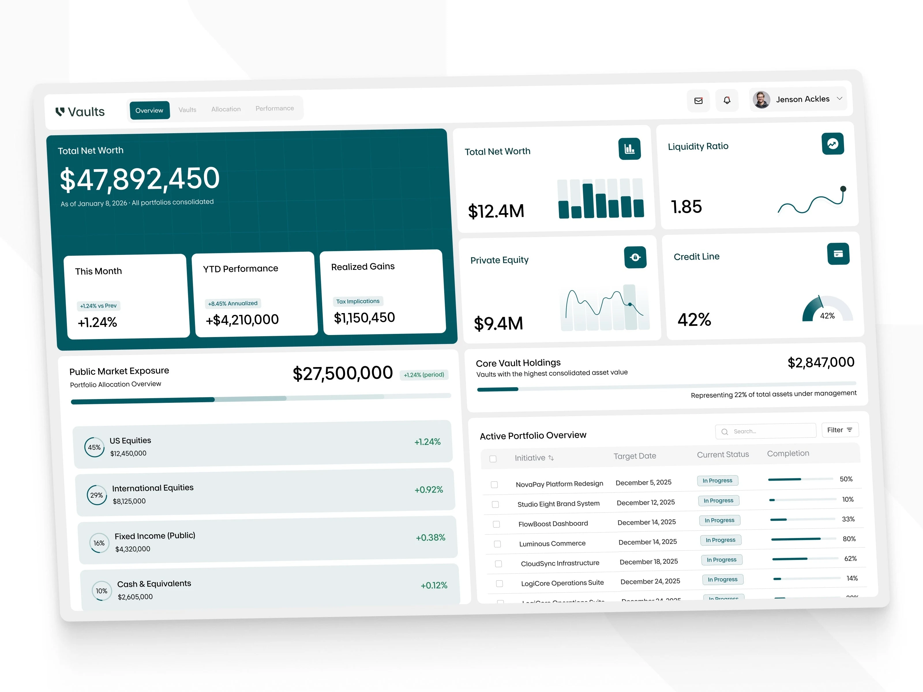 Vaulta was created as a concept to explore how financial technology can feel more transparent, structured, and human. The goal was to design a wealth management dashboard that helps users track assets, manage portfolios, and make informed decisions through a clear, data-driven, and confidence-building interface.