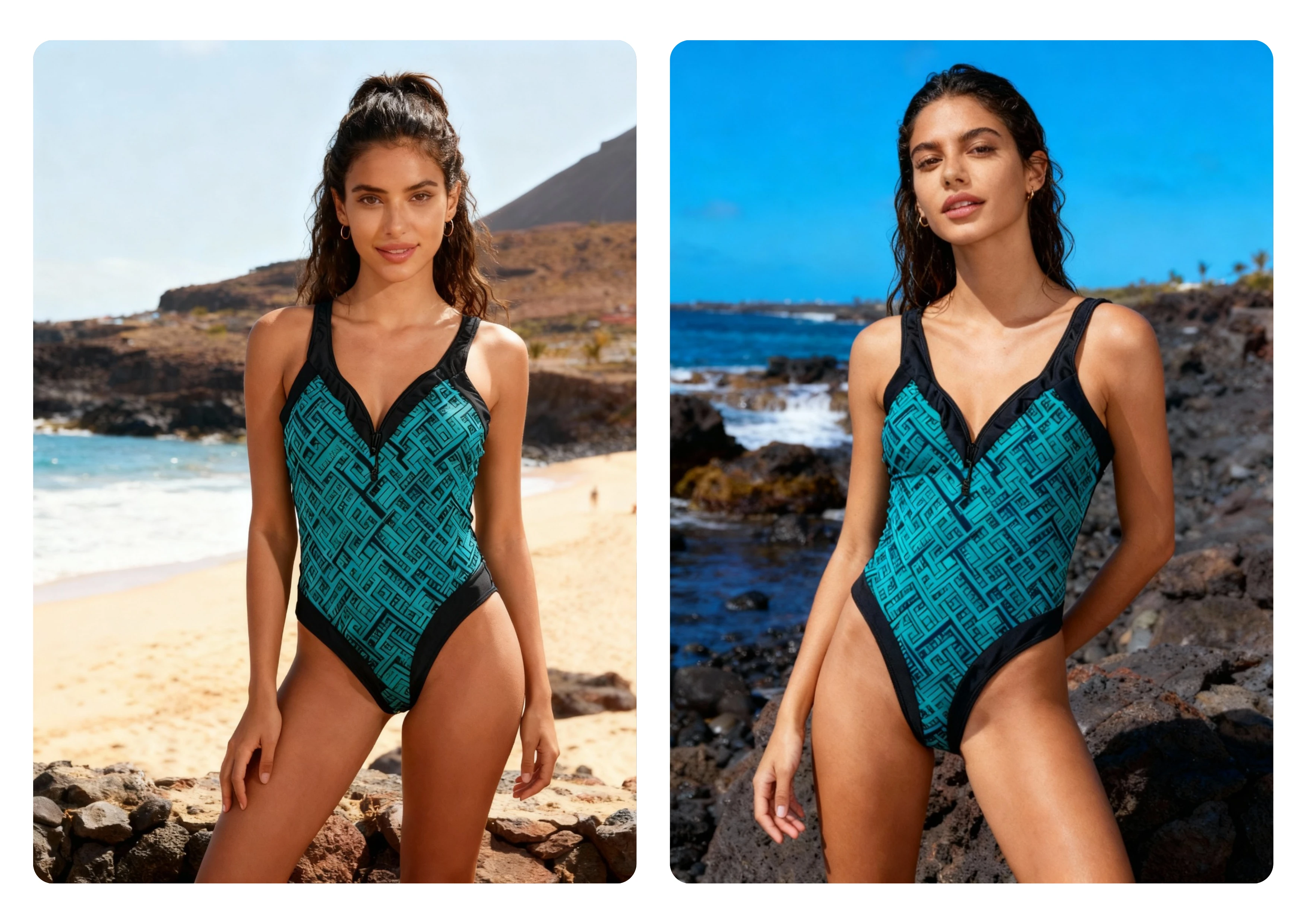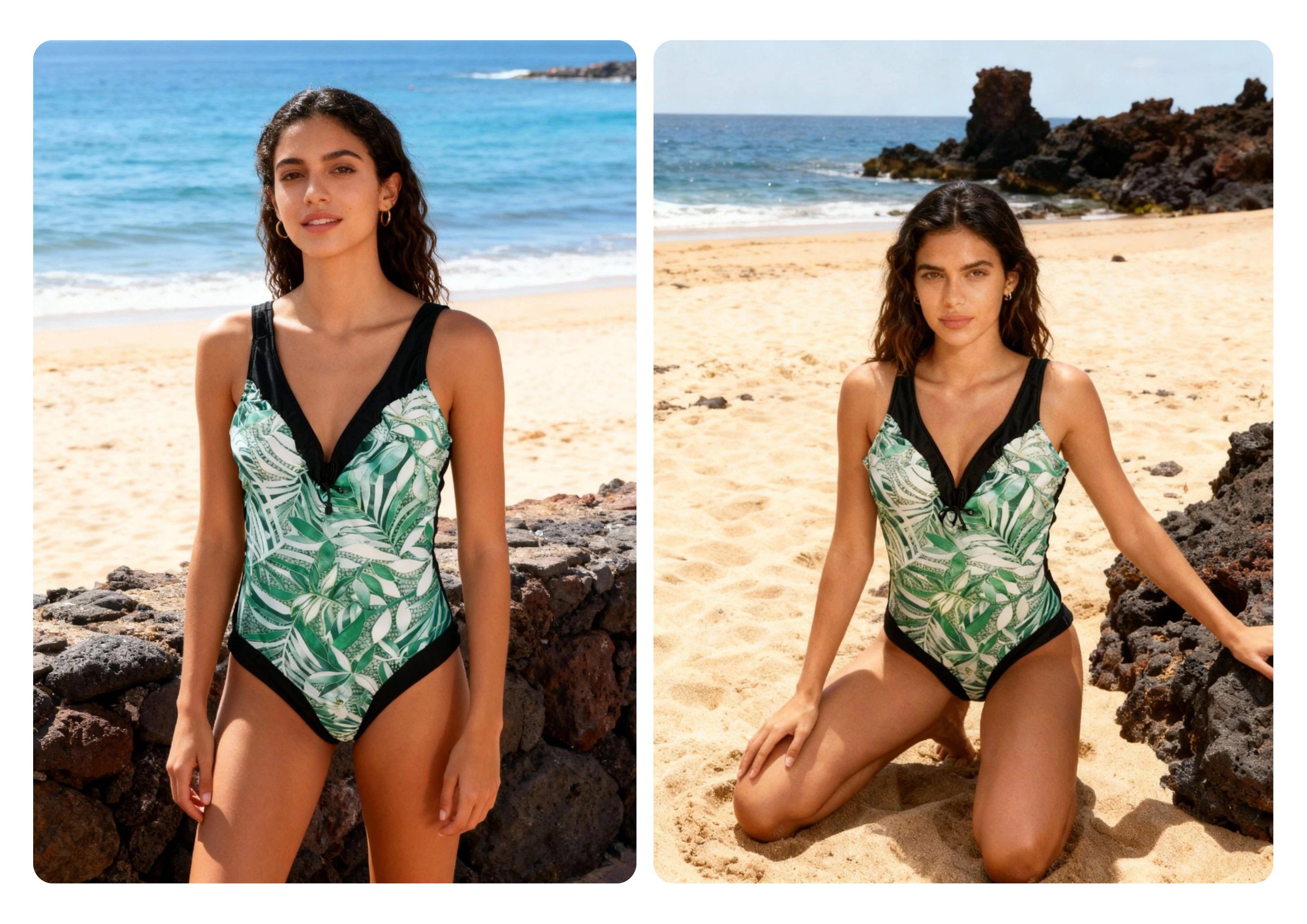 Result: I reworked the design digitally, cleaning and adapting it for e-commerce presentation. Finally, I placed the bikini on a model at the beach, creating an aspirational lifestyle image that feels fresh and authentic.