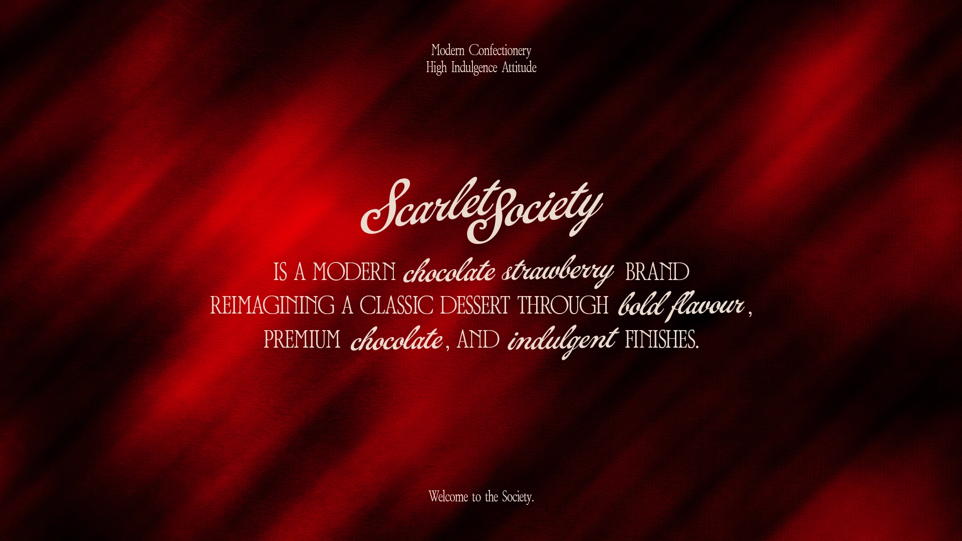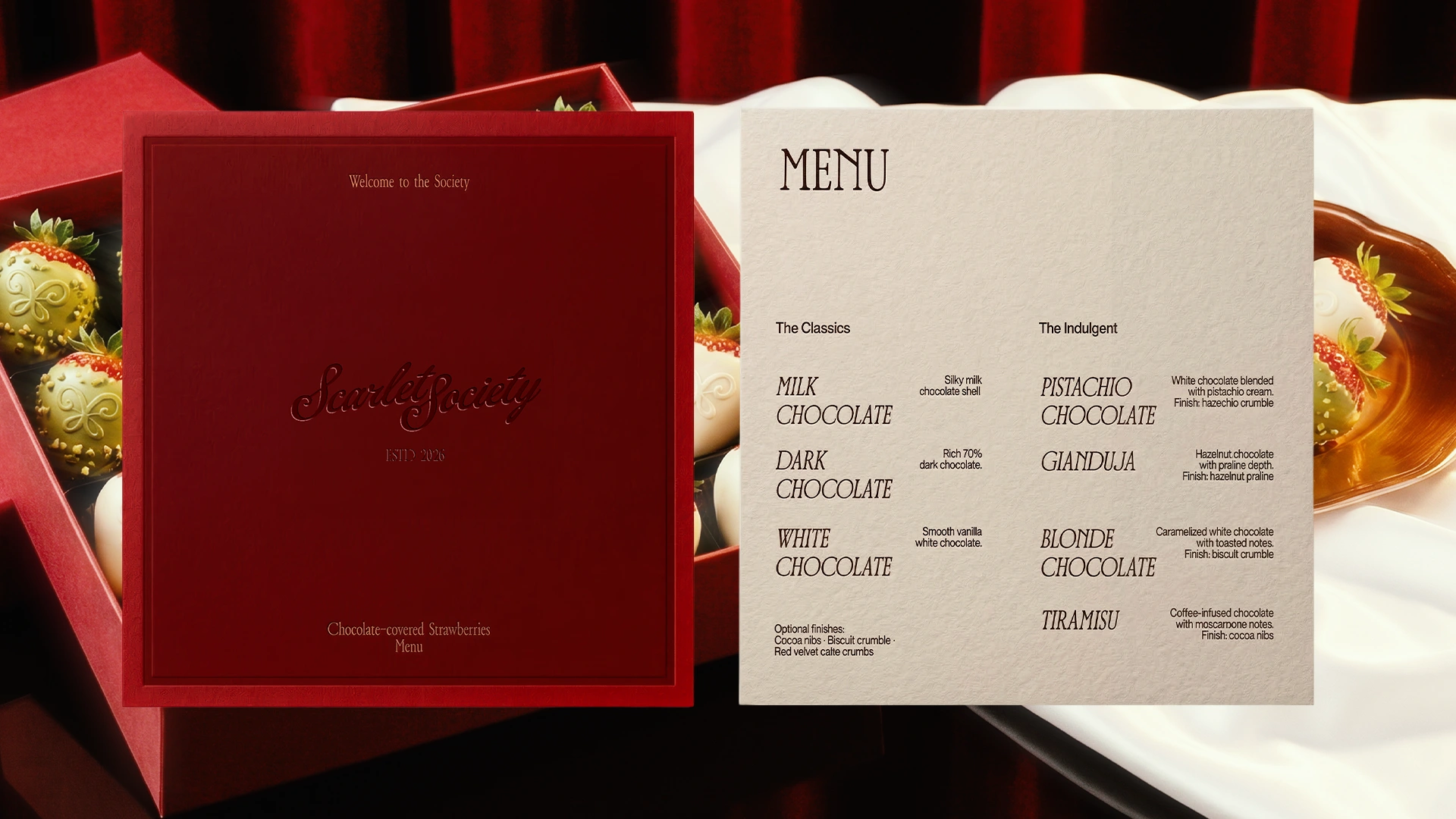 Traditionally associated with gifting or overly playful presentation, chocolate strawberries often lack a strong, contemporary identity. Scarlet Society challenges this by positioning them as a bold, elevated product, combining premium chocolate, curated finishes, and a distinct visual language.