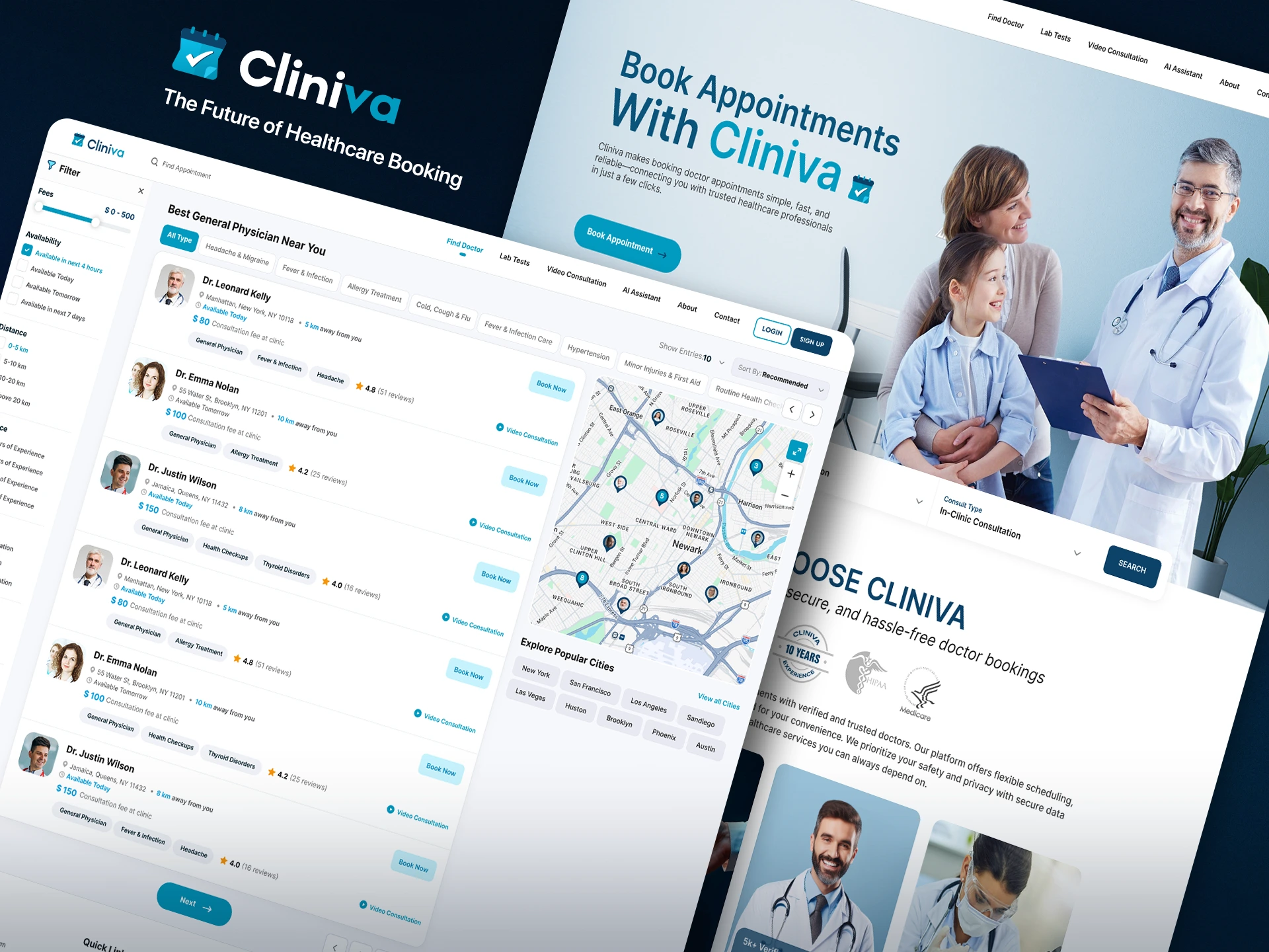 The web design for the healthcare appointment booking system focuses on simplicity, accessibility, and trust. The interface uses a clean layout with ample white space, calming colors (such as blues and greens), and clear typography to reduce user stress. Key features like doctor search, appointment scheduling, and patient records are prominently displayed and easy to navigate. The design prioritizes intuitive user flows, allowing patients to quickly find specialists, view availability, and book appointments with minimal steps. Responsive design ensures a seamless experience across devices, while accessibility considerations—such as readable fonts and high-contrast elements—make the platform usable for a wide range of users.