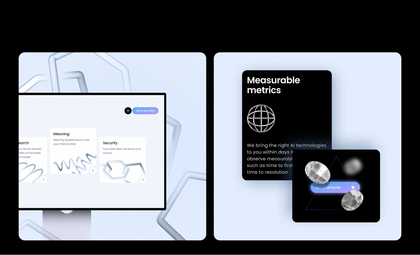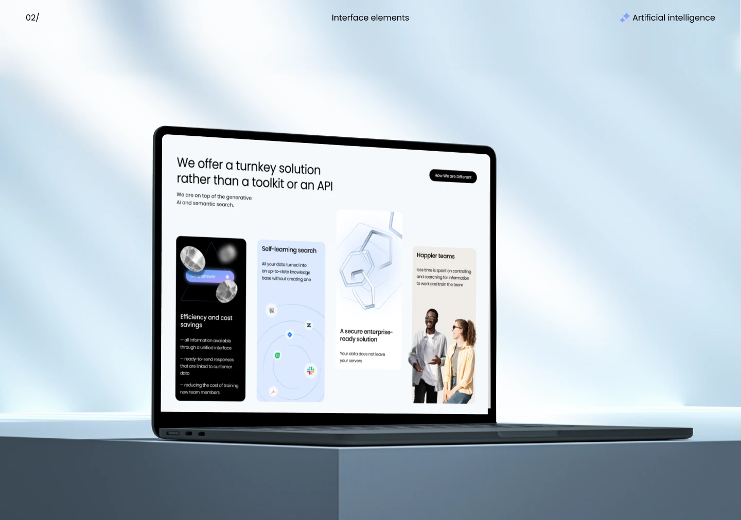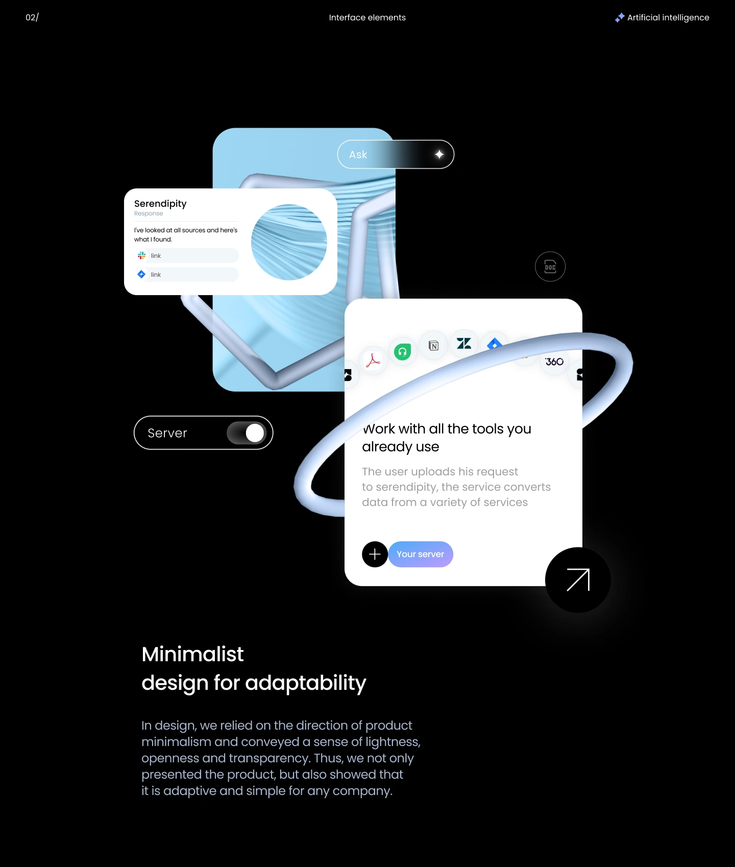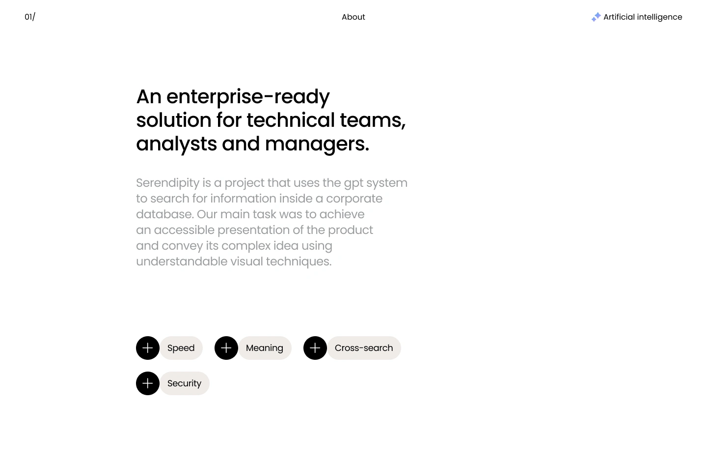 The landing page for a product, dedicated to GPT chat integration into corporate file system, providing more efficiency at different levels of business process…