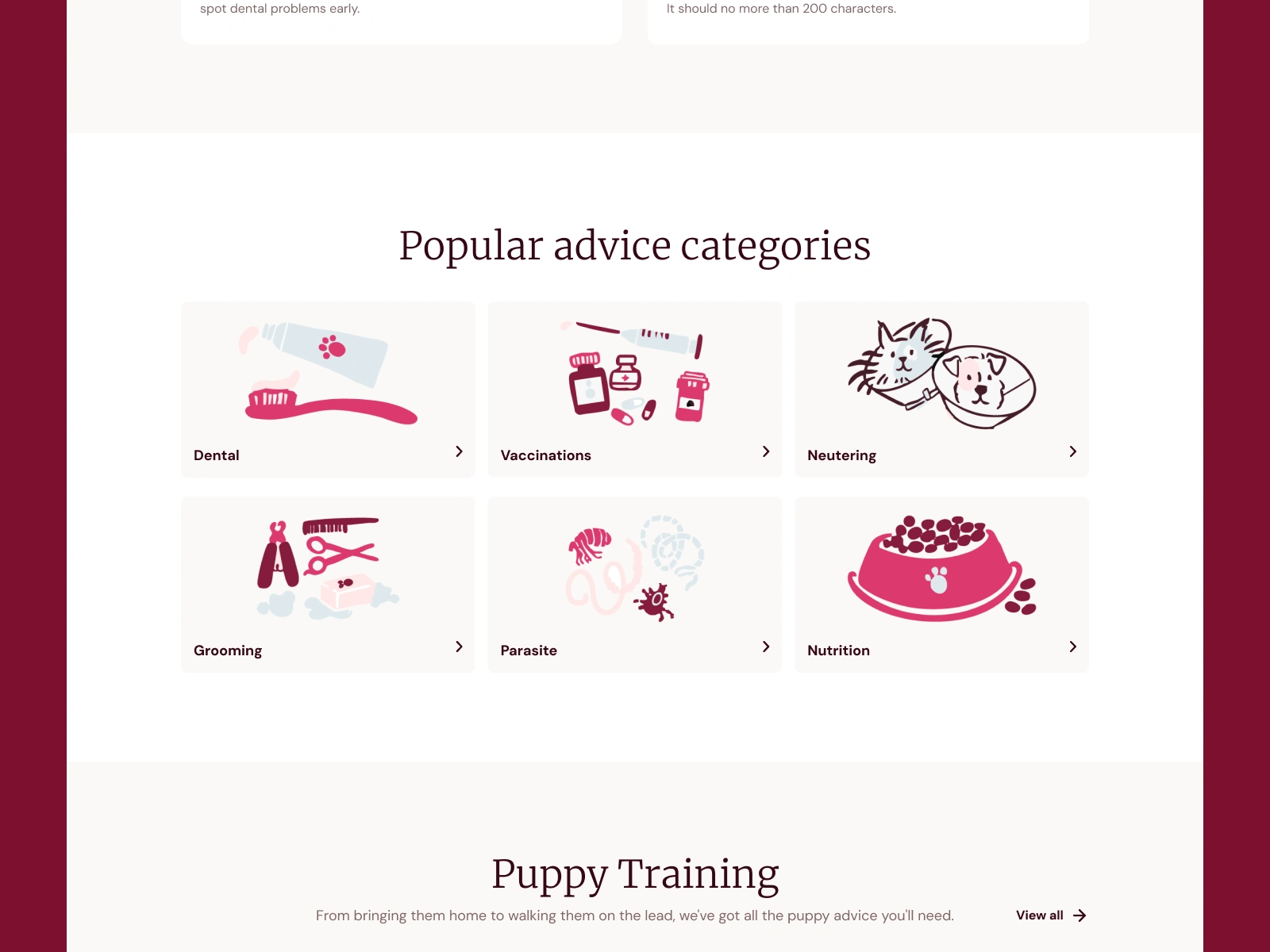 Designed and launched new core pages: Homepage, About Us, Pet Advice, Article template, and Practice Details