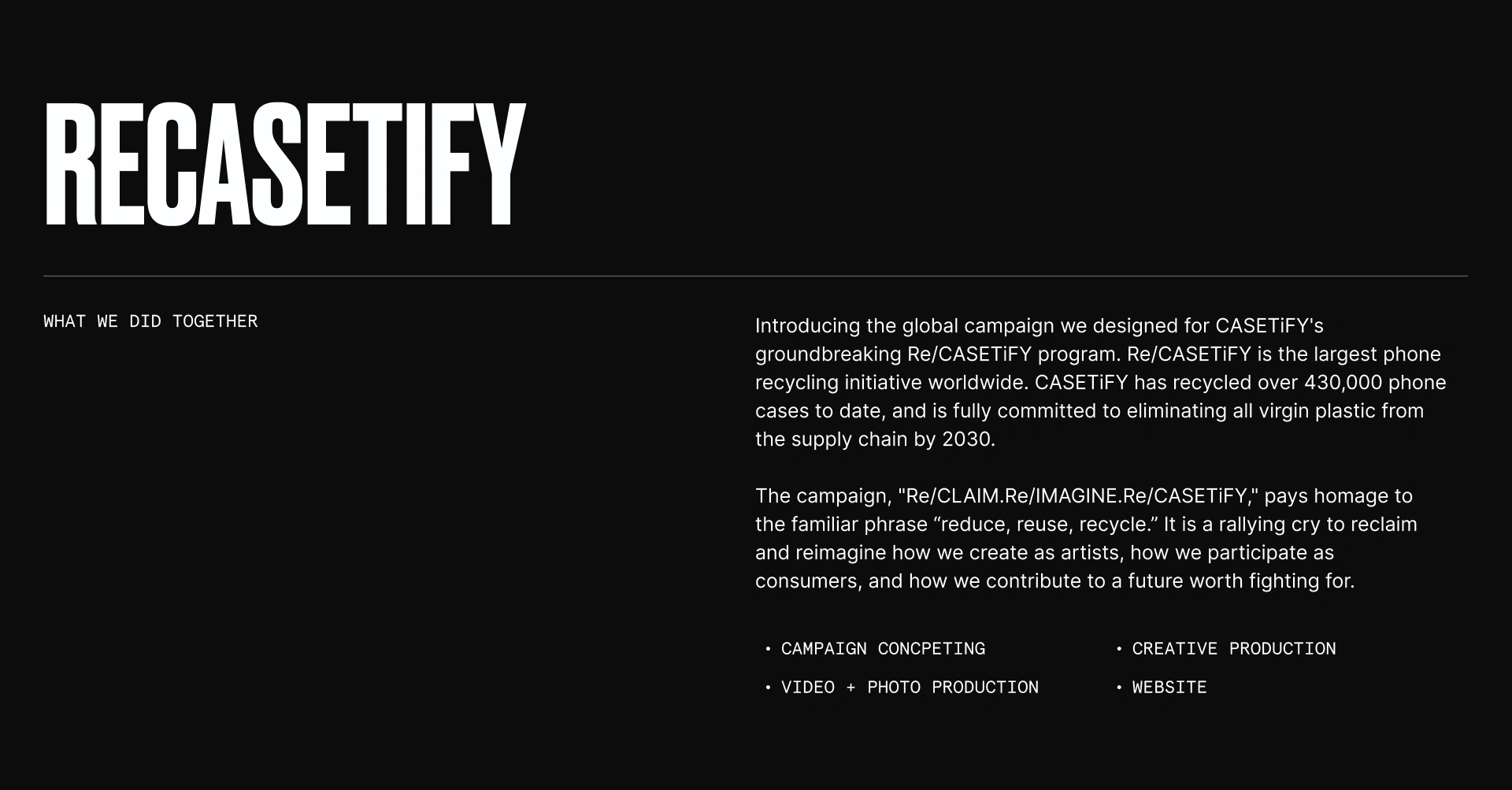 Global campaign for CASETiFY's groundbreaking RE/CASETiFY program. Services included campaign concepting, graphic design, creative production, photo + video pr…