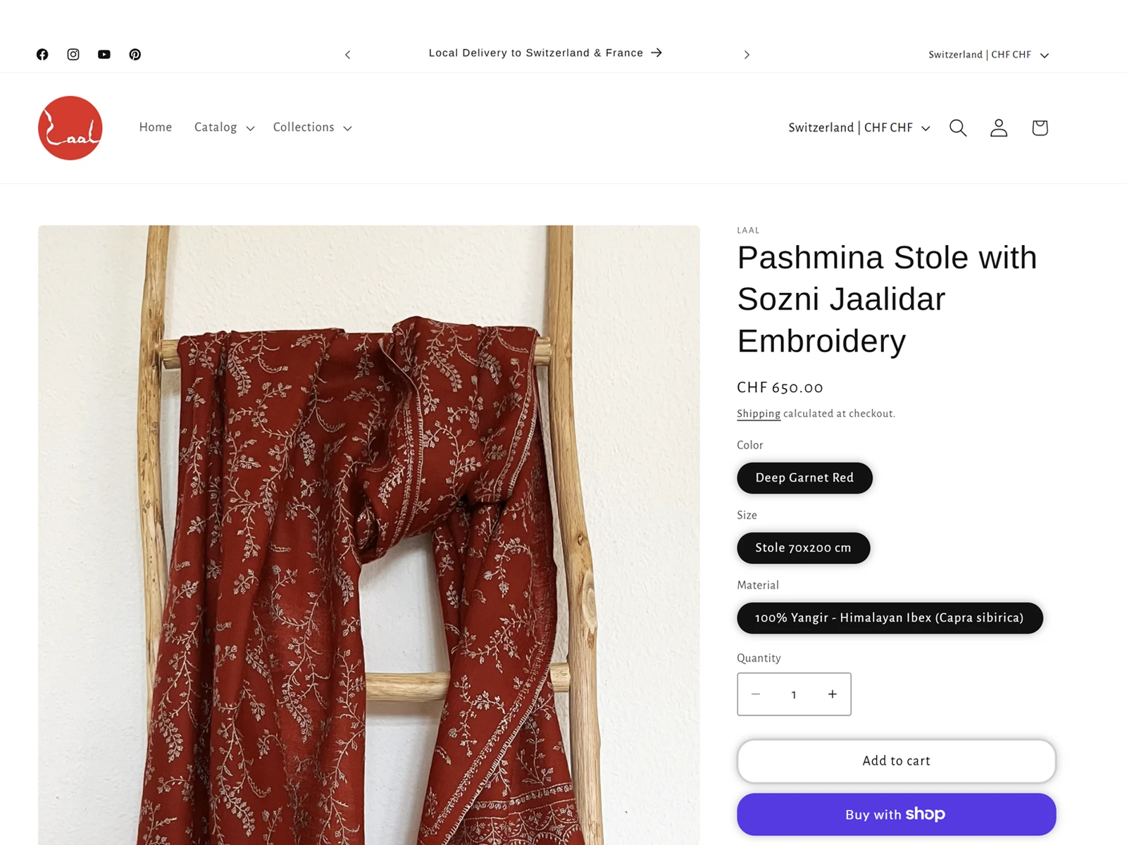 Laal.ch is a Geneva-based family boutique showcasing ethically made Himalayan cashmere and Pashmina scarves, supporting artisans in Pakistan, India, and Nepal.