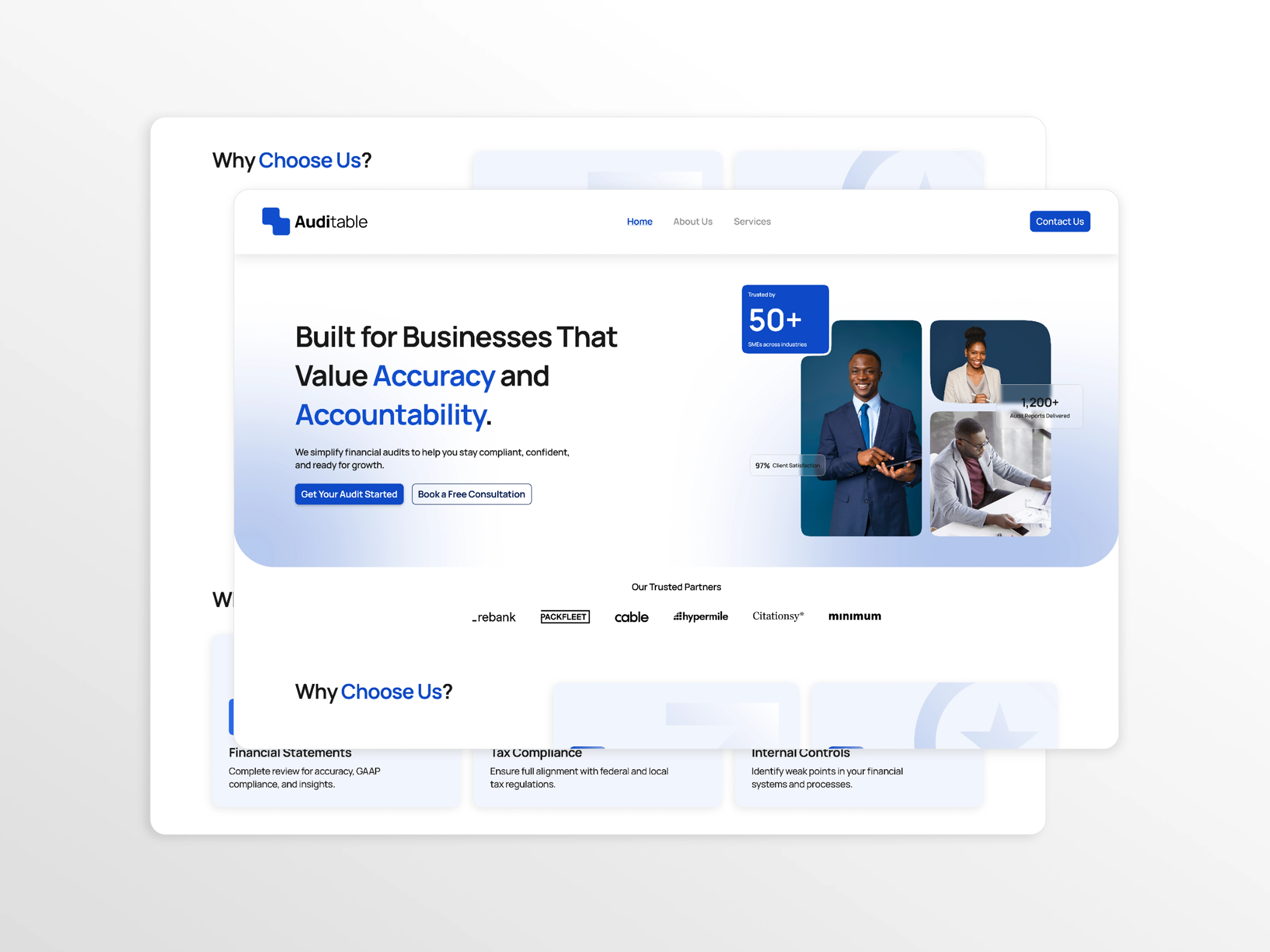 The goal was to create a brand and product experience that inspires confidence. Auditing is a sensitive field, and because of this, I made sure every visual choice from typography to color to interaction had to communicate transparency, precision, and trustworthiness.