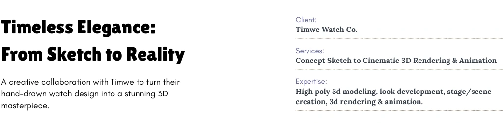 Collaborated with Timwe to transform their hand-drawn watch sketch into a cinematic 3D rendering & animation, turning vision into a stunning masterpiece.