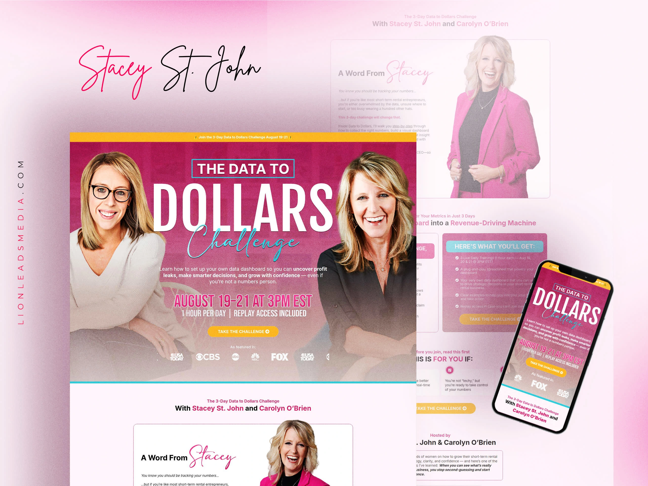 Conversion-optimized landing page for Stacey St. John's "Data to Dollars" challenge, featuring dual-host branding and conversion-focused design elements.