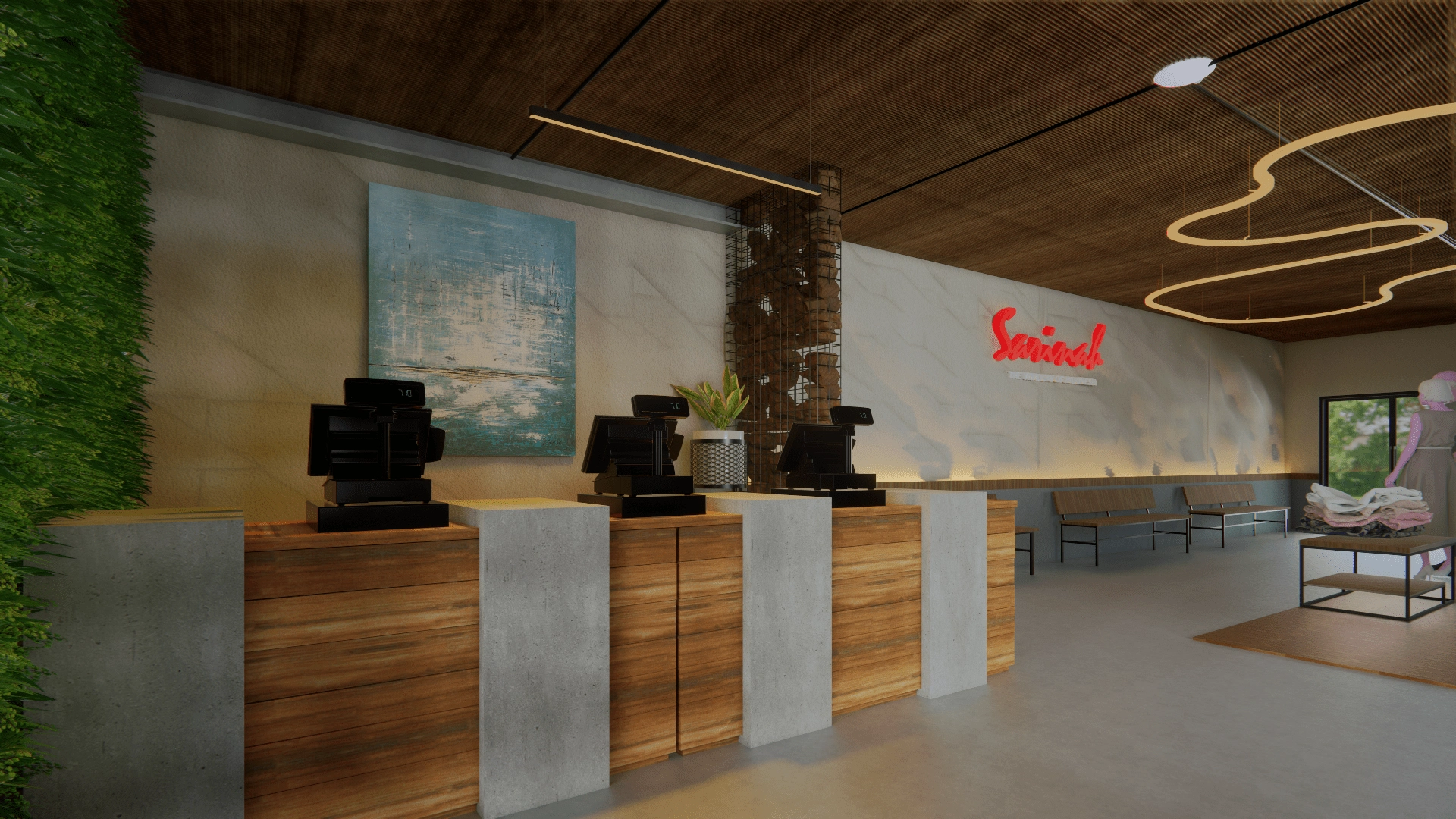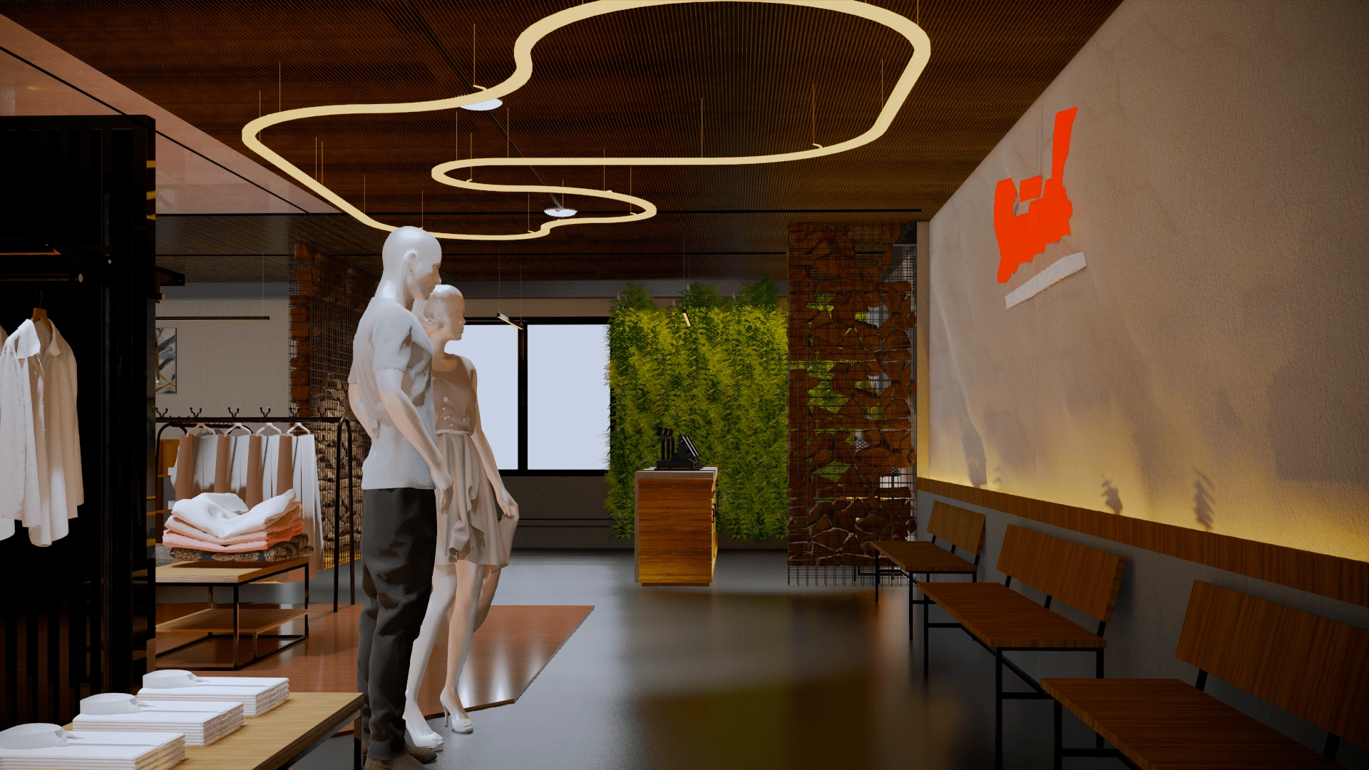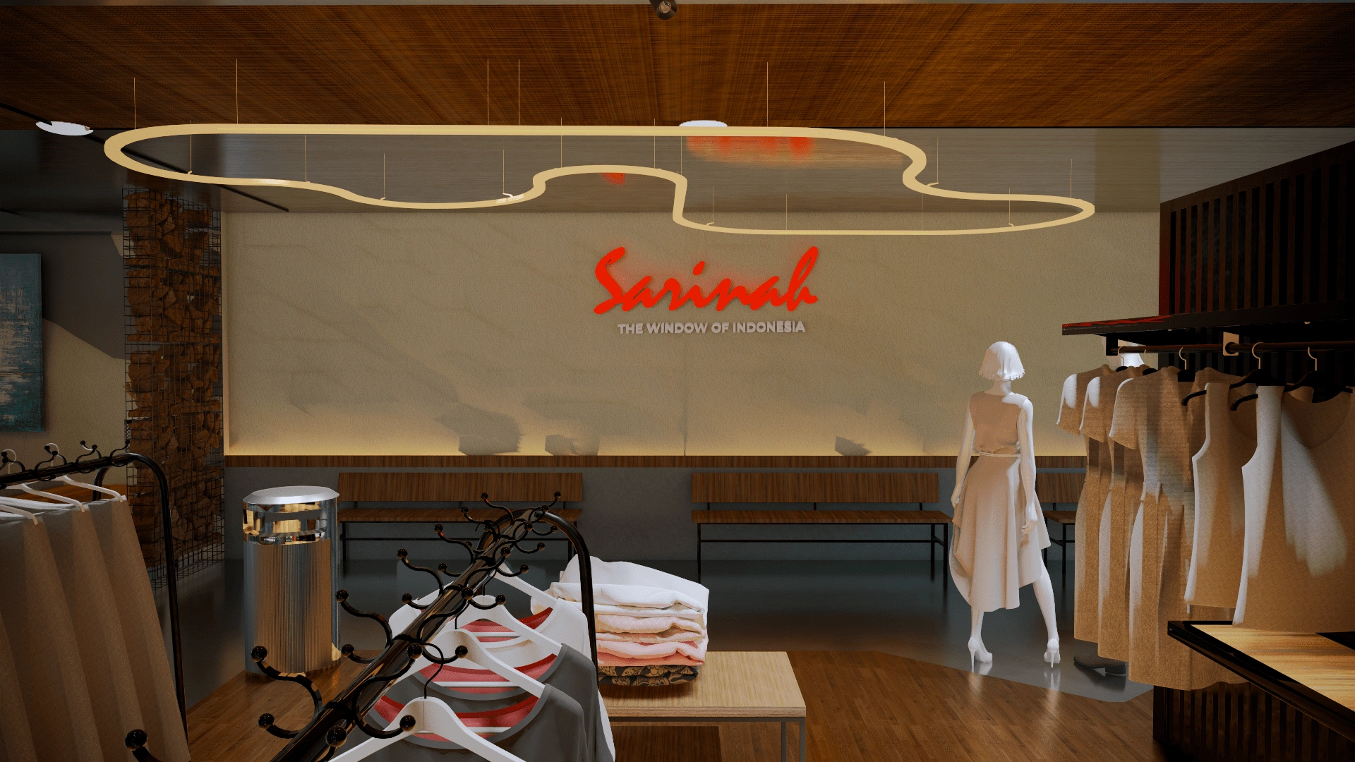 Sarinah Outlet is a clothing store targeting the upper middle segment.The design concept draws from industrial aesthetics, featuring a rugged and raw appearance