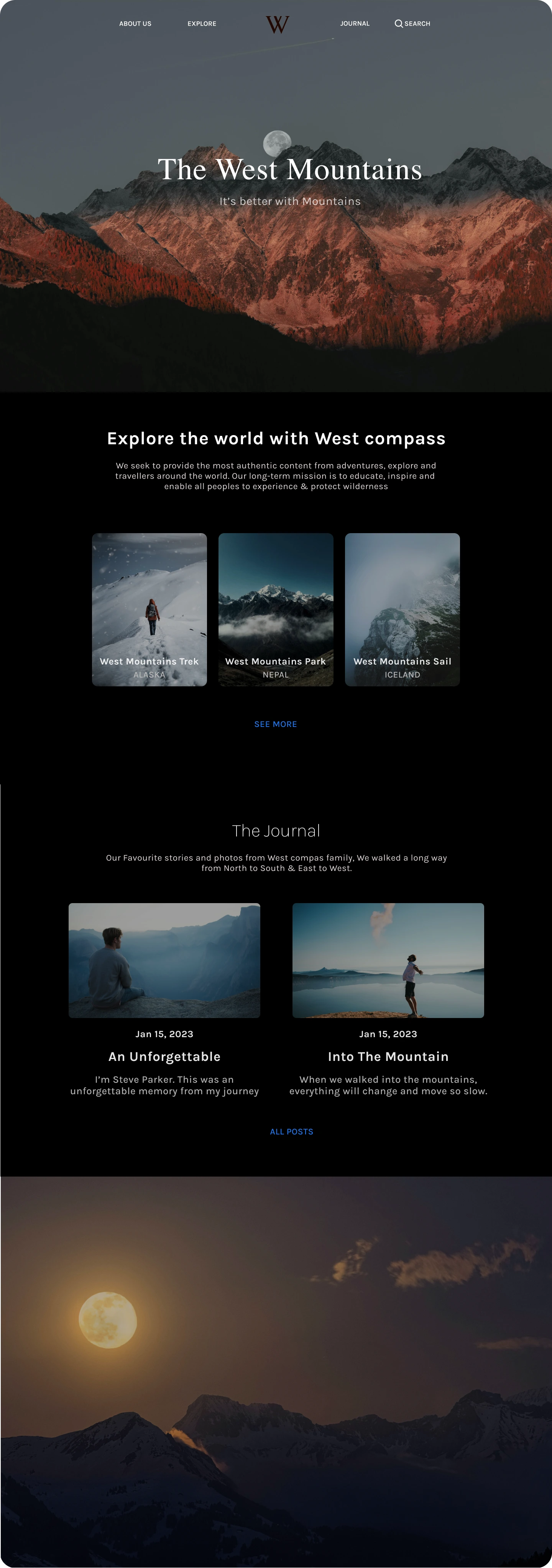 This travel platform design focuses on intuitive navigation, modular grids for dynamic content (hello, journal entries!), and a muted palette to highlight stunning photography. Bonus: Interactive hover states on the "SEE MORE" CTA! š±ļø