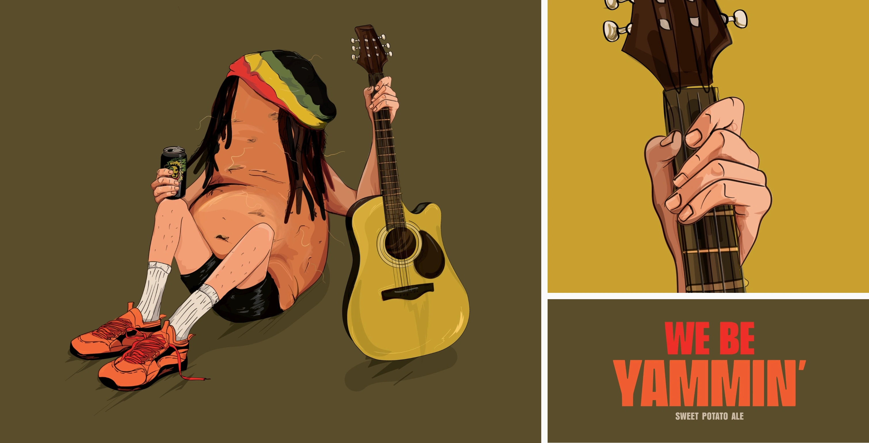 The brewers at Tighthead wanted the label for their spiced sweet-potato ale to capture the feeling of fully relaxing after a big holiday meal. In response, I illustrated a “real-bodied” yam chilling in his shorts—shoes untied, but too lazy to kick them off. Guitar out, and just vibing.