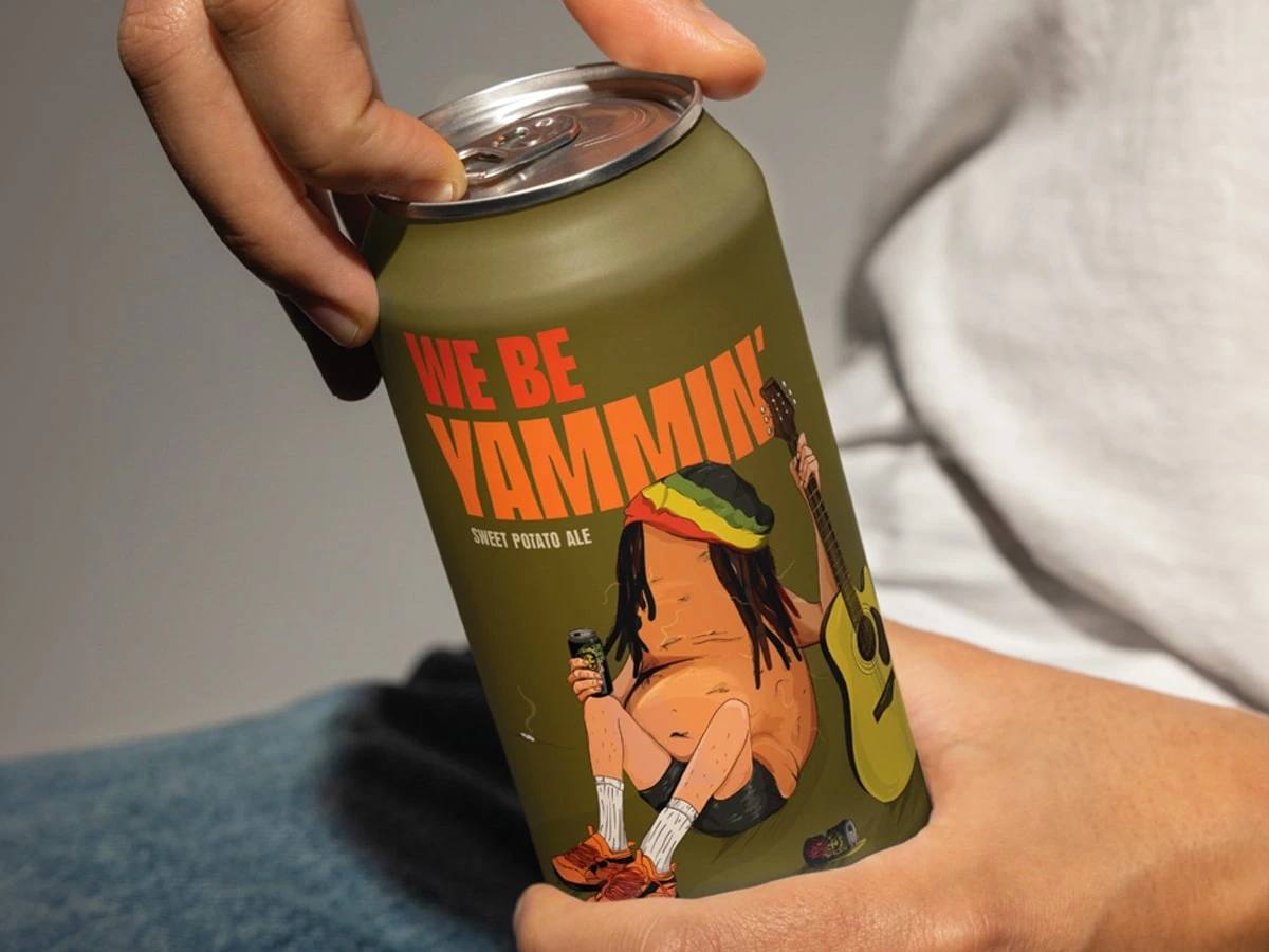 A real-bodied yam kicks back on this label for Tighthead’s sweet potato ale—post-holiday meal vibes, untied shoes, guitar out, and absolutely no plans.