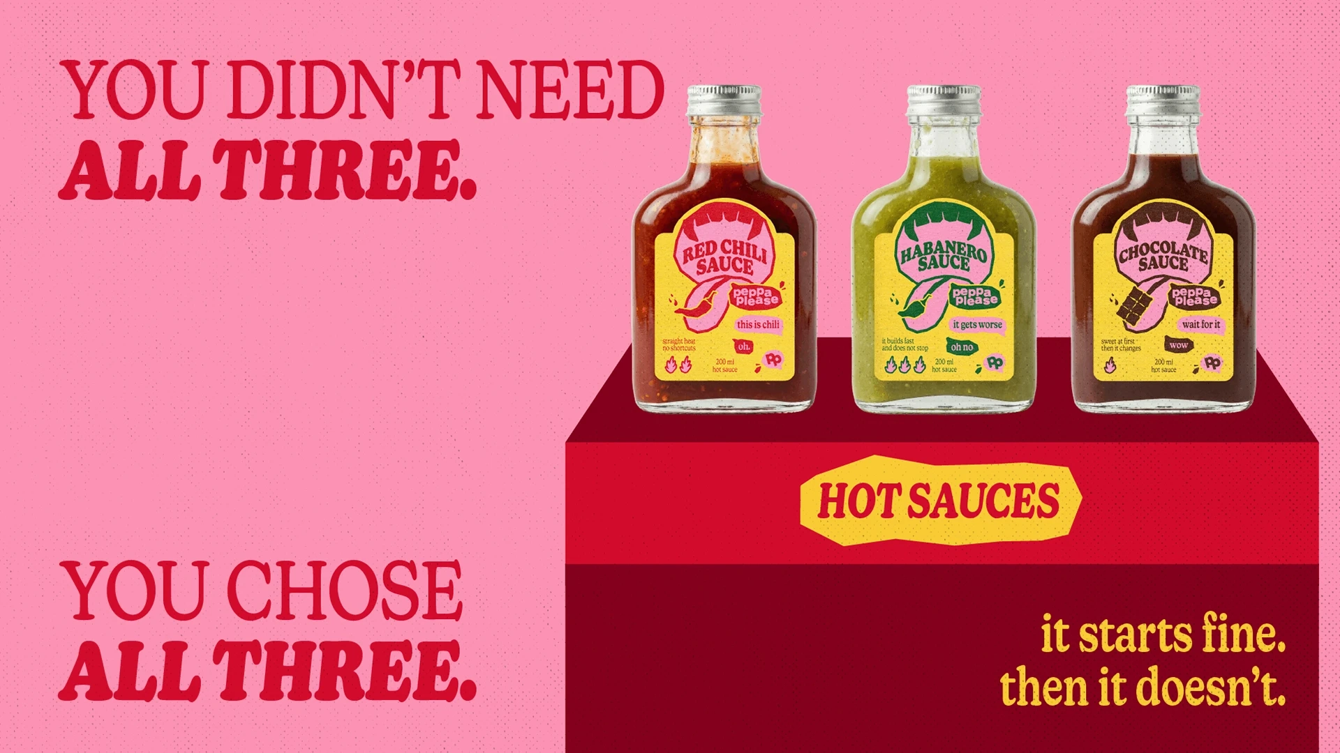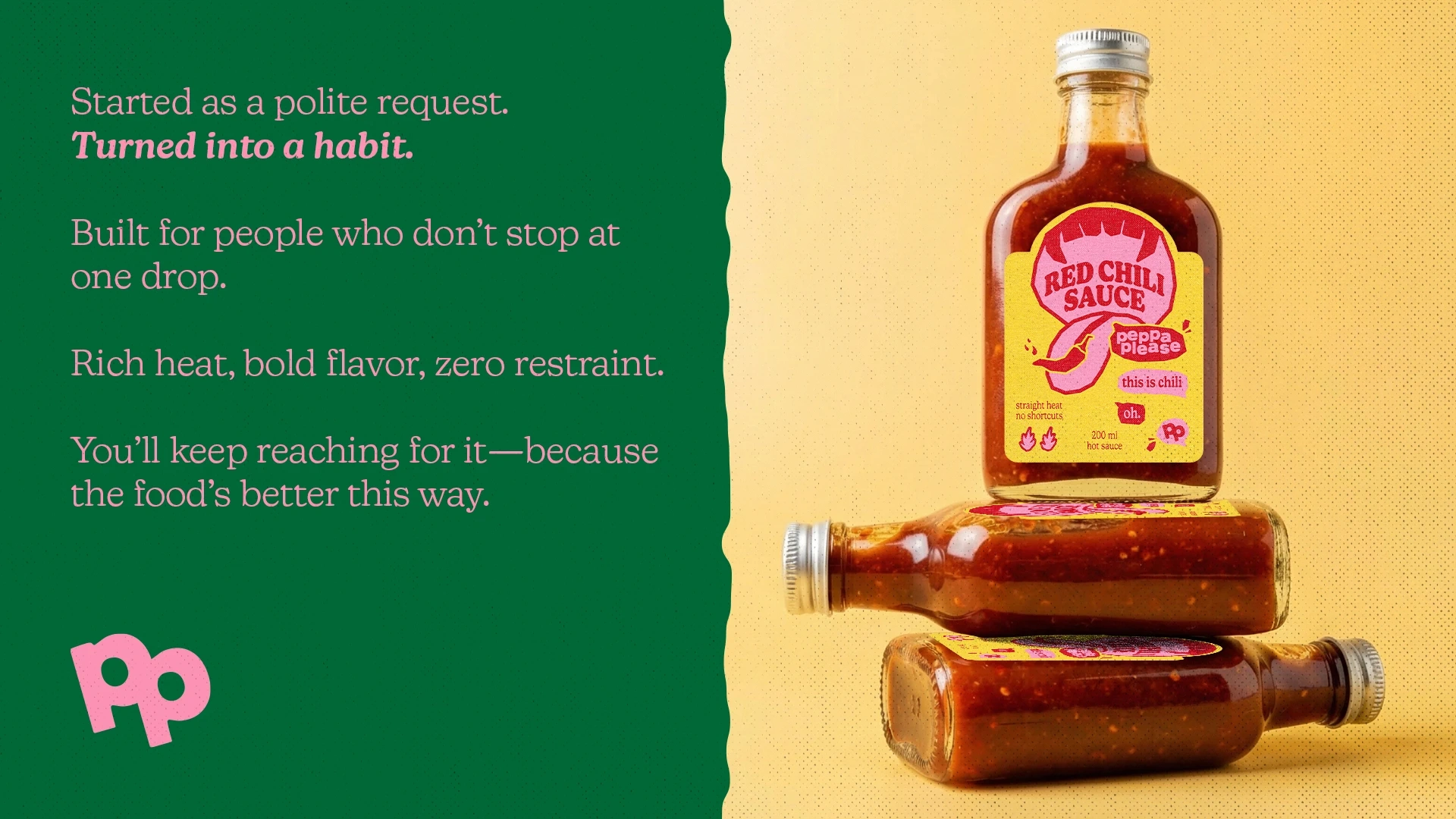 Peppa Please celebrates hot sauce as an experience, not a condiment. Designed to feel indulgent, expressive, and a little unhinged, the brand embraces chaos, appetite, and personality—because good sauce should make you lose control, just a bit.