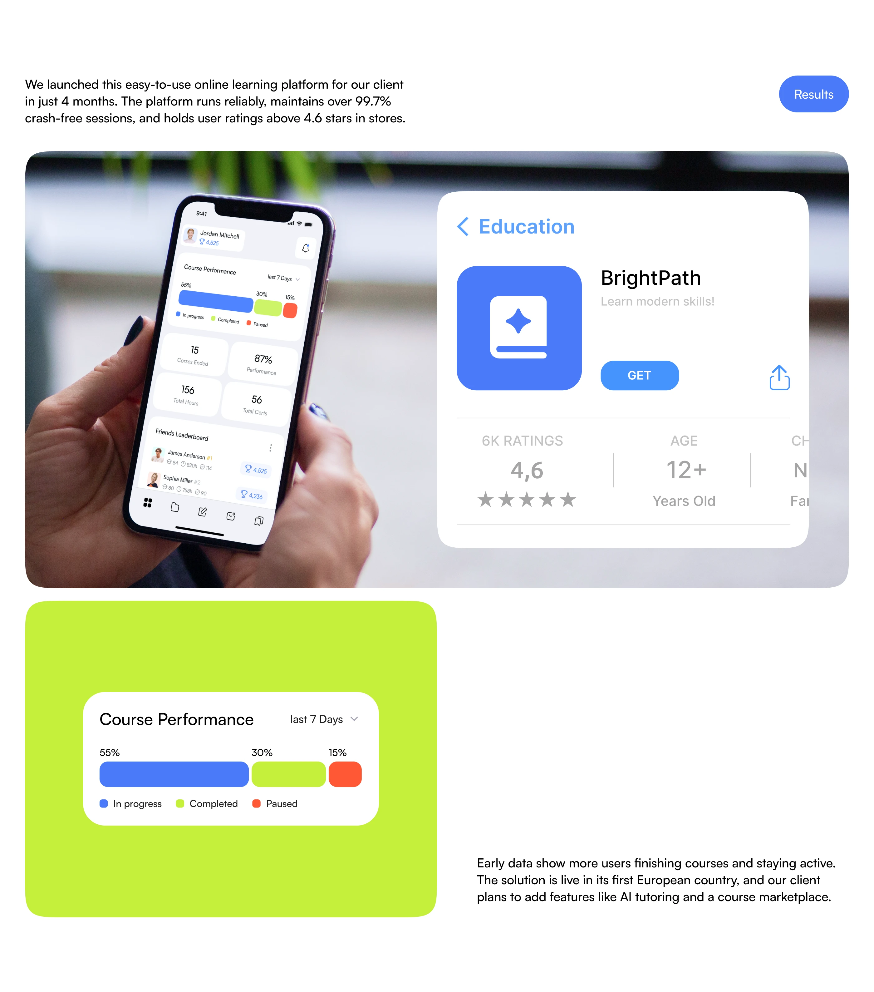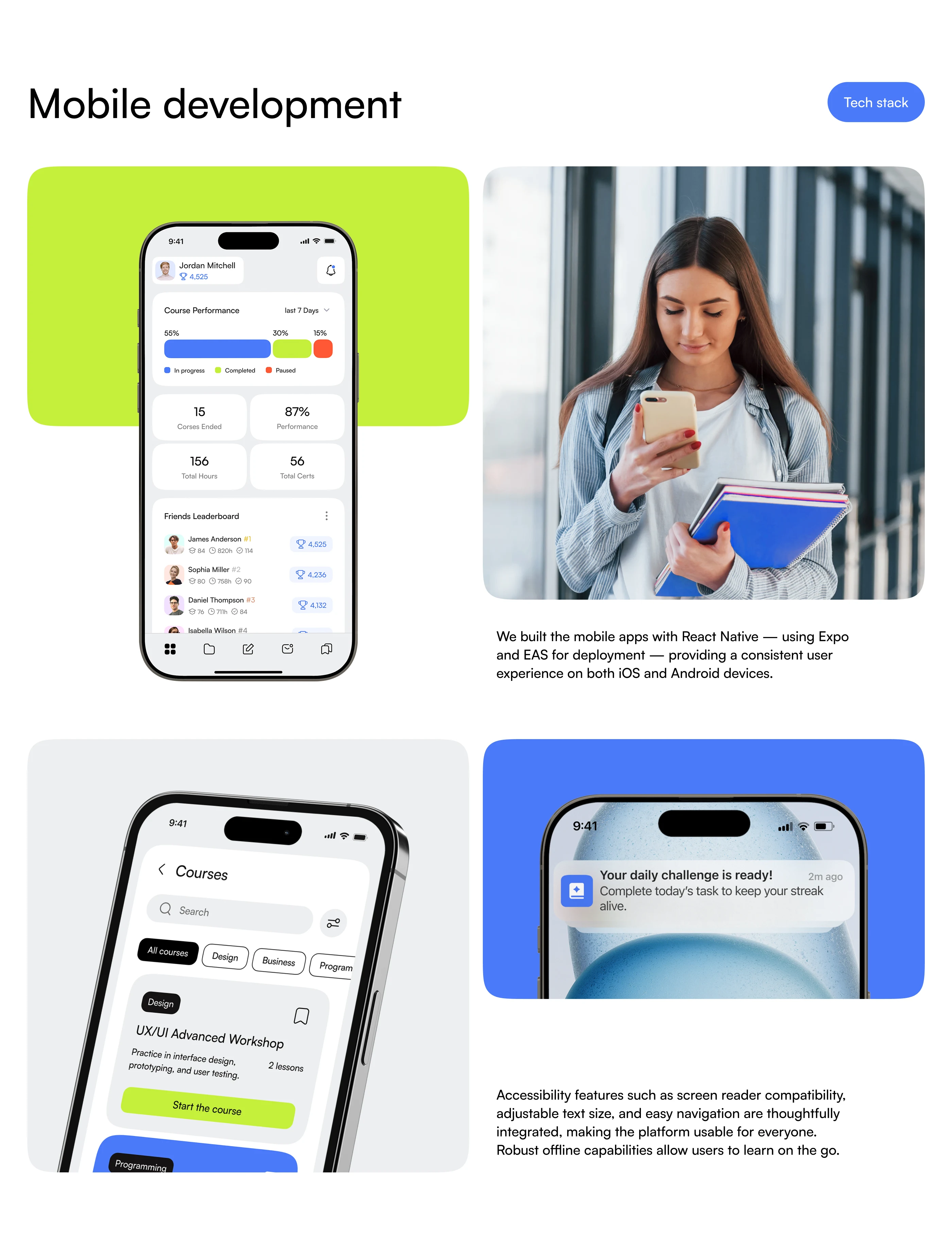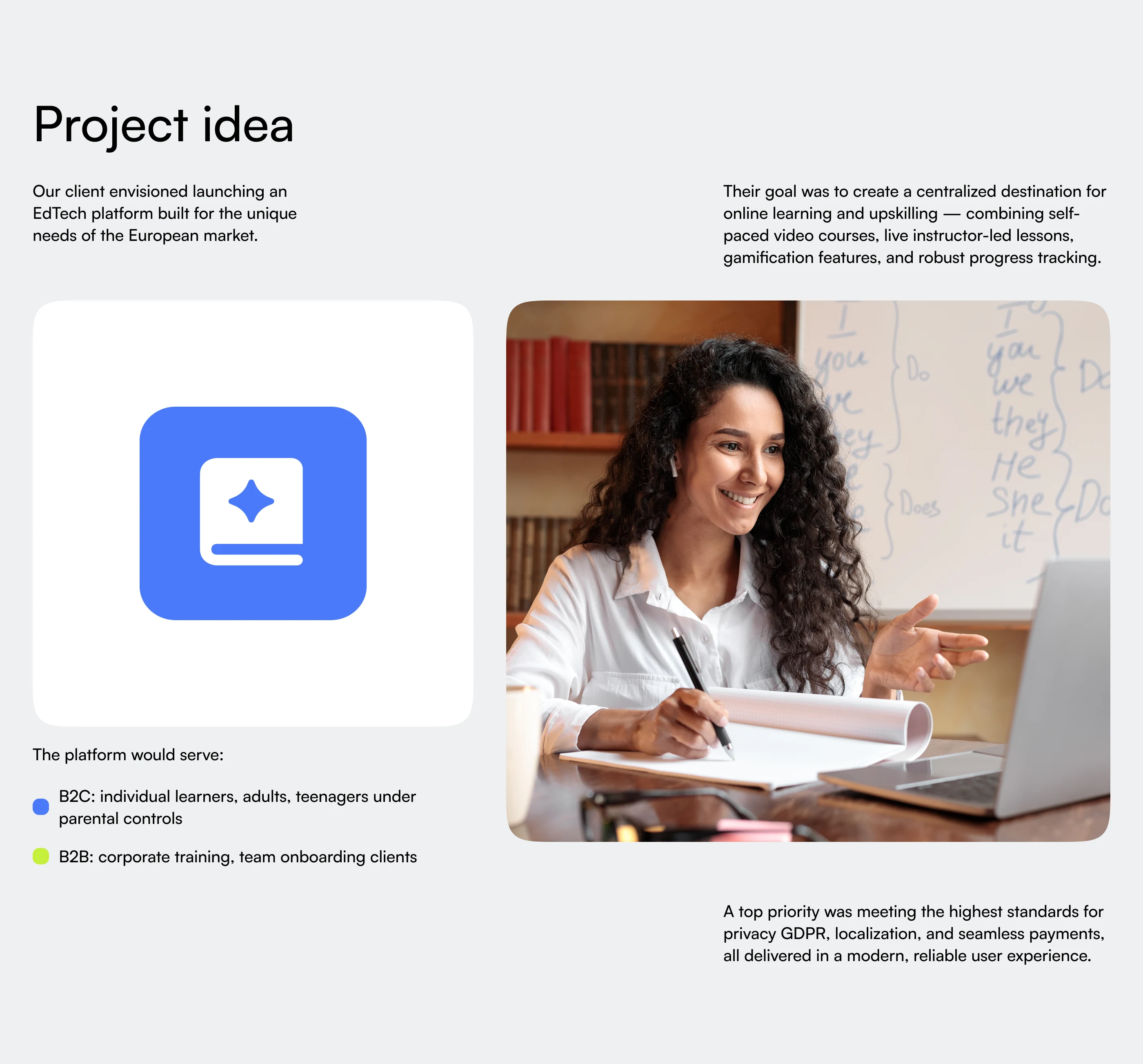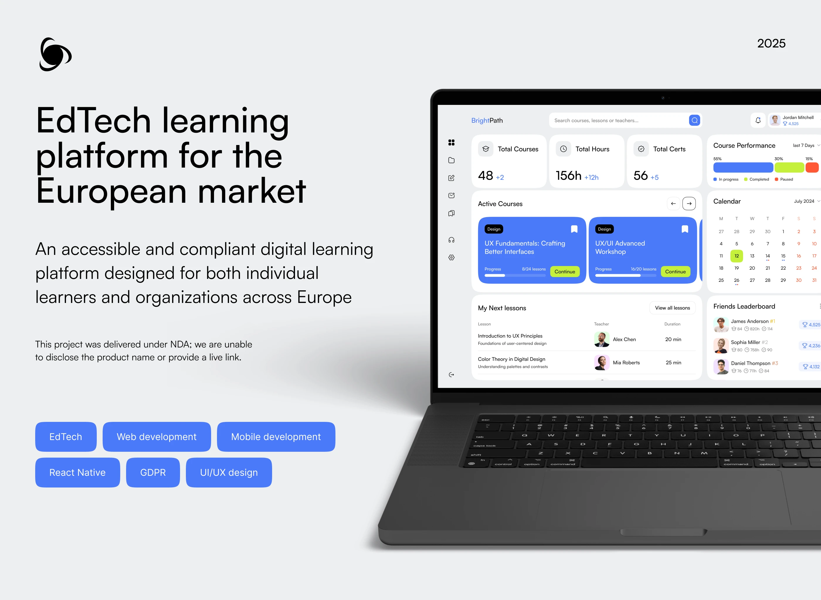 Ronas IT proudly presents a cutting-edge GDPR-compliant EdTech learning platform designed for the diverse European market. Our comprehensive web and mobile app development delivers a rich online learning experience for B2C and B2B users. This real-time learning platform features self-paced courses, interactive live classes, advanced gamification, and robust progress tracking. With intuitive UI/UX design, seamless multilingual support, and strict accessibility compliance, the platform ensures an inclusive and engaging experience. Built with Next.js, Node.js, and React Native, it integrates secure payments and a custom admin panel, providing a scalable educational application that adheres to the highest standards of privacy and user experience.