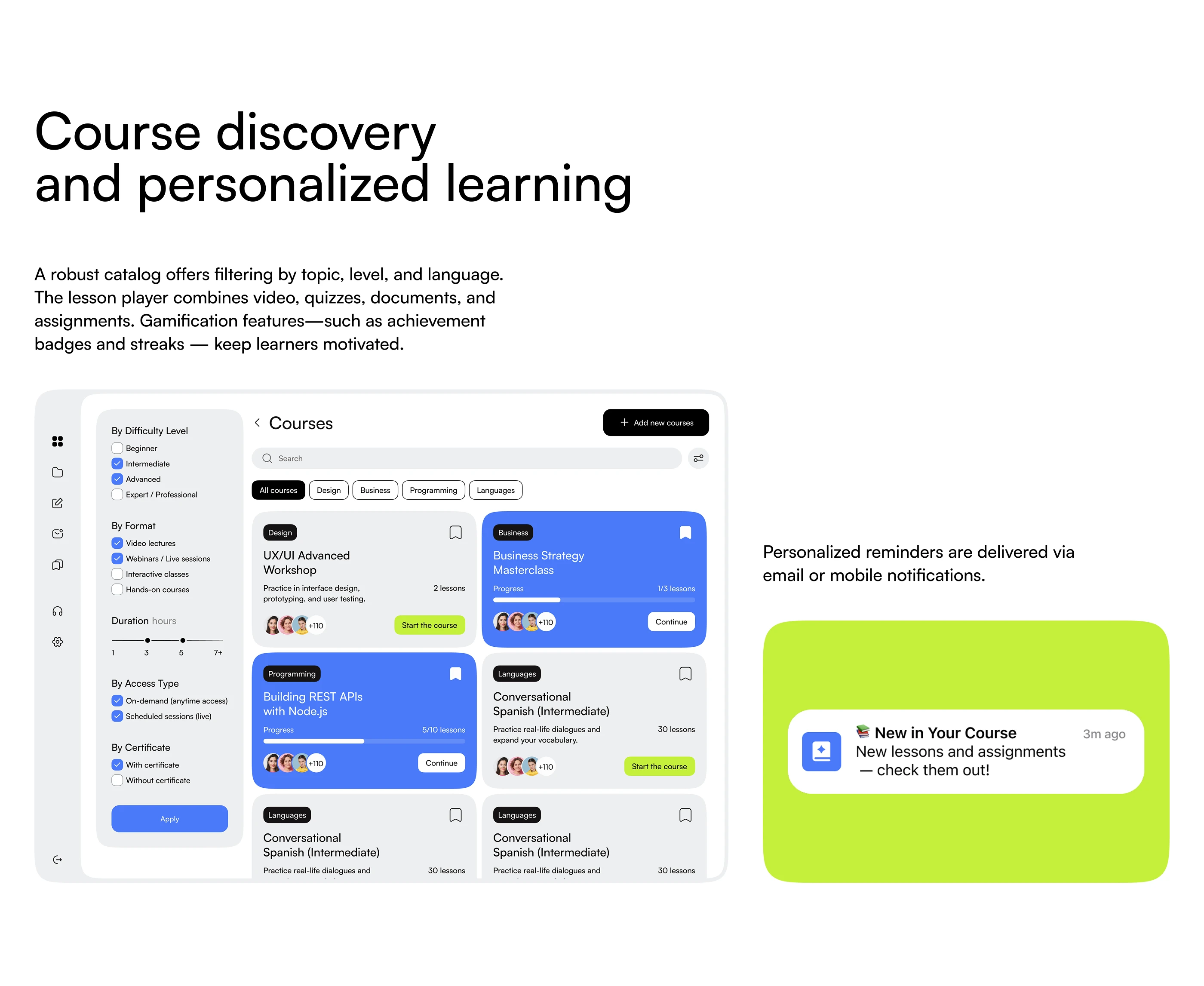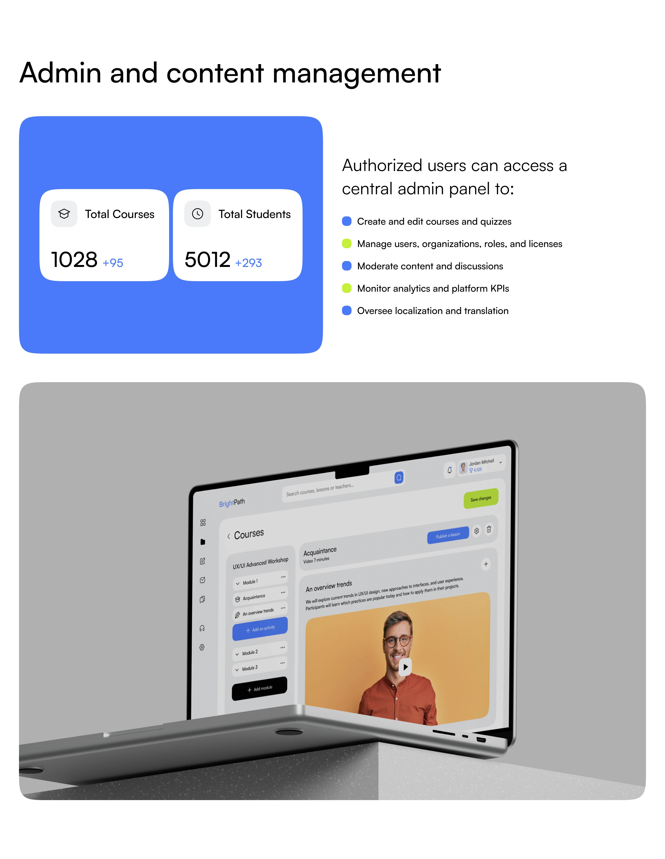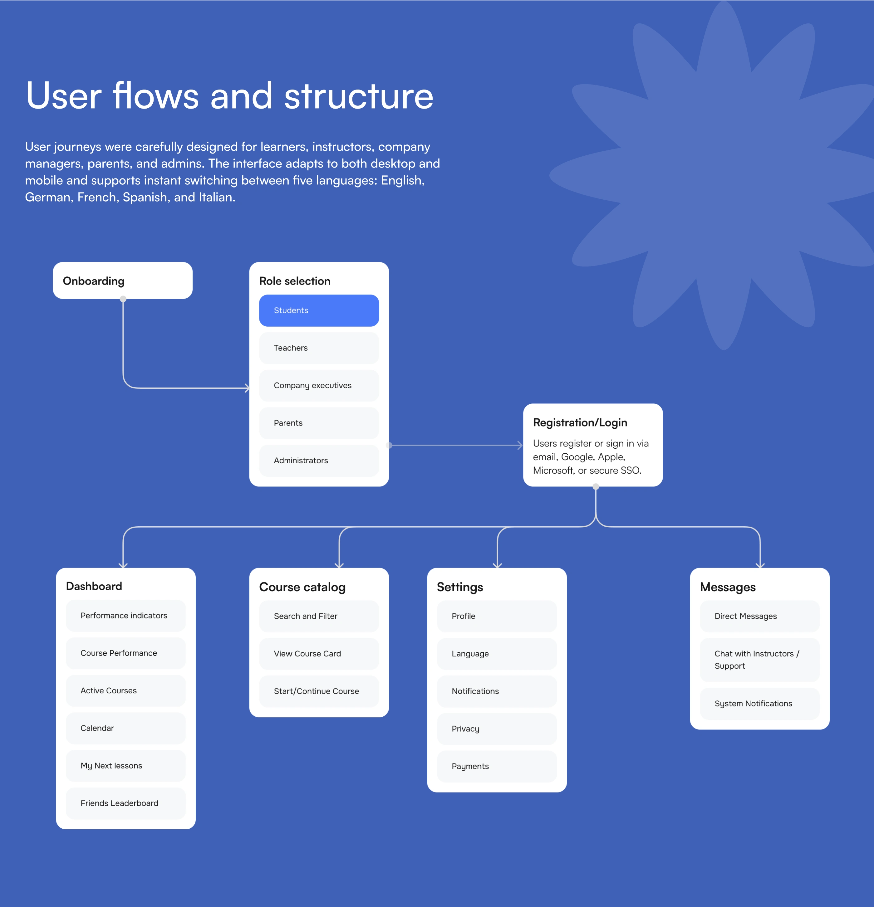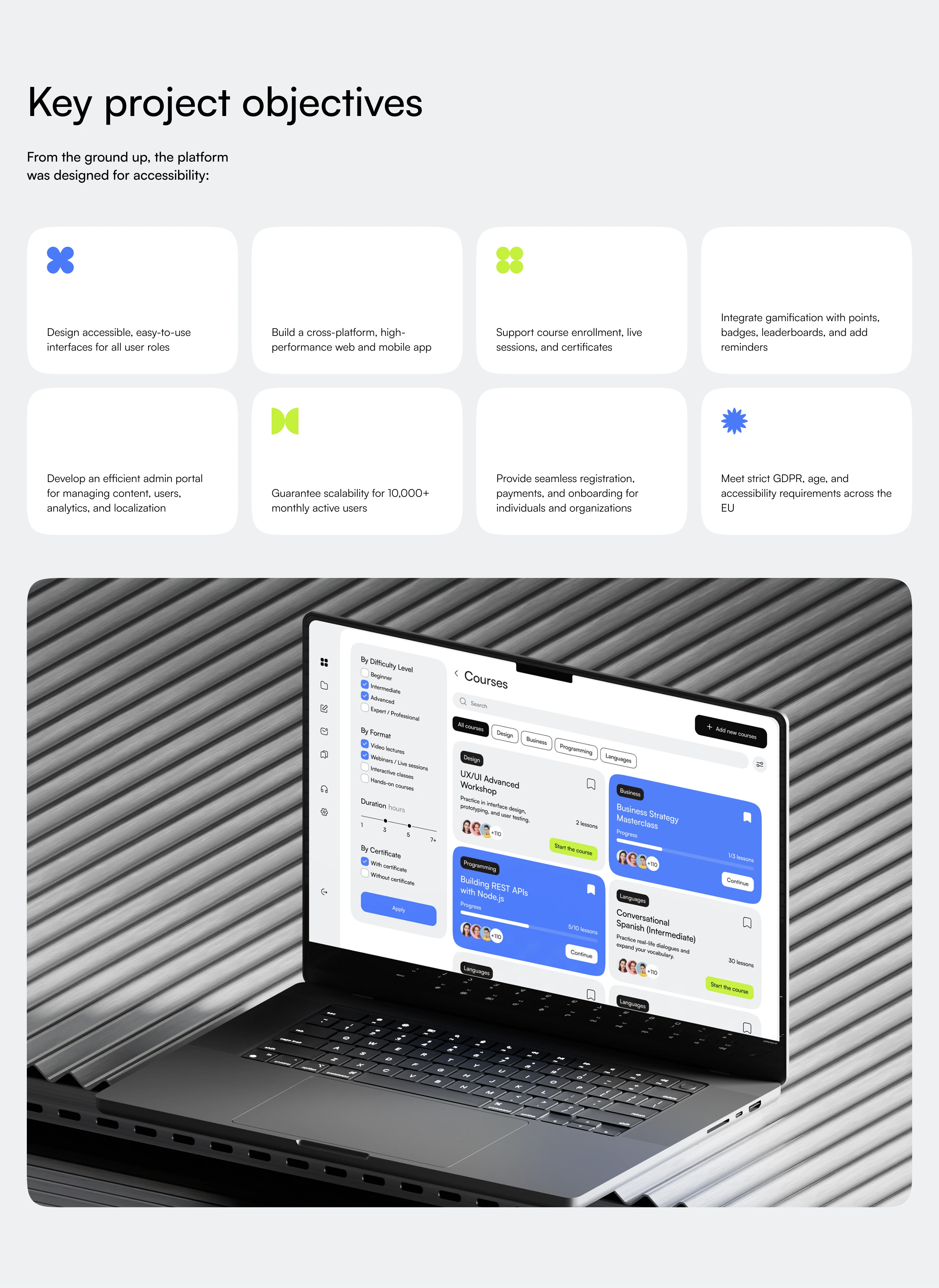Ronas IT proudly presents a cutting-edge GDPR-compliant EdTech learning platform designed for the diverse European market. Our comprehensive web and mobile app development delivers a rich online learning experience for B2C and B2B users. This real-time learning platform features self-paced courses, interactive live classes, advanced gamification, and robust progress tracking. With intuitive UI/UX design, seamless multilingual support, and strict accessibility compliance, the platform ensures an inclusive and engaging experience. Built with Next.js, Node.js, and React Native, it integrates secure payments and a custom admin panel, providing a scalable educational application that adheres to the highest standards of privacy and user experience.