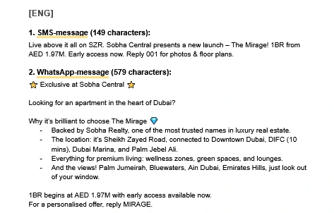 Crafted high-converting SMS and WhatsApp messages targeting leads in the UAE real estate segment, highlighting developer trust and lifestyle benefits.