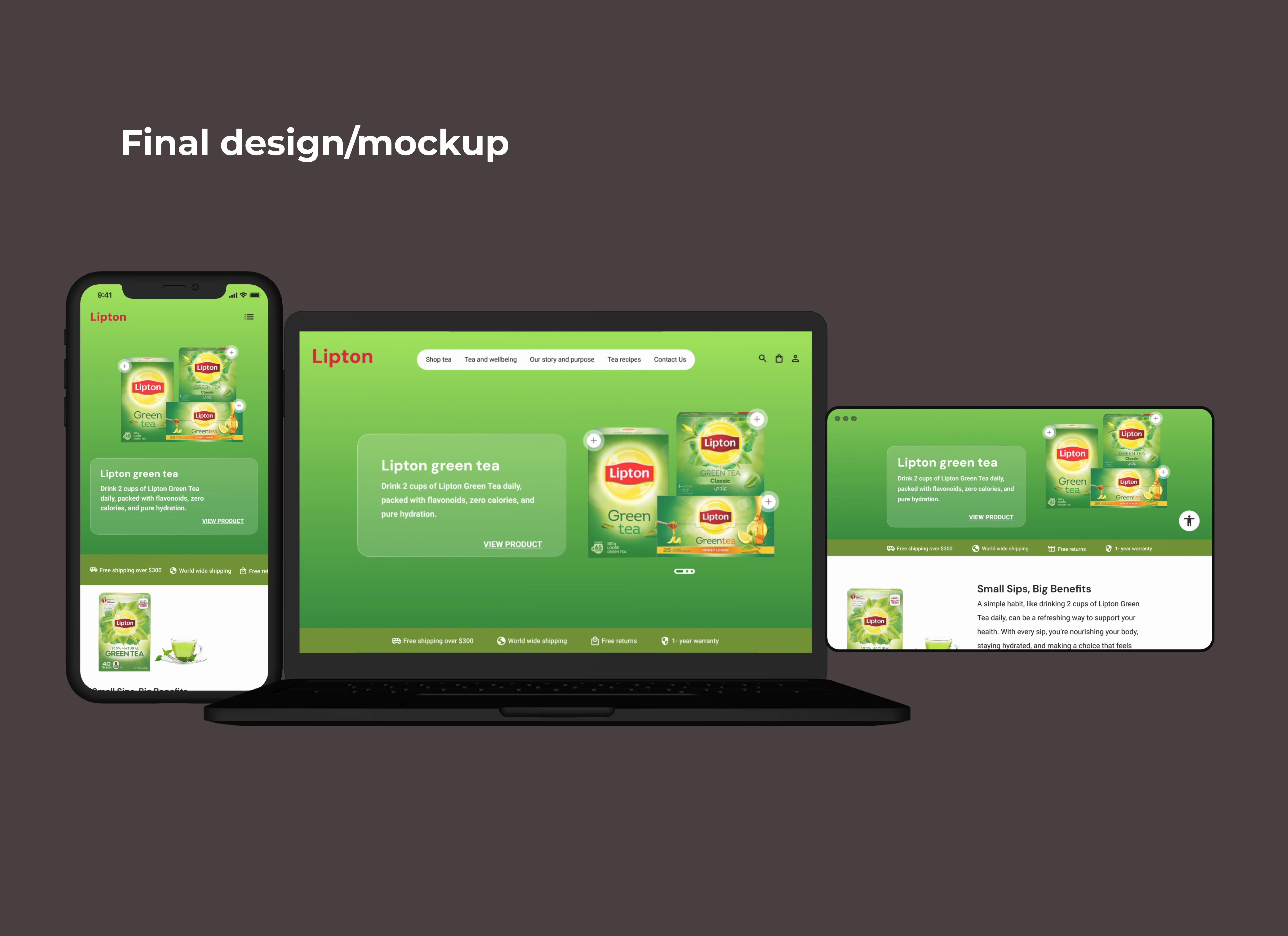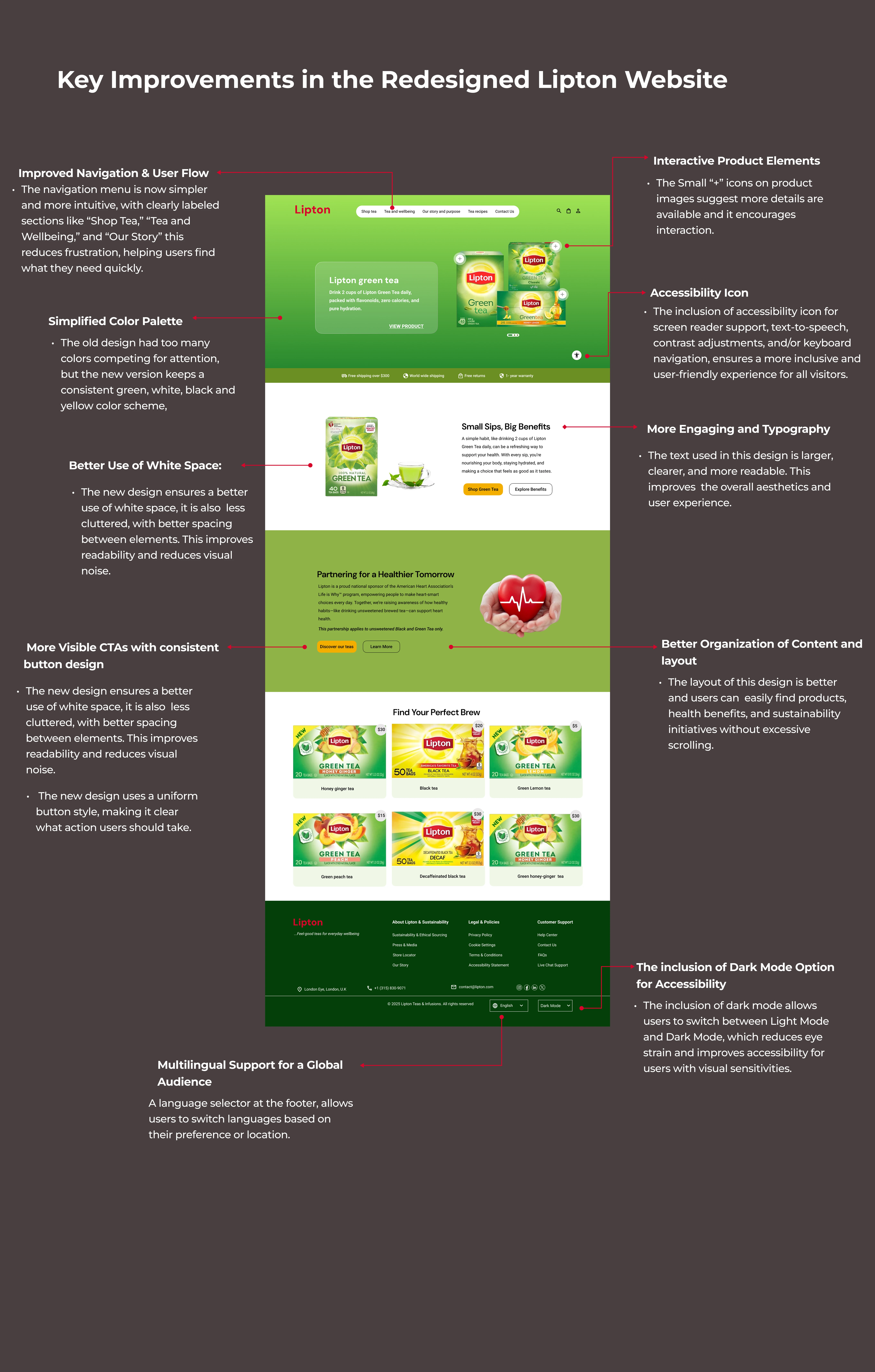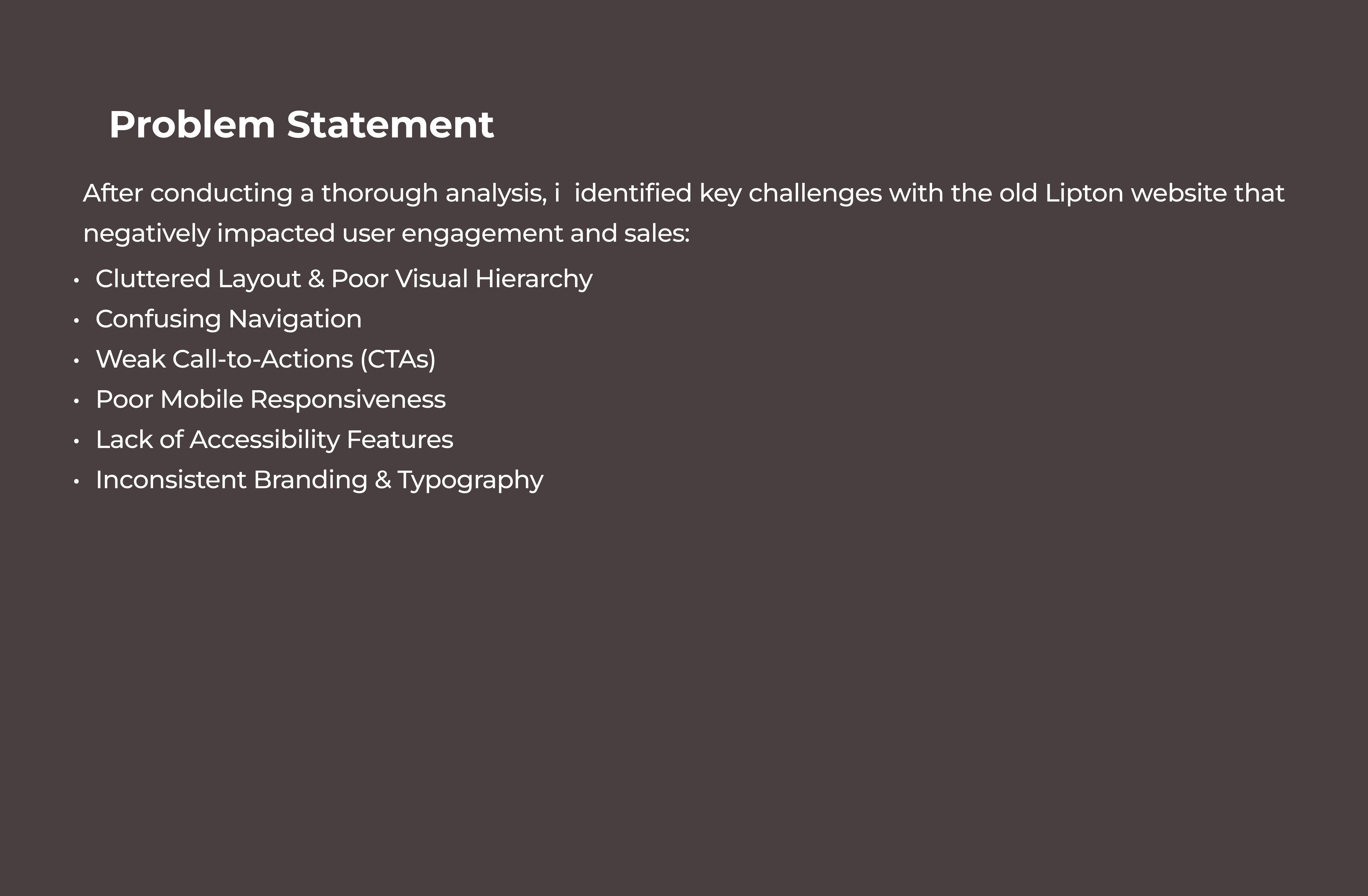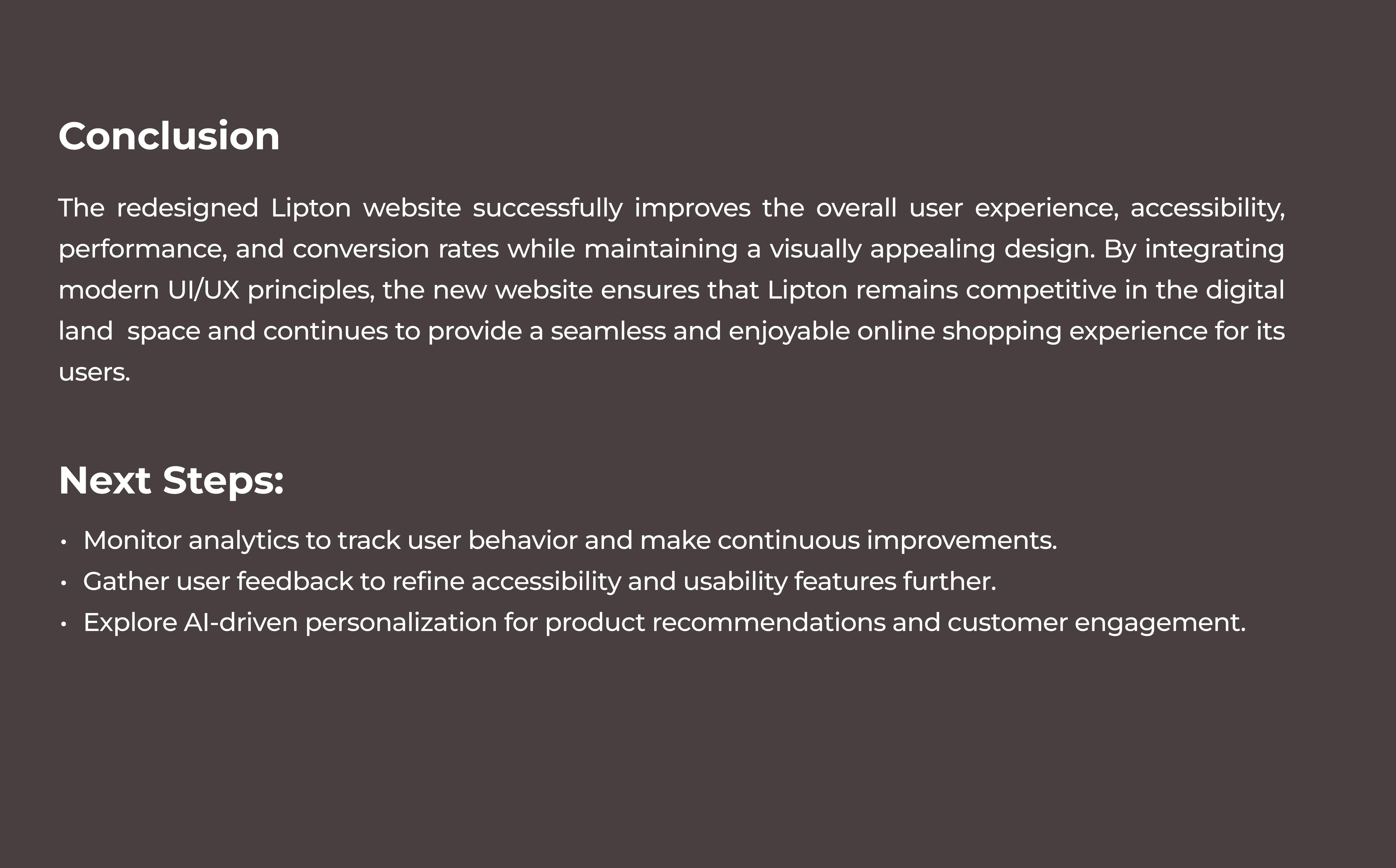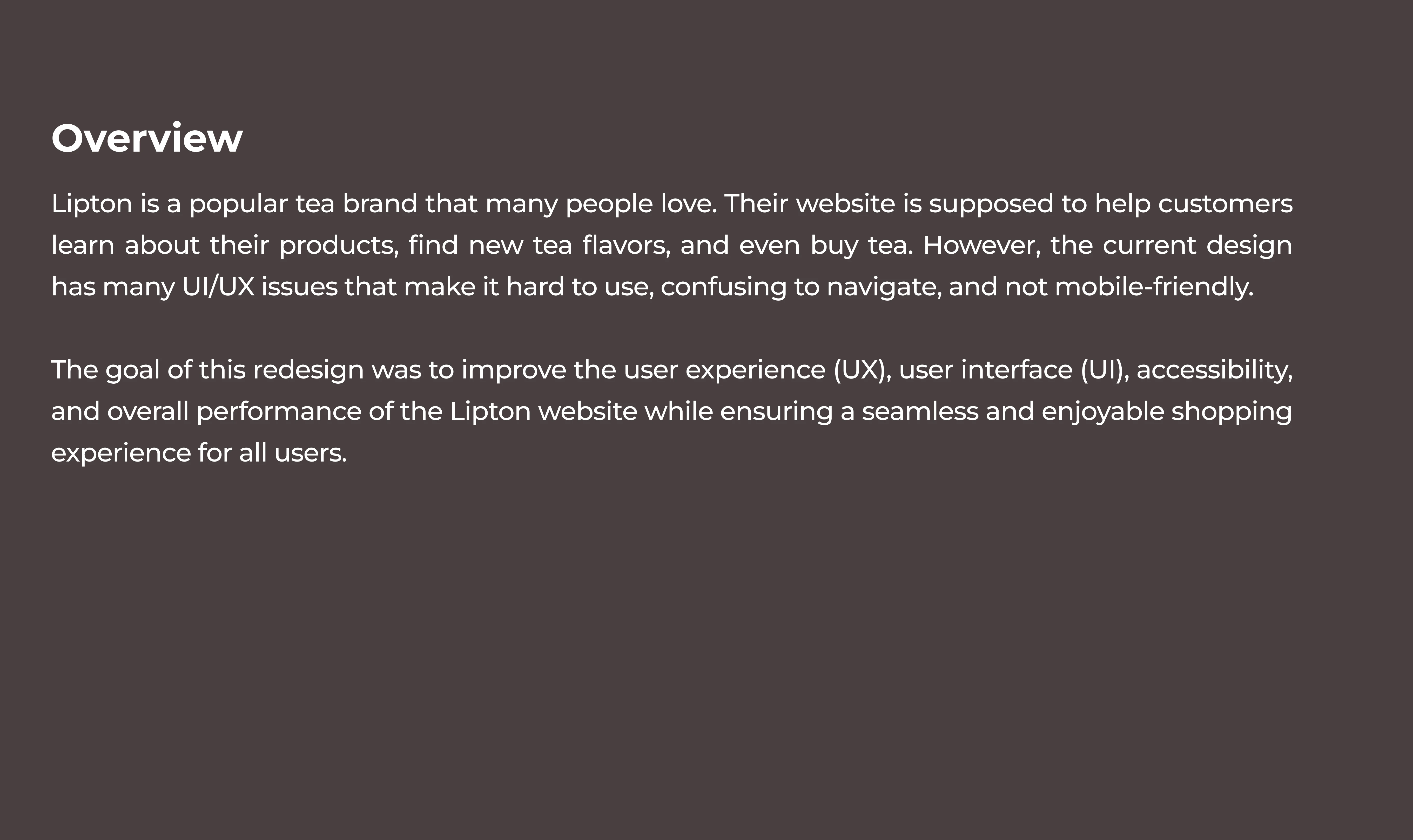 The goal of this redesign was to improve the user experience (UX), user interface (UI), accessibility, and overall performance of the Lipton website while ensuring a seamless and enjoyable shopping experience for all users.