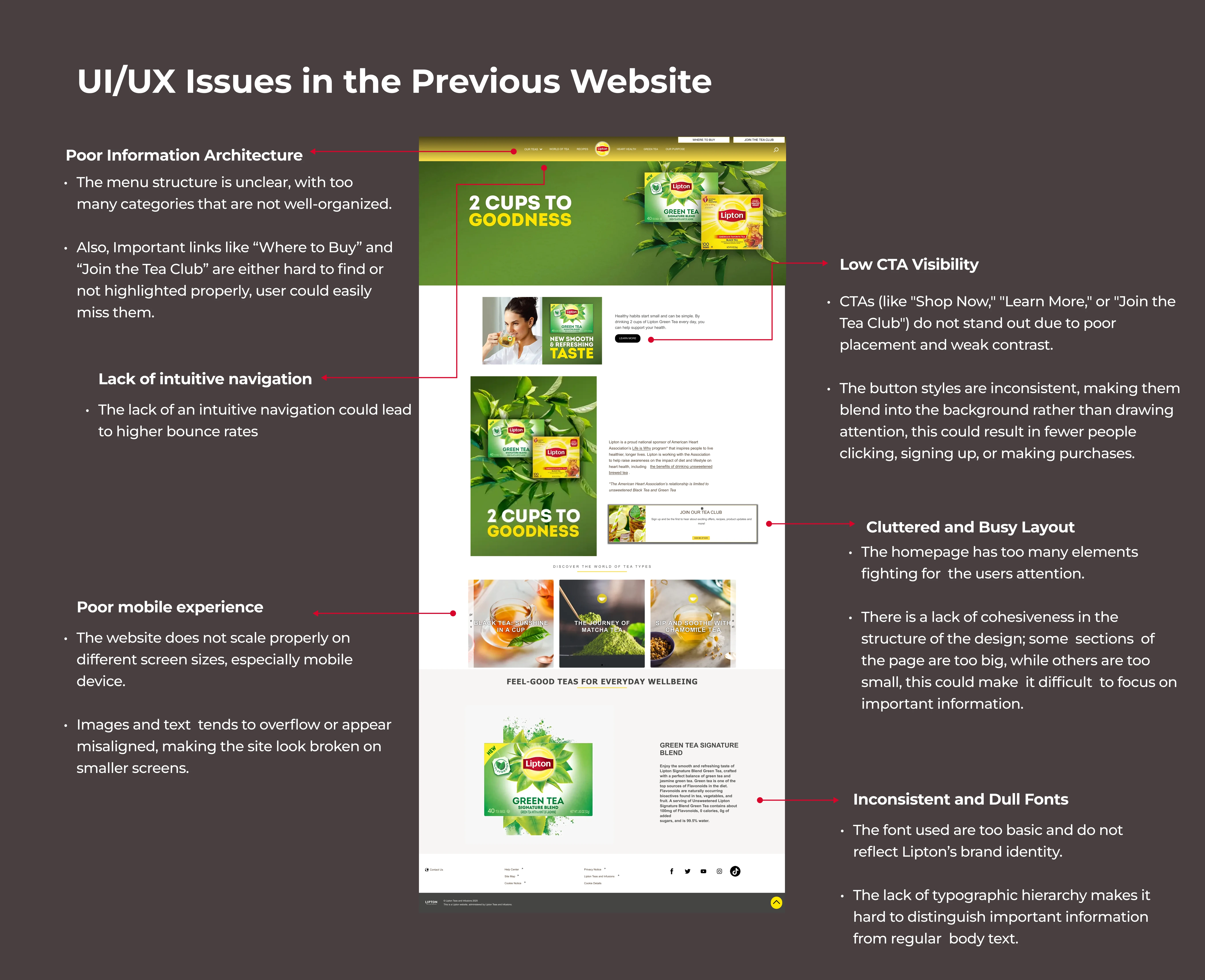 Lipton is a popular tea brand that many people love. Their website is supposed to help customers learn about their products, find new tea flavors, and even buy tea. However, the current design has many UI/UX issues that make it hard to use, confusing to navigate, and not mobile-friendly.