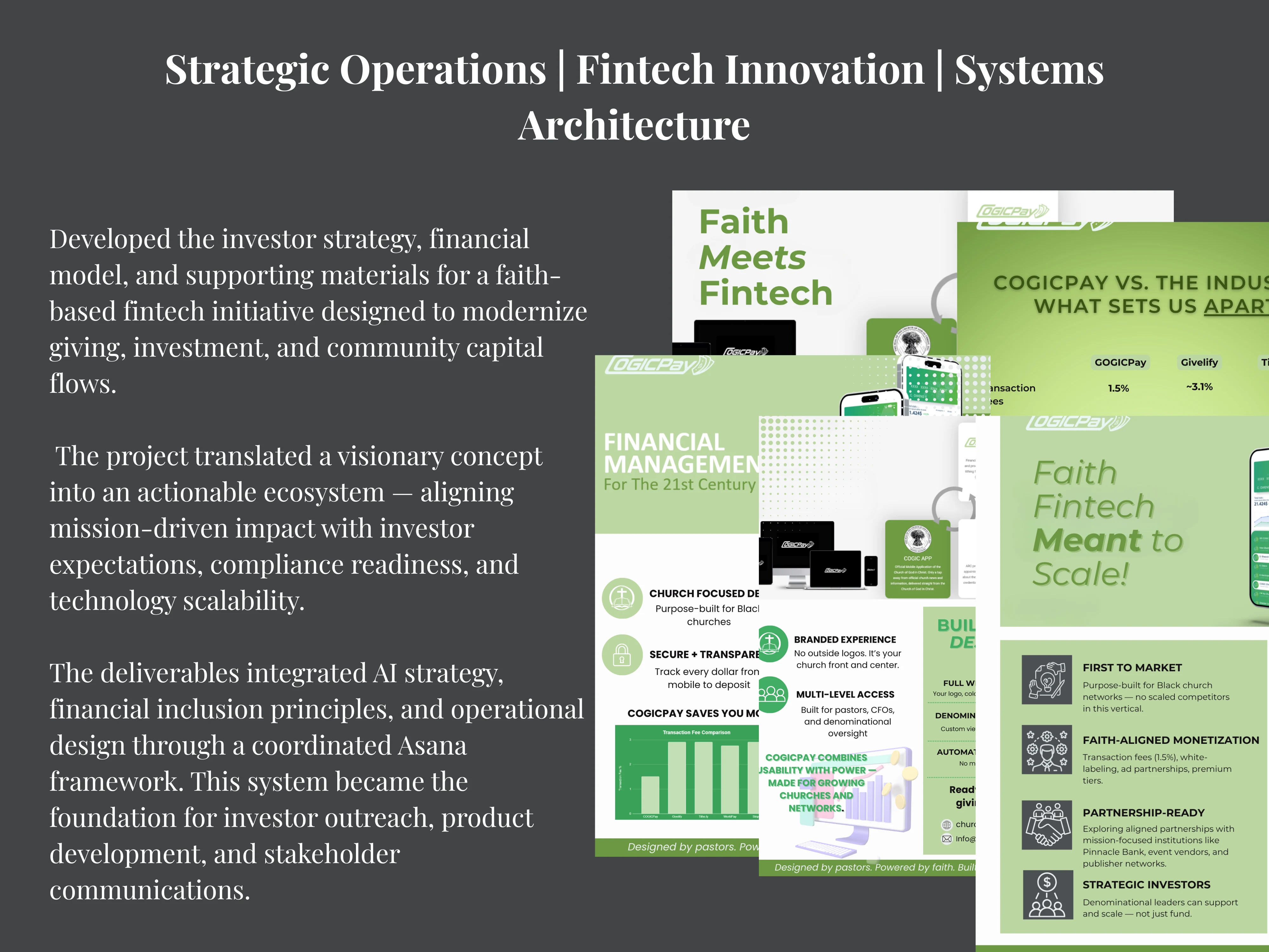 Developed investor strategy, financial model, and supporting materials for a faith based fintech initiative designed to modernize giving, investment, and beyond