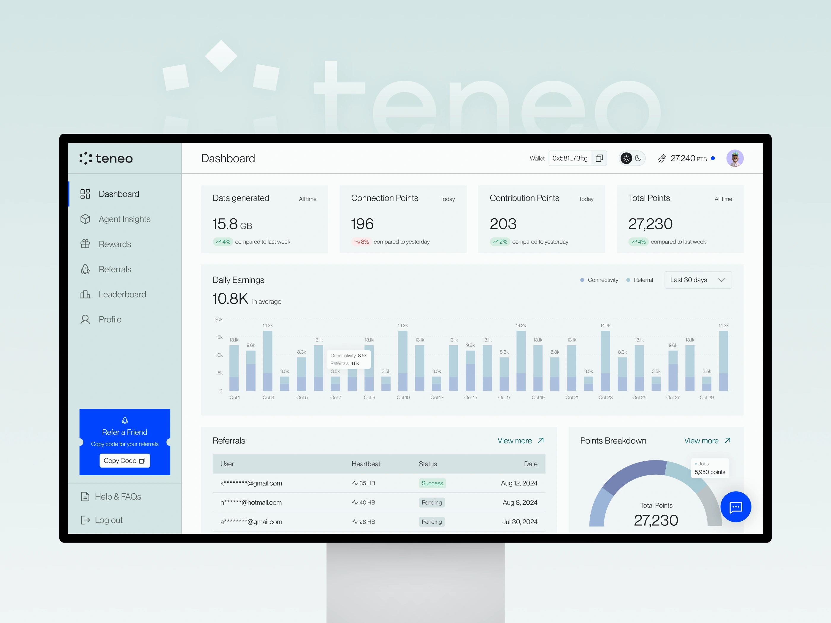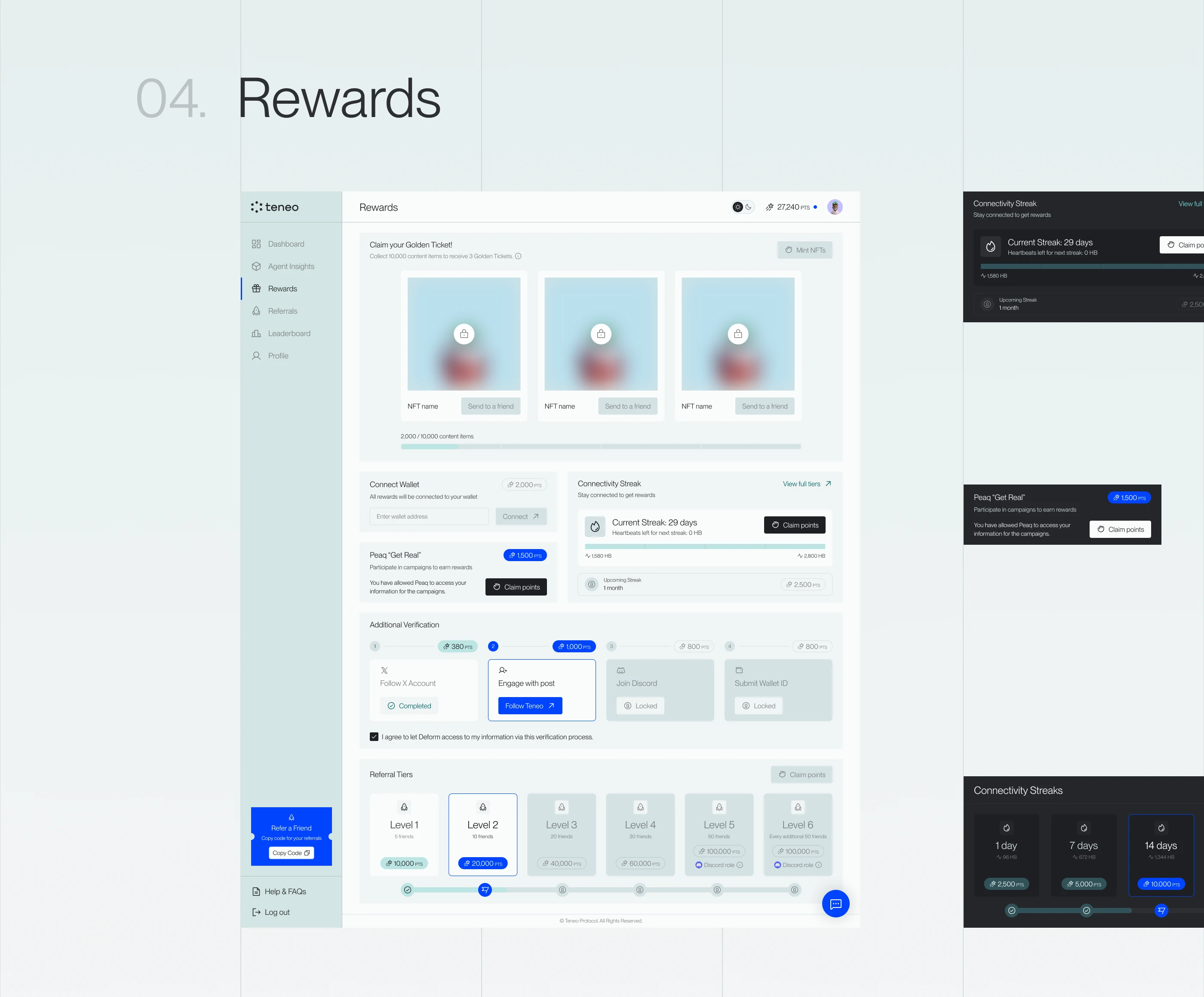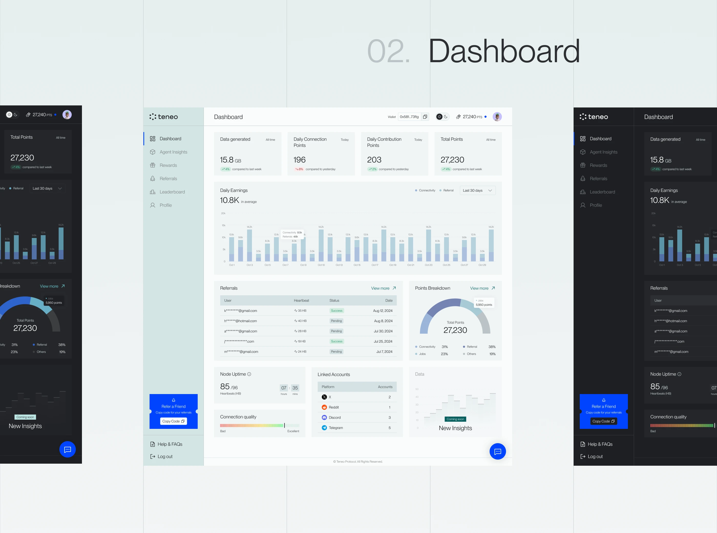 The final design brings together multiple features—activity tracking, rewards, referrals, leaderboards, and community tools—into a single, cohesive interface that feels clear, efficient, and aligned with Teneo’s vision.