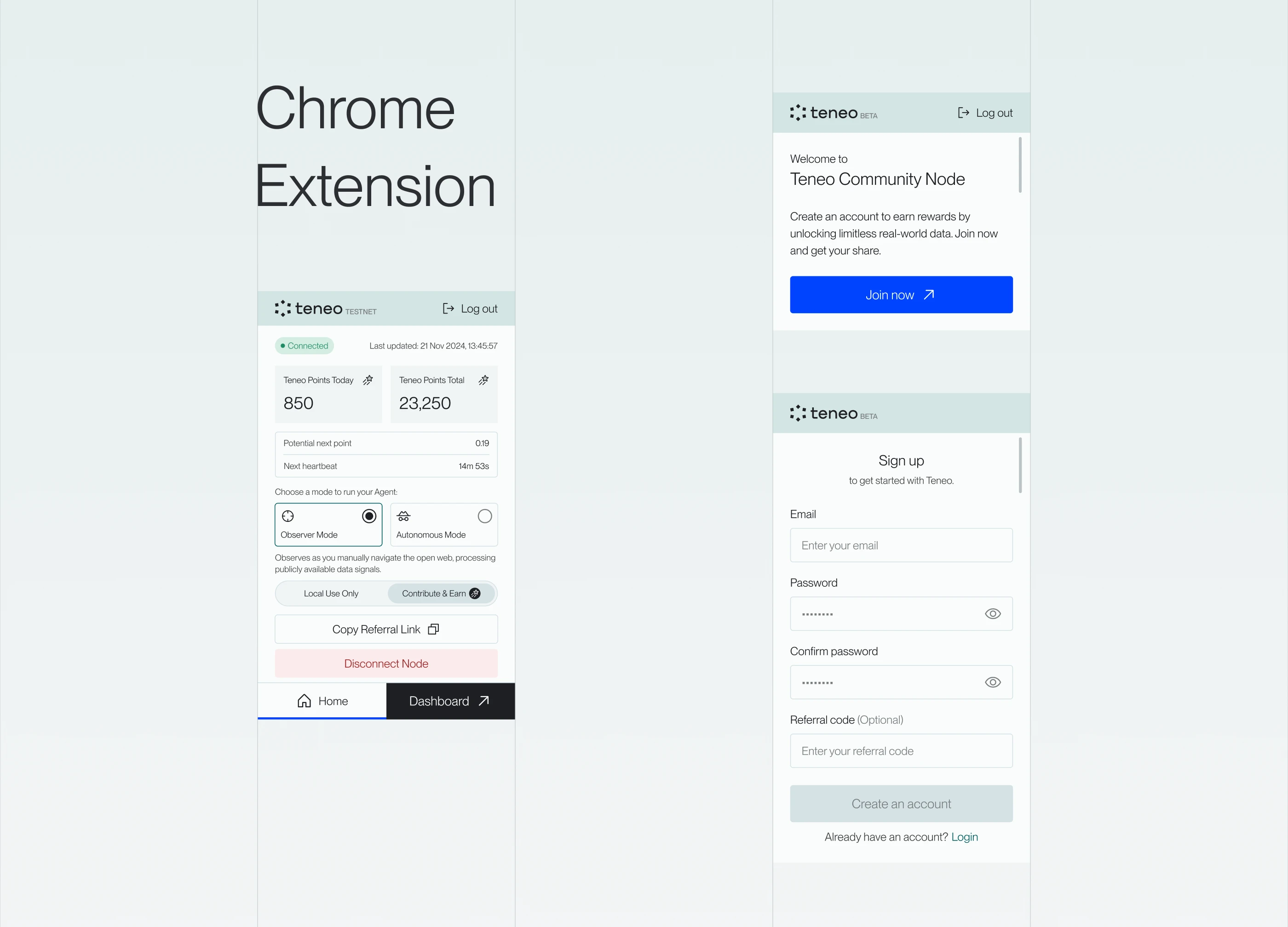In addition to the dashboard, I also designed the Teneo Chrome extension, ensuring a consistent experience between the browser-level agent and the core product.