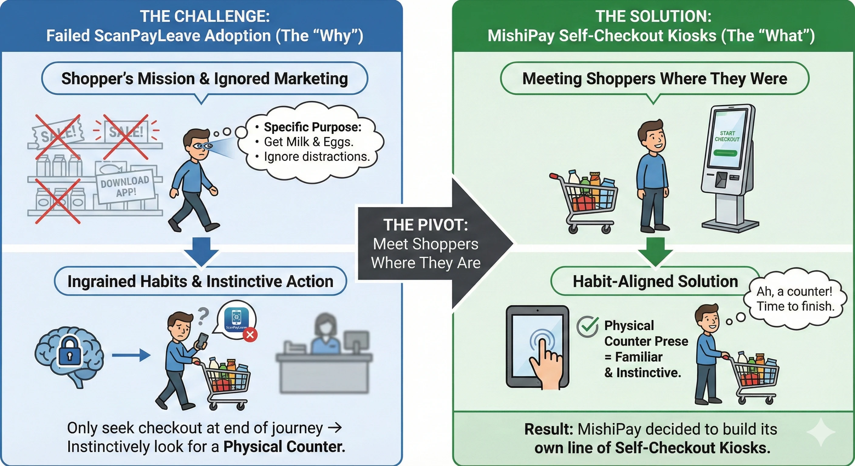 During my tenure as Director of Engineering and Engineering Manager at MishiPay, we faced a pivotal strategic decision in late 2021. At the time, MishiPay had a strong commitment toward the "Scan, Pay, Leave" model via Progressive Web Applications (PWA) because it offered a frictionless "Bring Your Own Device" (BYOD) experience for both retailers and shoppers. While the social distancing requirements of the COVID-19 pandemic significantly boosted digital adoption , we realized that adoption alone wasn't enough. Shoppers typically enter a store with a specific purpose, and even aggressive in-store marketing often fails to distract them from their mission. We observed that because of deeply ingrained habits, shoppers only seek out a checkout solution once they have already decided to finish their journey—at which point they instinctively look for a physical counter. To meet shoppers where they were, MishiPay decided to build its own line of Self-Checkout Kiosks.