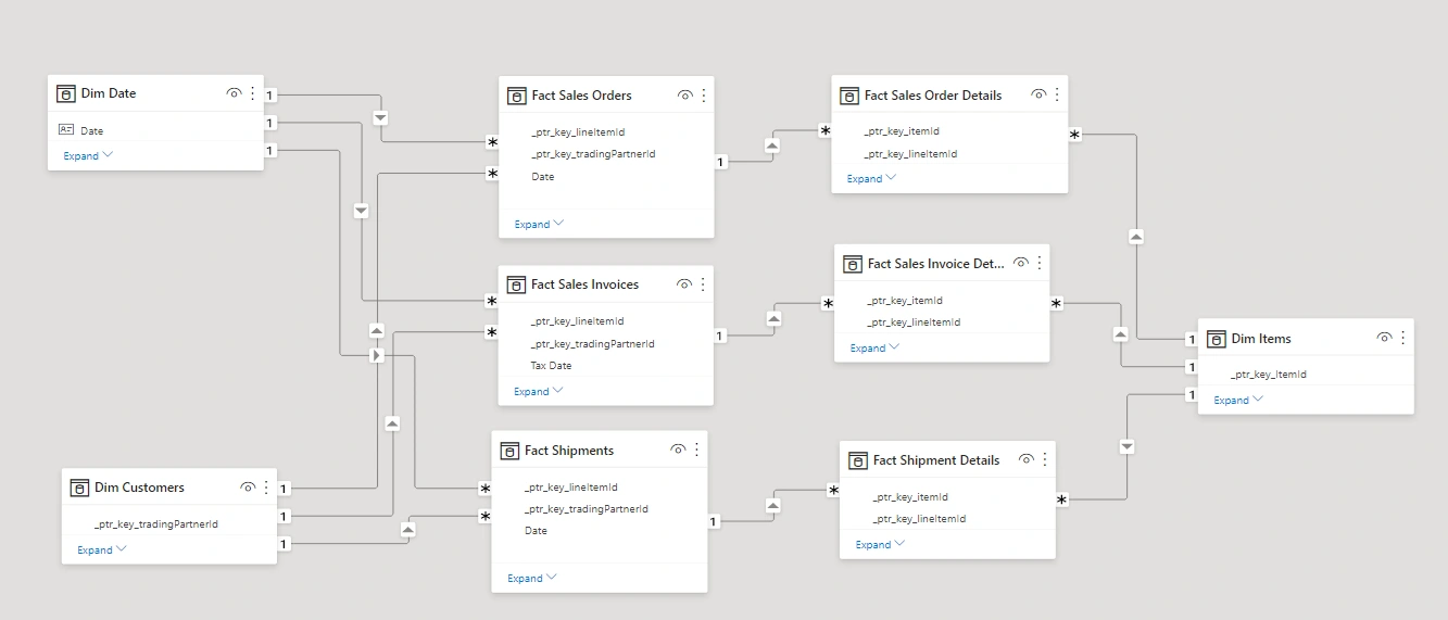 Dim CustomersDim DateDim ItemsDim OwnersDim RMA Return ReasonDim RMA TypesDim SitesFact Sales Order, Fact Sales Order DetailsFact Cash Sales, Fact Cash Sales DetailsFact Customer Credit Notes, Fact Customer Credit Note DetailsFact Customer Payments, Fact Customer Payment DetailsFact Customer Refunds, Fact Customer Refund DetailsFact RMAs, Fact RMA DetailsFact Sales Invoices, Fact Sales Invoice DetailsFact Shipments, Fact Shipment DetailsFact Purchase Orders, Fact Purchase Order DetailsFact Purchase Invoices, Fact Purchase Invoice DetailsFact Stock Track sales_order_number, invoice_date, and line_item_quantity were renamed to their exact frontend labels (e.g., "Sales Order #", "Invoice Date", "Qty")Fact Sales Orders with its related dimensions).Items, Customers, and Dates.