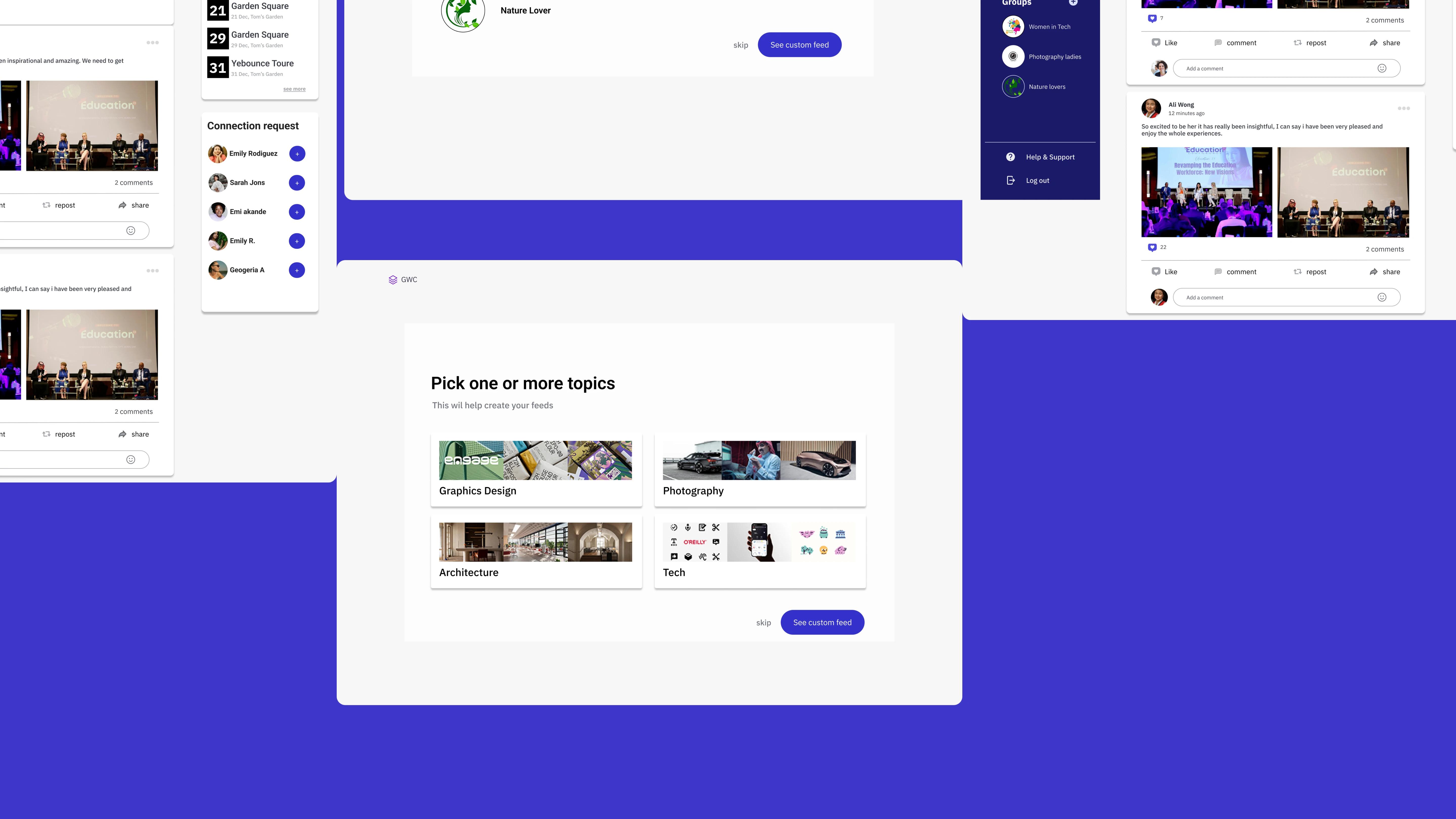 Created a clean social networking dashboard with activity feeds, messaging, groups, and event updates to improve user interaction and community engagement.
