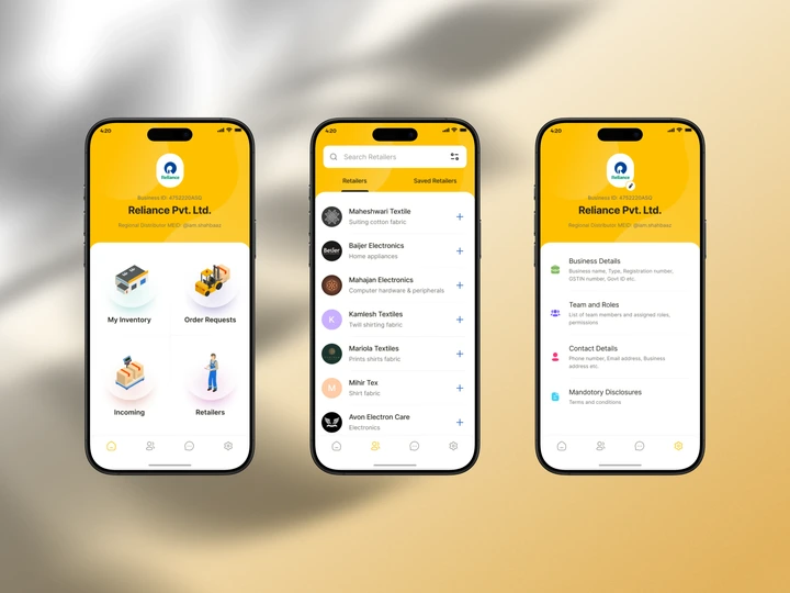 Designed a scalable B2B commerce app streamlining inventory, retailer management, and order workflows with a clean, mobile-first UX.
