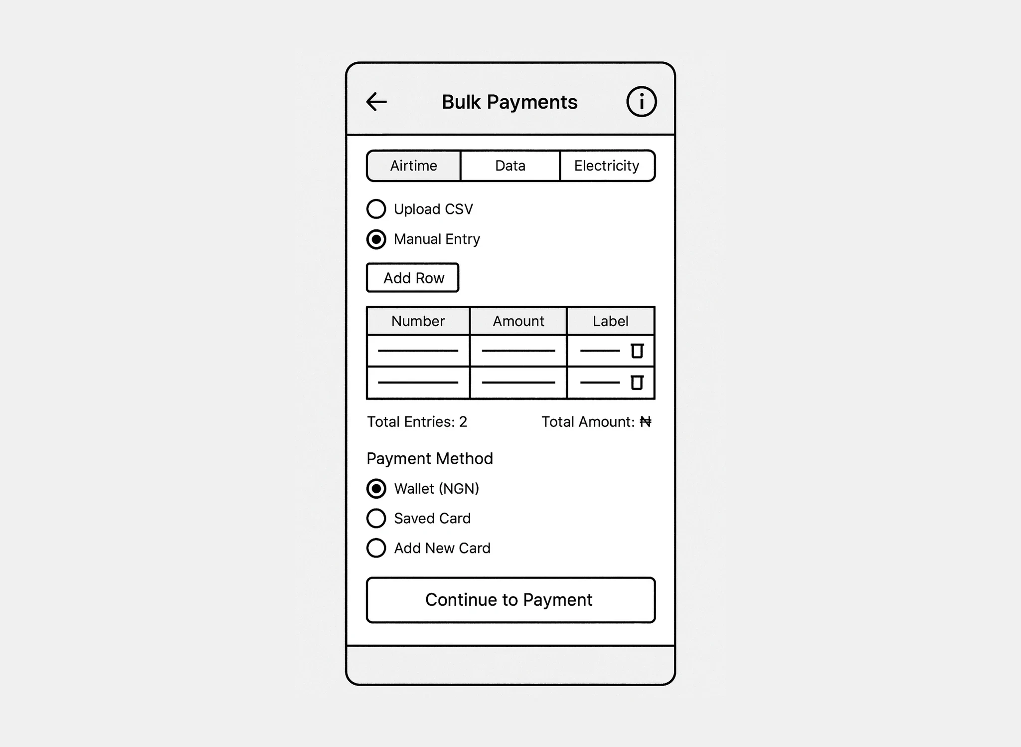Bulk – Designed for users who wanted to perform bulk purchases of utilities such as airtime, data, or electricity for multiple recipients at once.