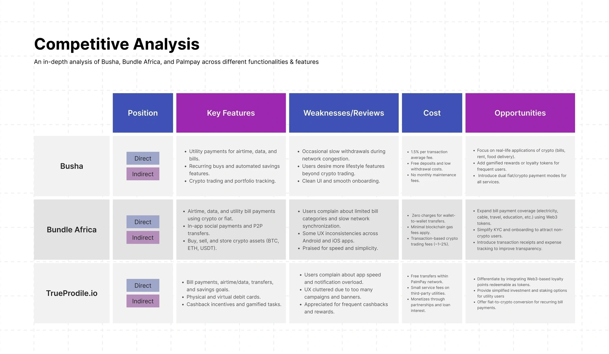 Competitive Analysis: I analyzed similar fintech and Web3 platforms like Bundle, Binance Pay, and PalmPay, identifying their key features and shortcomings: