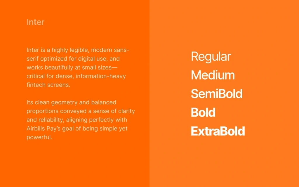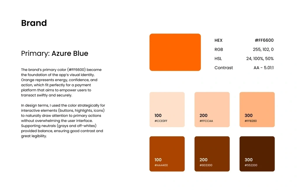 The brand’s primary color (#FF6600) became the foundation of the app’s visual identity. Orange represents energy, confidence, and action, which fit perfectly for a payment platform that aims to empower users to transact swiftly and securely.